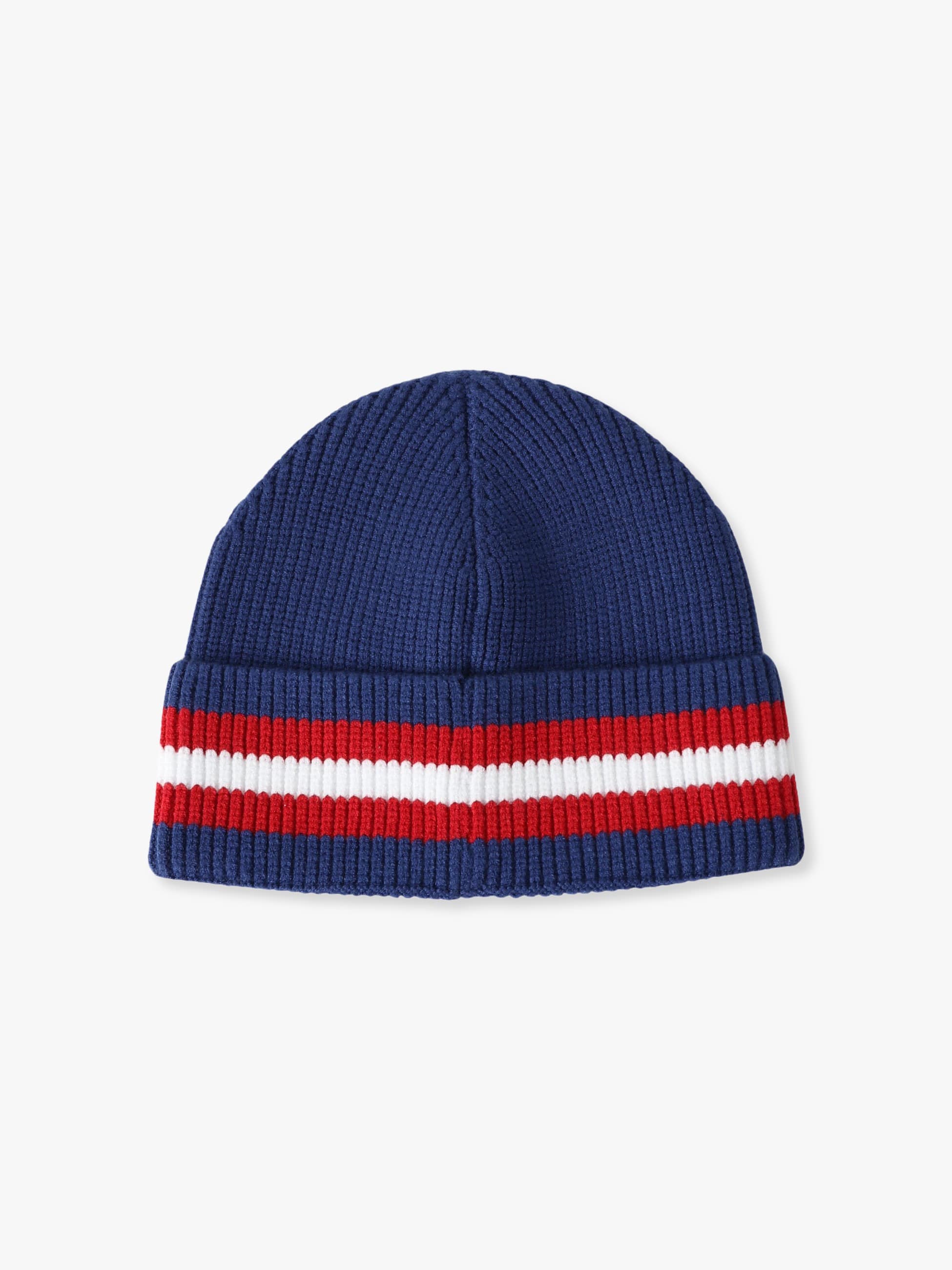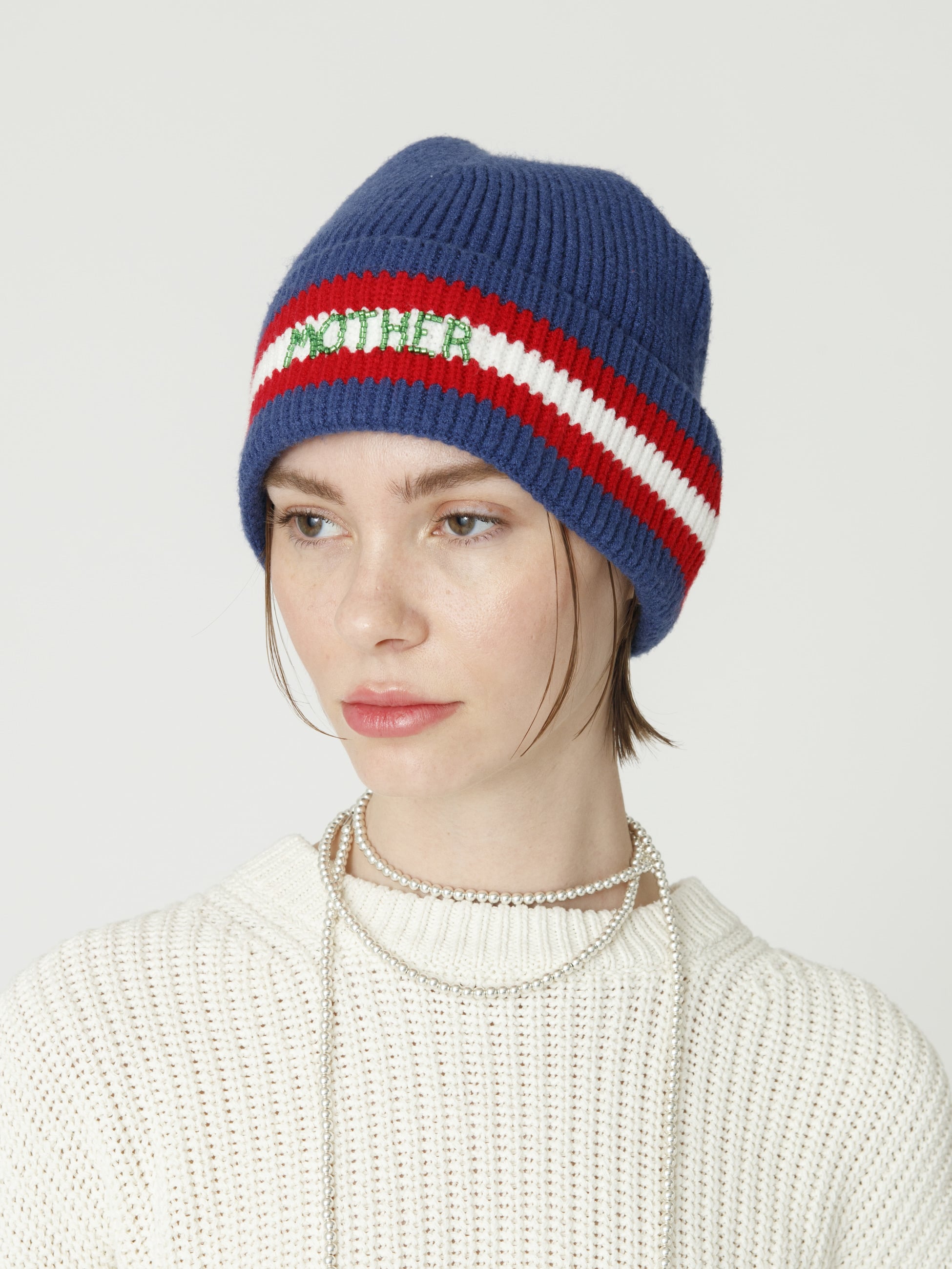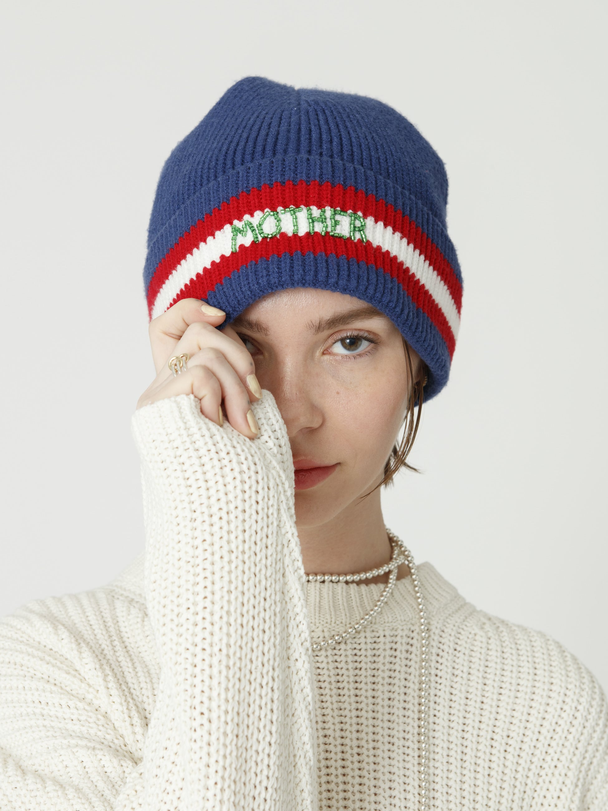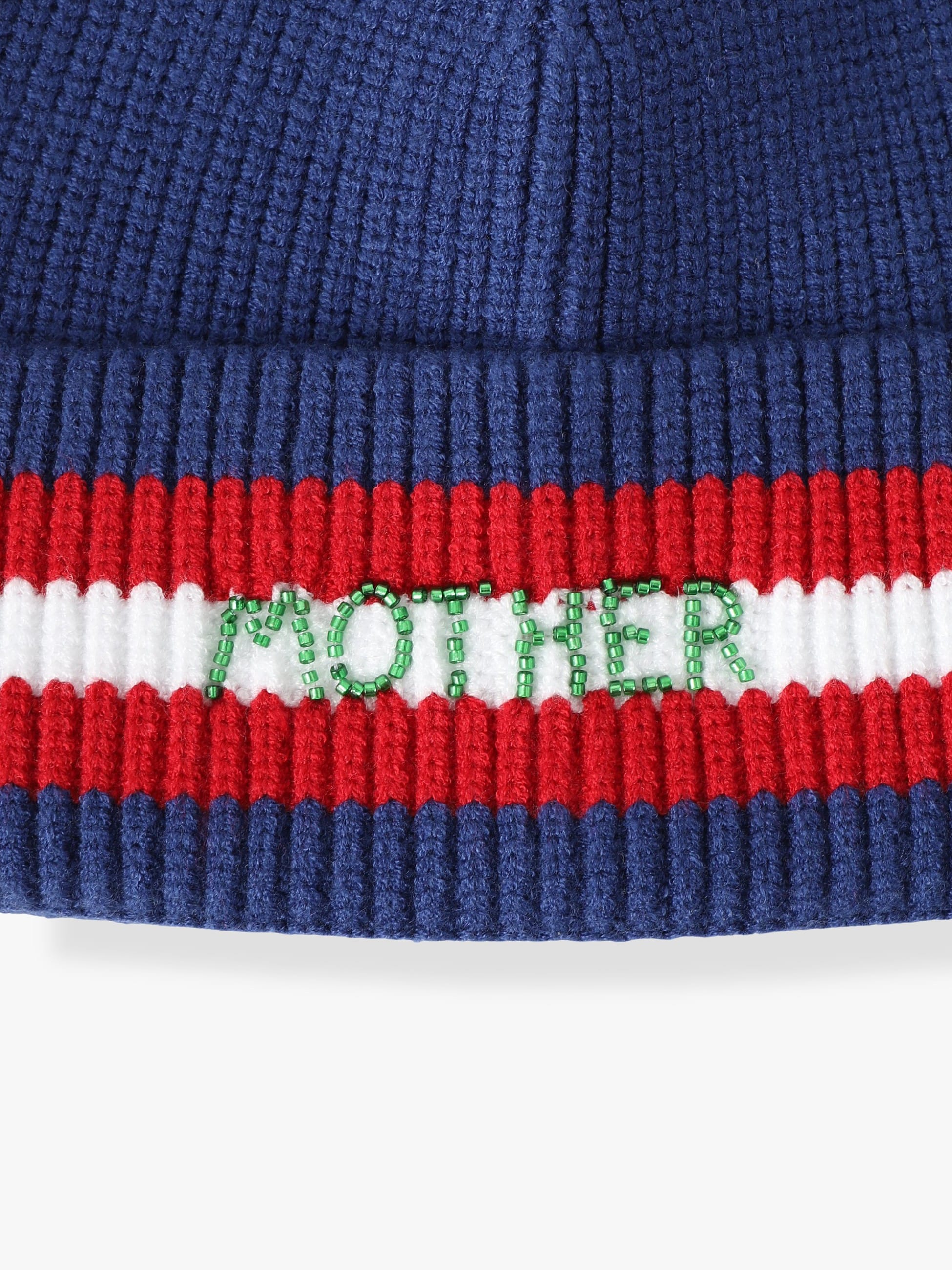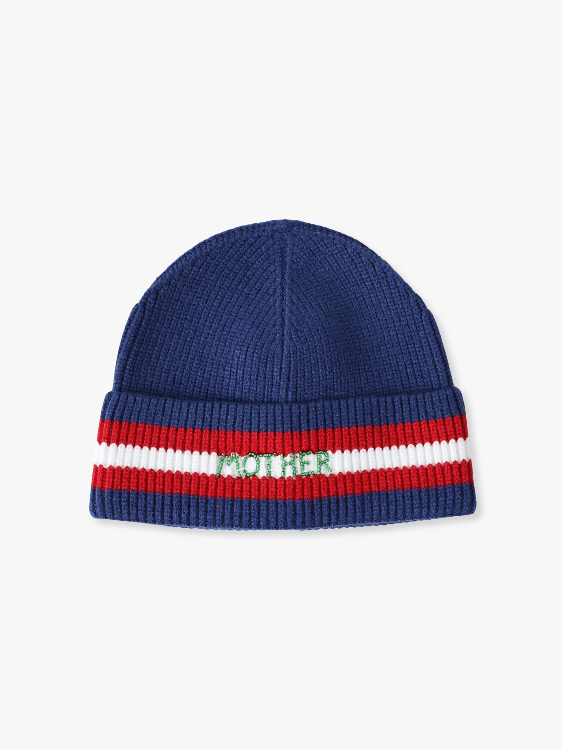 - リブ編みのビーニーは、ネイビーに赤と白のストライプが映え、フロントには「MOTHER」のビーズ刺繍があしらわれています。心地よくフィットし、コーディネートのポイントとしてもおすすめです。