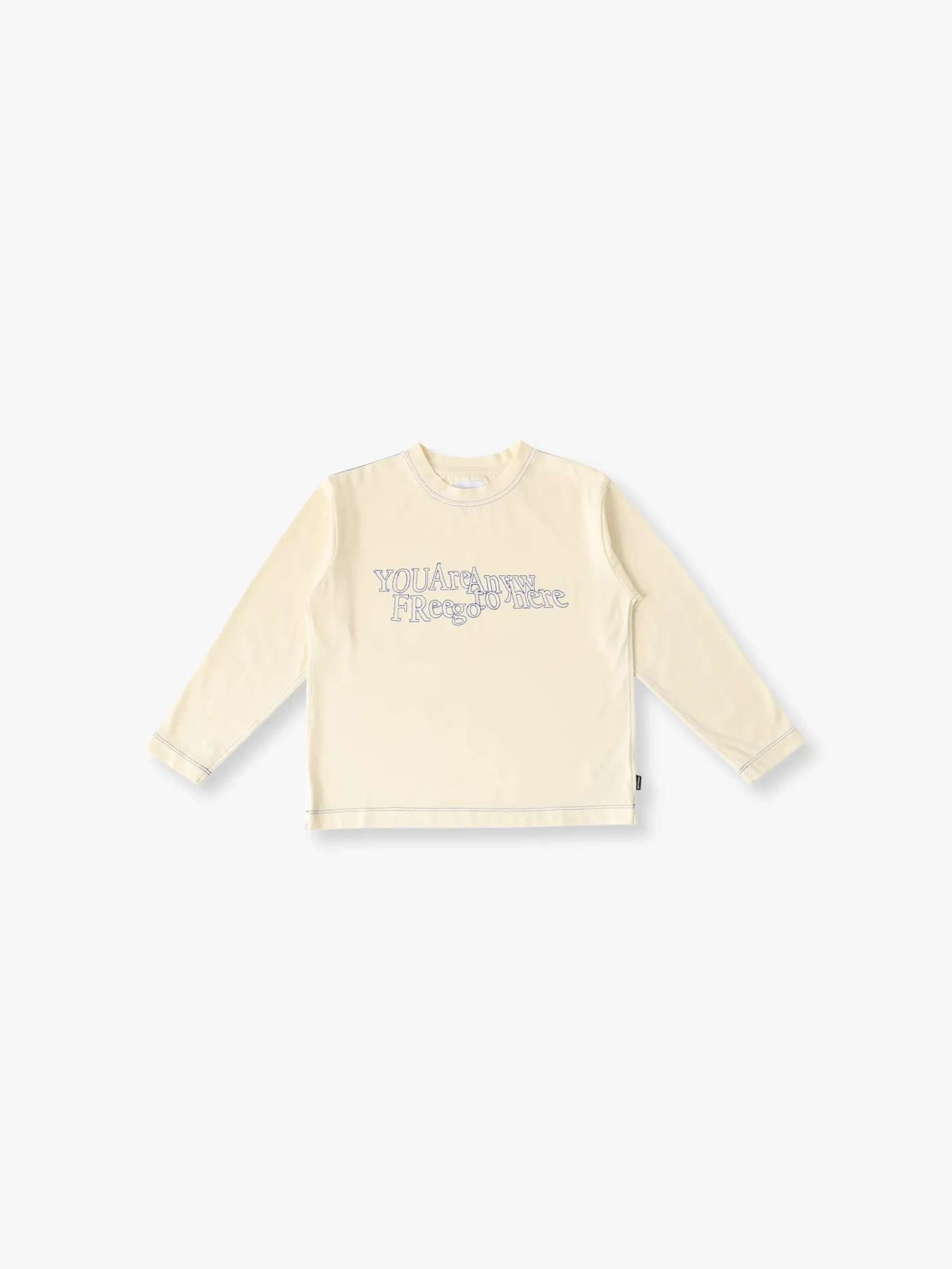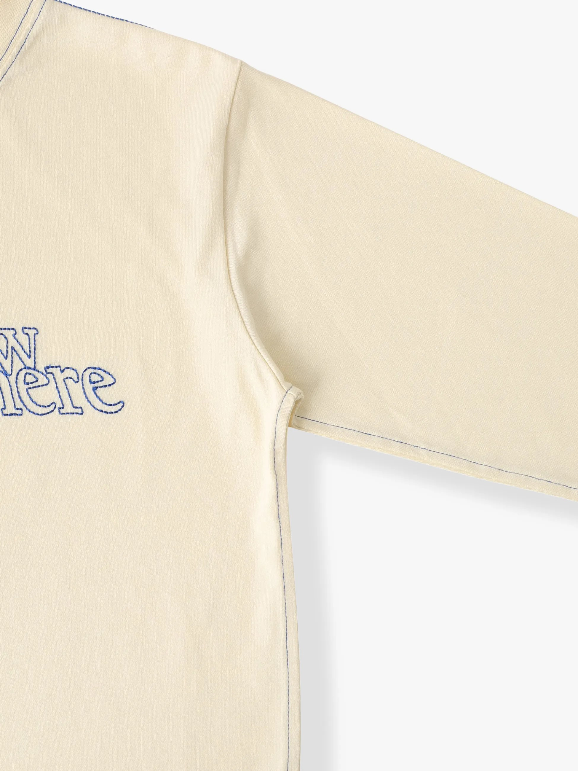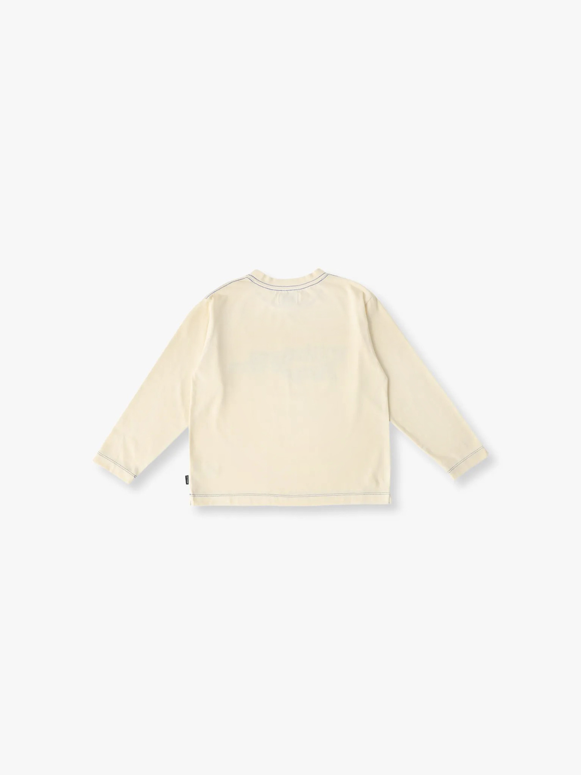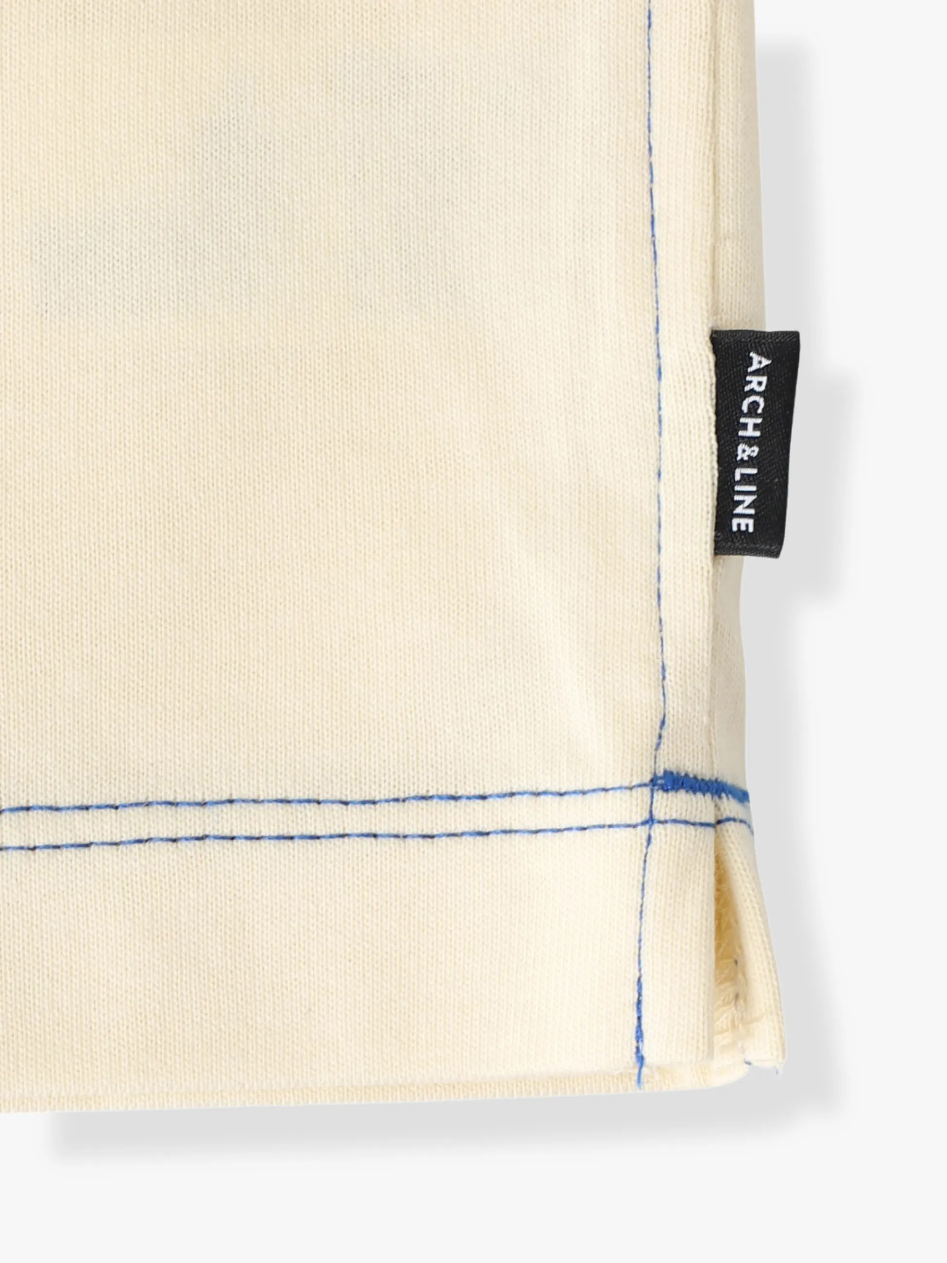 淡いクリームカラーに、ブルーの刺繍とステッチが映えるロングスリーブTシャツは、シンプルながらもこなれた印象を与え、日常のスタイルにさりげなく彩りを添えてくれます。通気性の良いオーガニックコットンを使用しているため、肌に優しく快適な着心地が続きます。