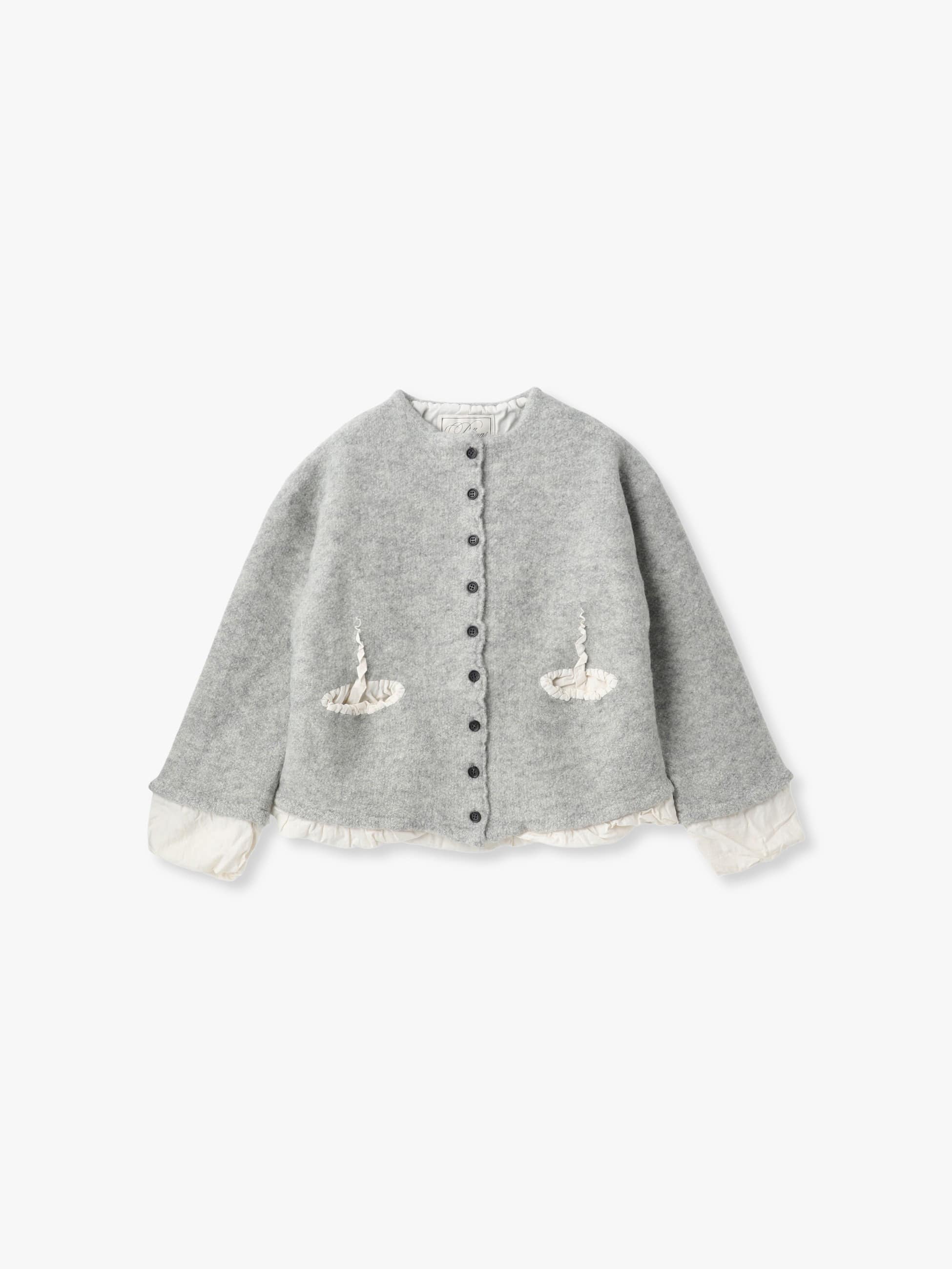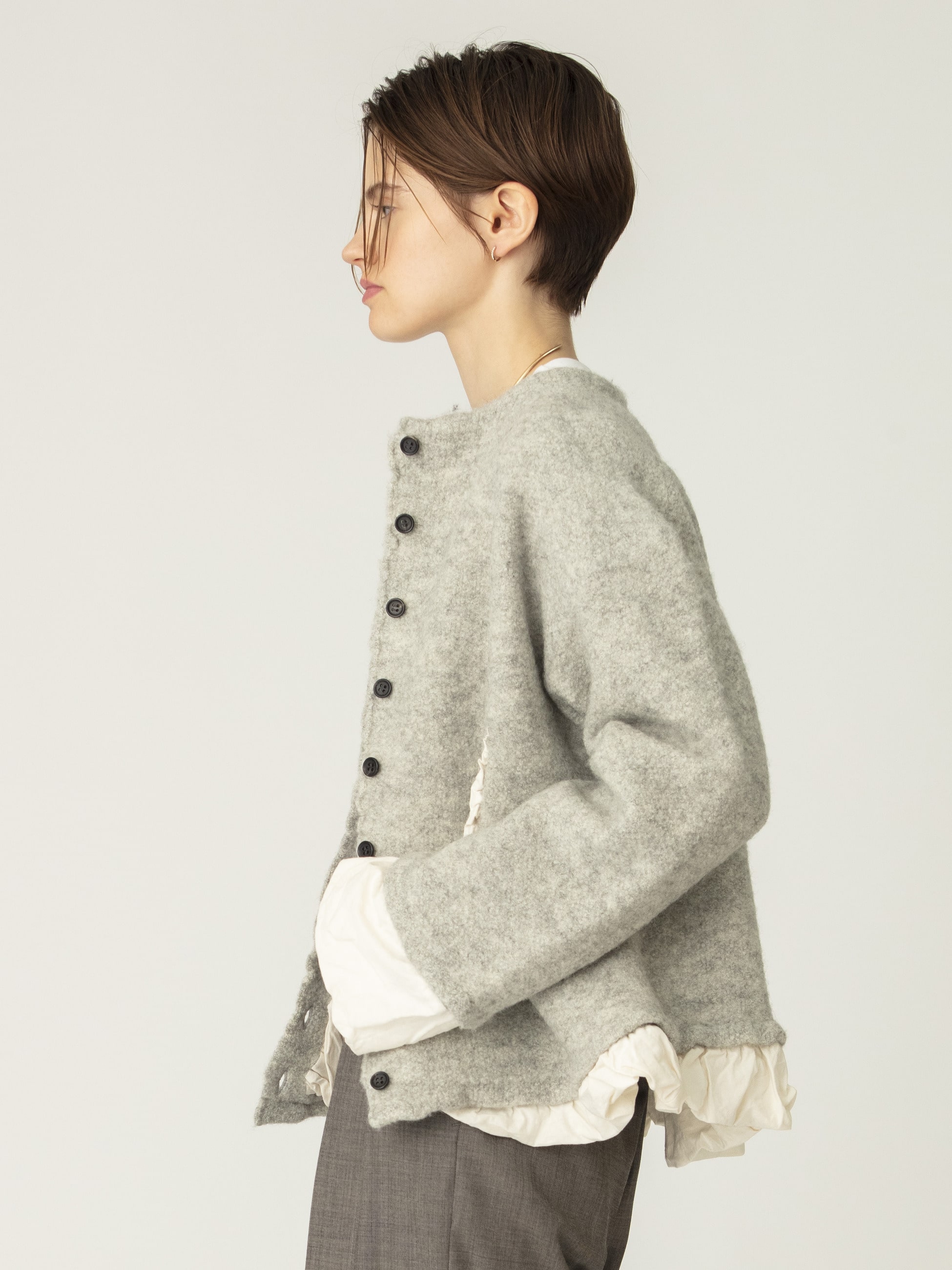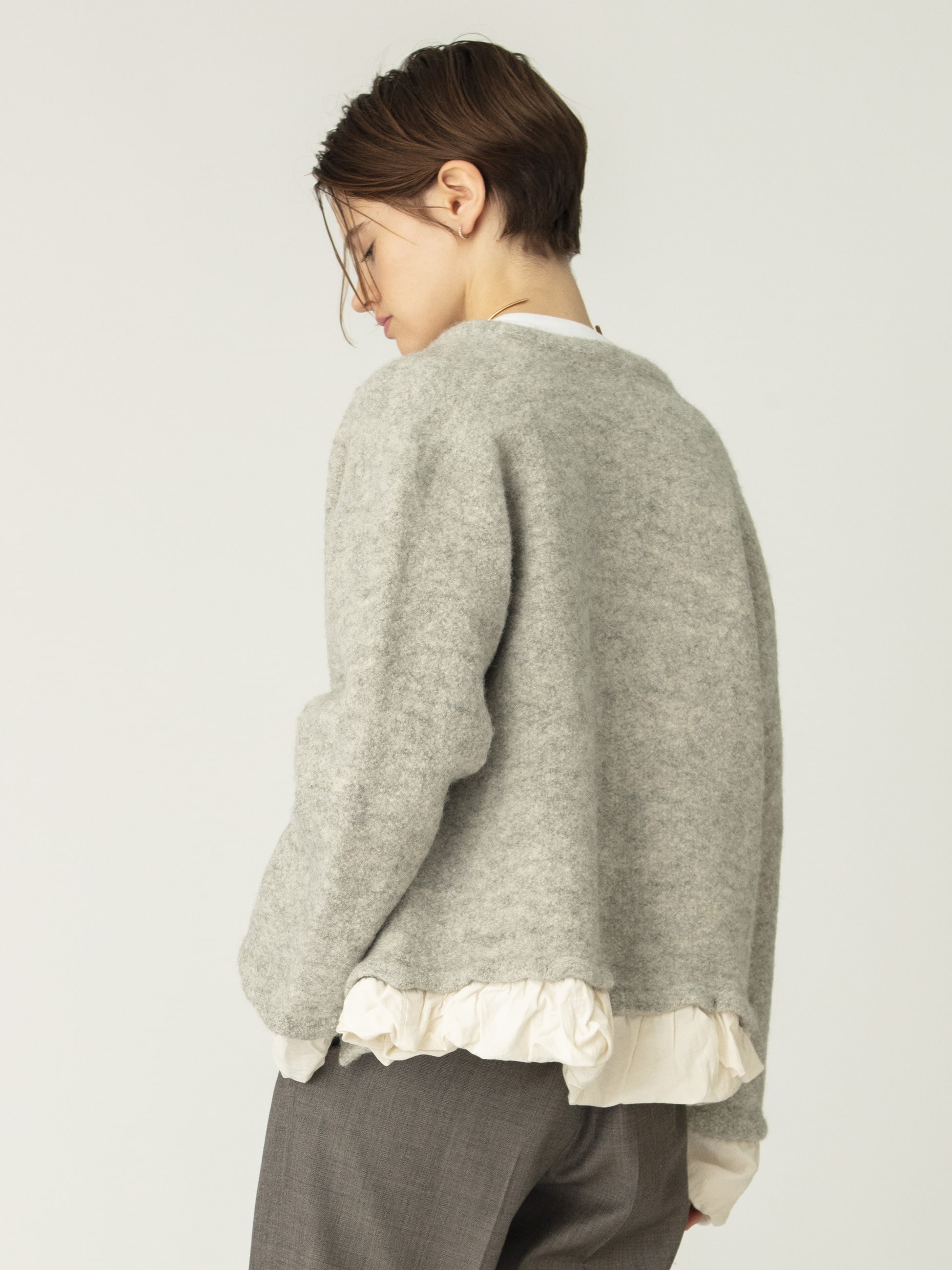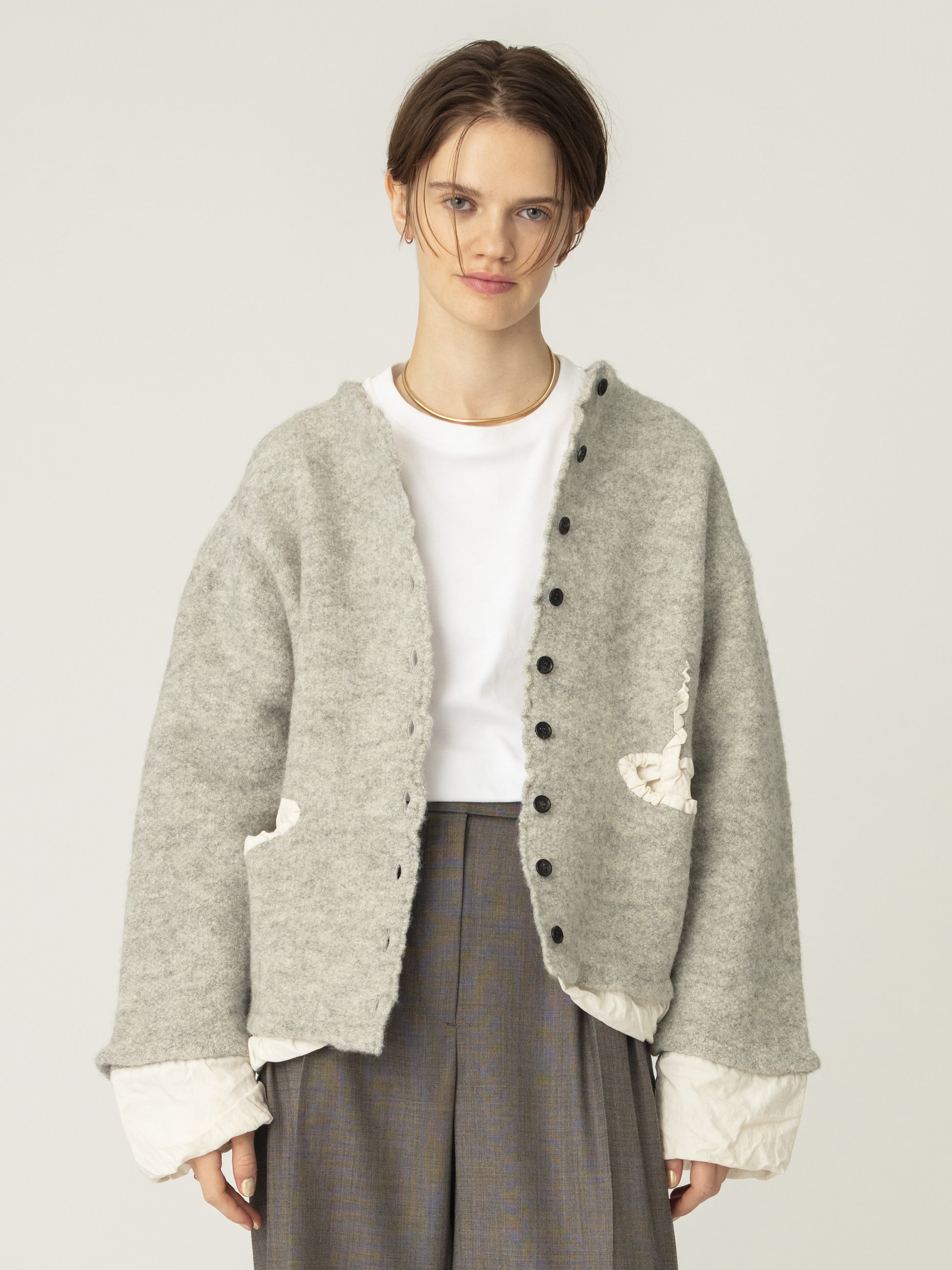 - pillingsのシグネチャーのひとつでもある縮絨加工を施したニットジャケットは、縮率の違う素材を組み合わせて縮絨を施し、ポケットや袖口、裾部分から裏地が噴き出しているかのようなデザインになっているのがポイントです。裏地がコットンのでさらりとした着心地で、軽くて暖かく、肌寒い秋から冬の寒さまで、気軽に羽織れるアウターとしても活躍します。ロンハーマン別注カラーや、同シリーズのニットベストもございます。