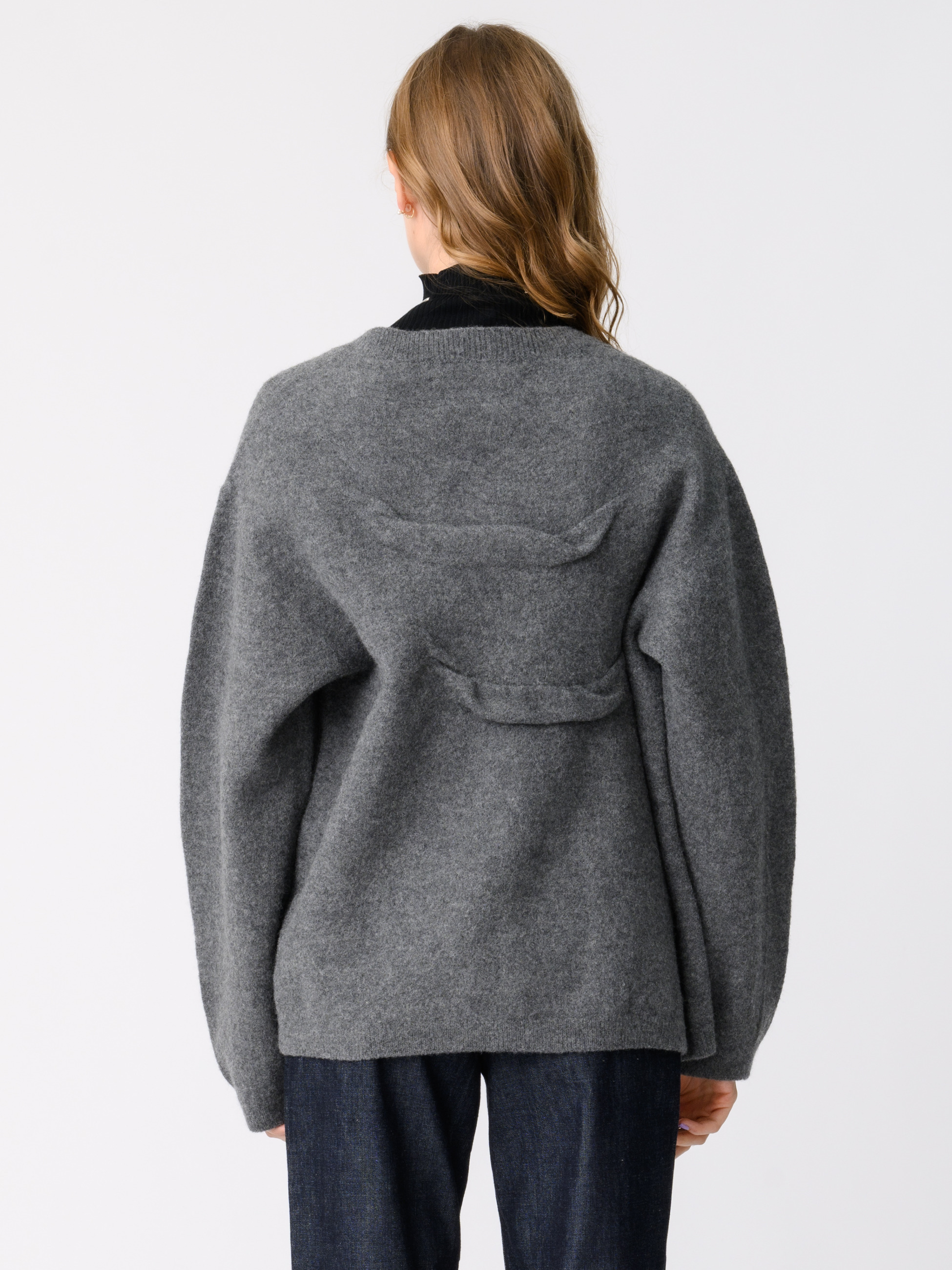 毛玉加工を施した縮絨ニットの新作カーディガンを、上品な印象のネイビーとグレーで別注しました。立体感のある編みのディティールと、縮絨によってツイストしたシルエットが魅力で、シンプルながら存在感のあるの一着です。 カーディガンの上に同色のディストーテッド ニットベストを重ねた、レイヤードスタイルもおすすめです。