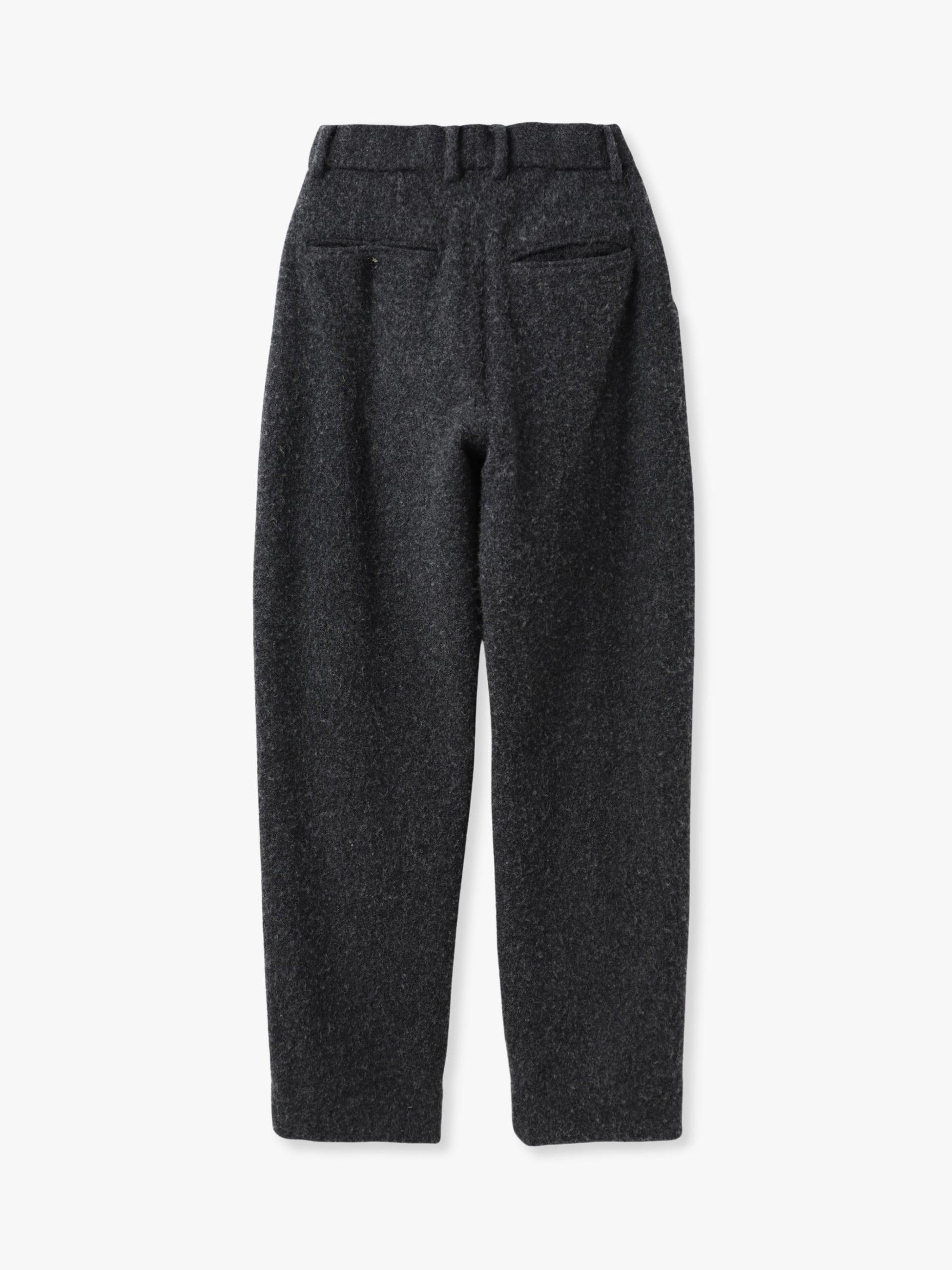 ツイード生地に縮絨を施したパンツは、見た目にも暖かく、裏地がコットンのさらりとした着心地の1着です。テーパードシルエットの綺麗目な印象で、ダークカラーの3色は、どんなトップスとも好相性です。