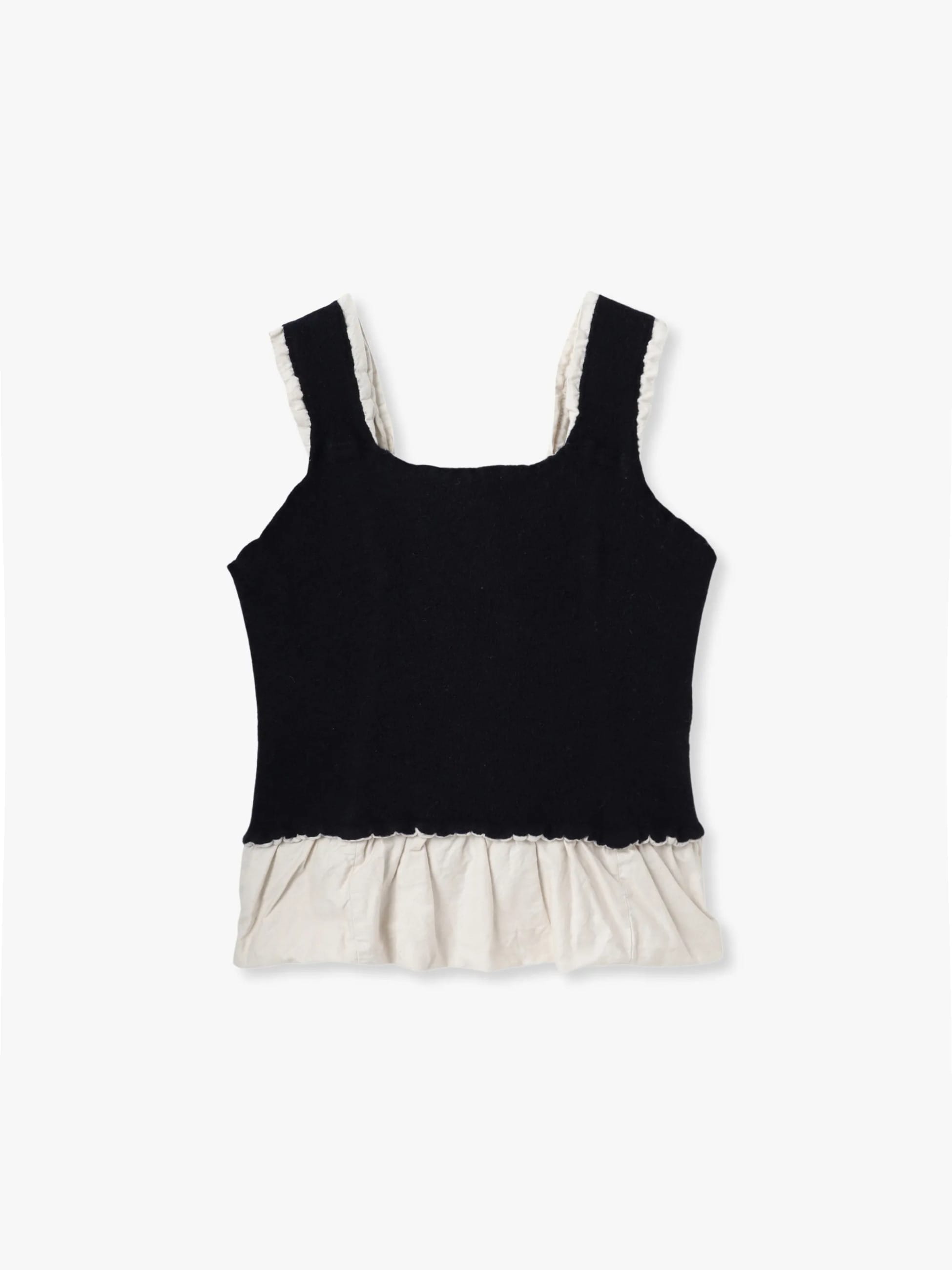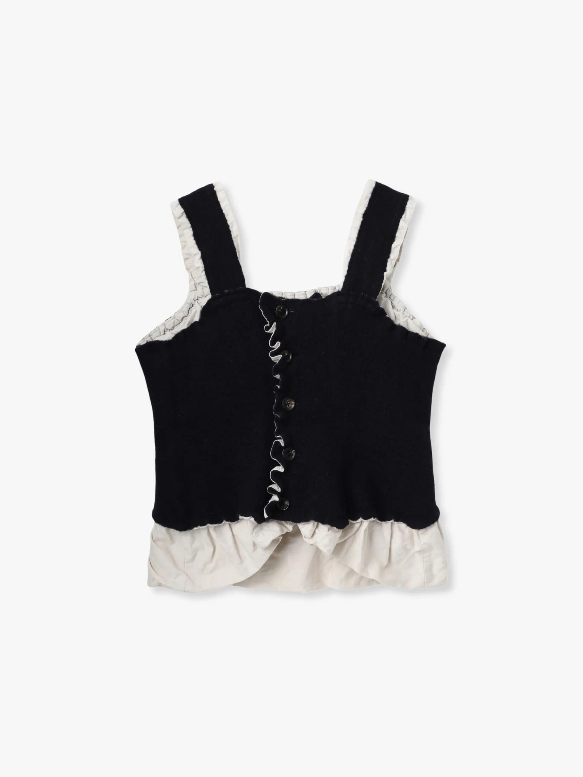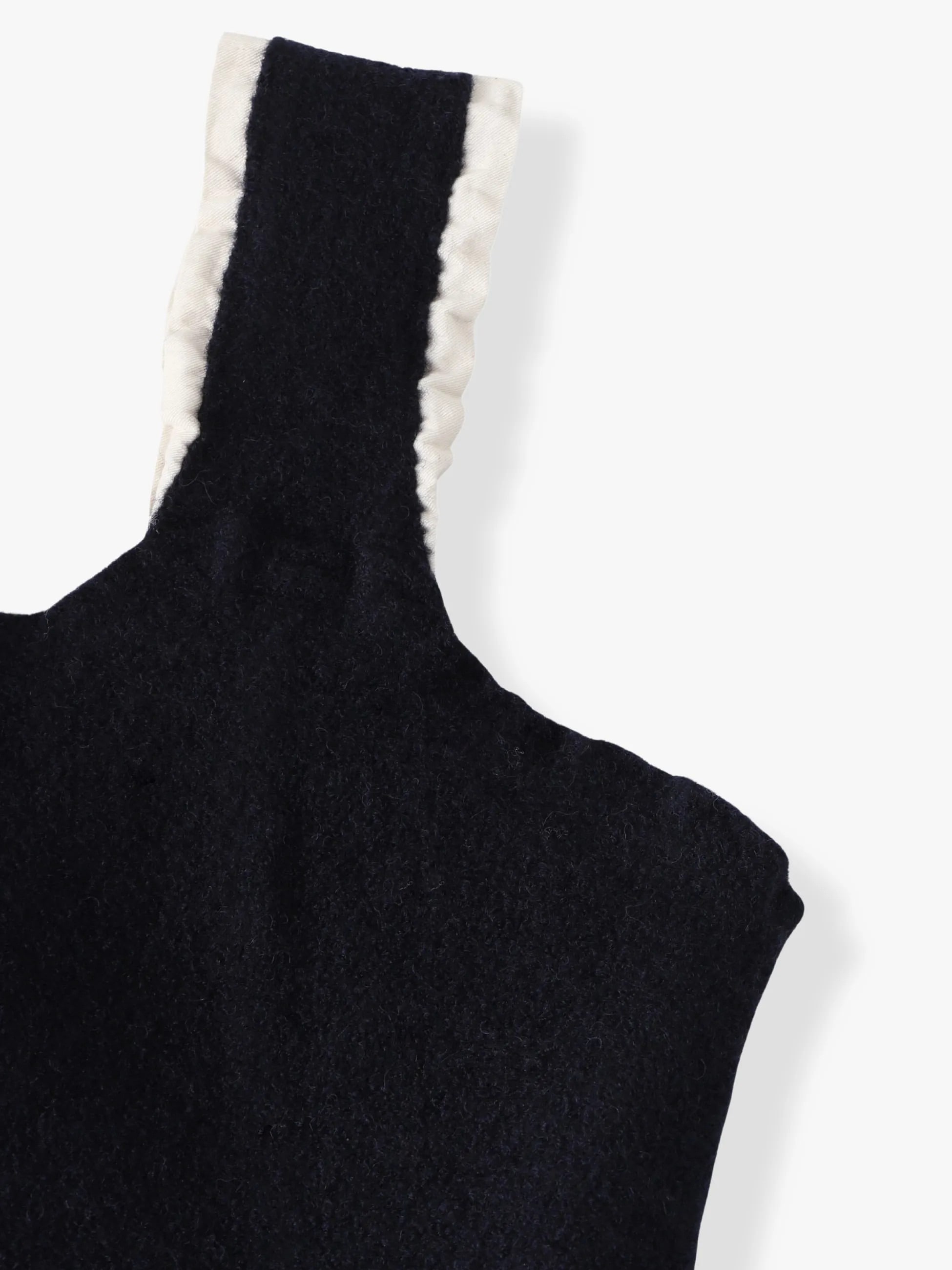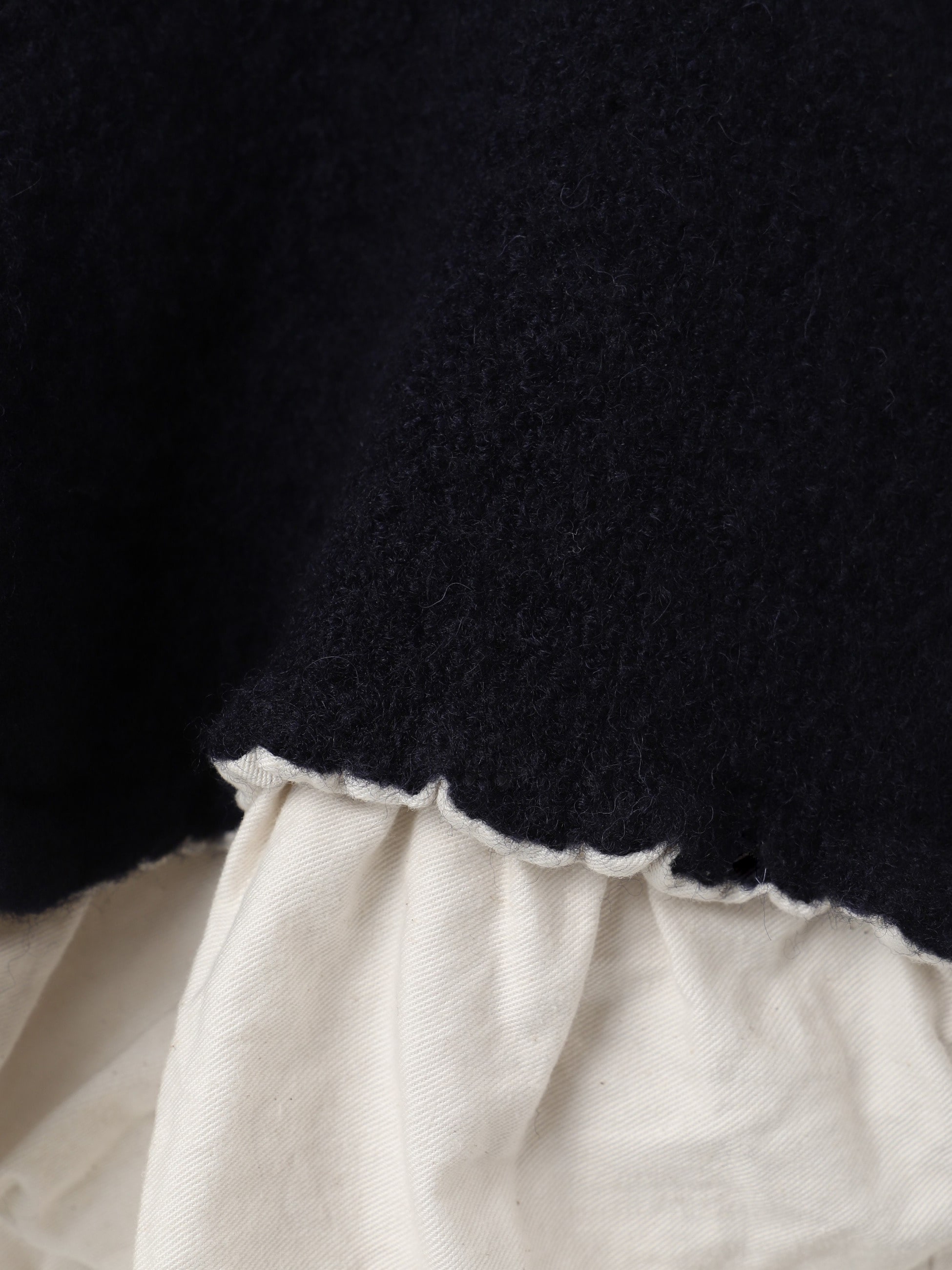 縮絨加工が施されたキャミソールトップは、肩や裾部分から、裏地が噴き出しているかのようなpillingsらしいデザイン性をお楽しみいただけます。フロントはフラットに、バックはボタン仕様になっており、縮率の違う素材を組み合わせて縮絨を施すことで、ユニークなシルエットを実現しています。インナーにハイネックトップをレイヤードしたり、pillingsのその他のアイテムともバランス良く着用いただけます。
