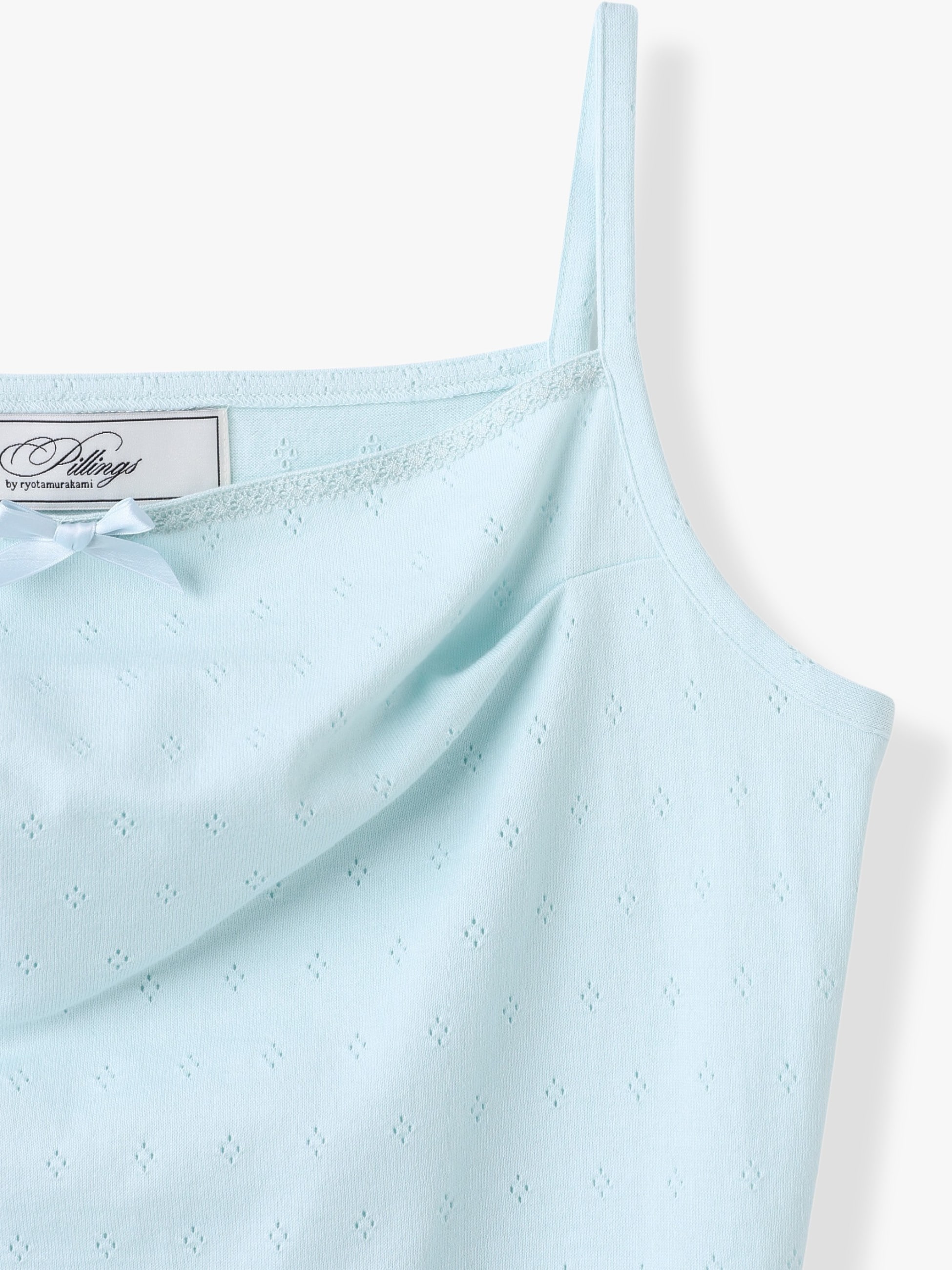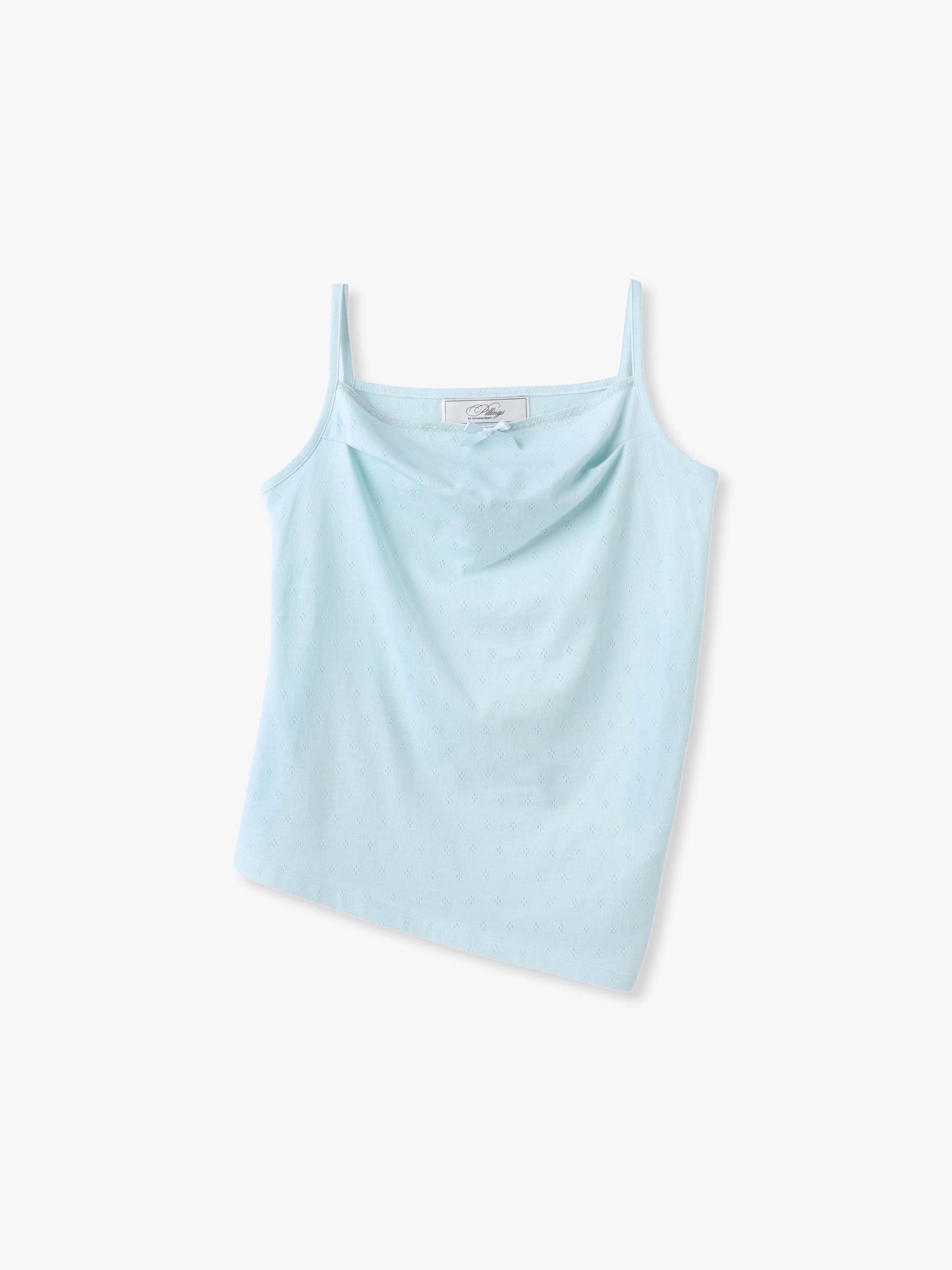 コットンを100%使用し、さらっとした着心地のキャミソールは、着崩したようなドレープ感を表現した独特な風合いが特徴です。変形シルエットのスリーブレストップスとレイヤードしたり、ジャケットやシャツのインナーとしても重宝します。アイレット素材に、胸元のリボンがさりげなくキュートな印象をプラスします。