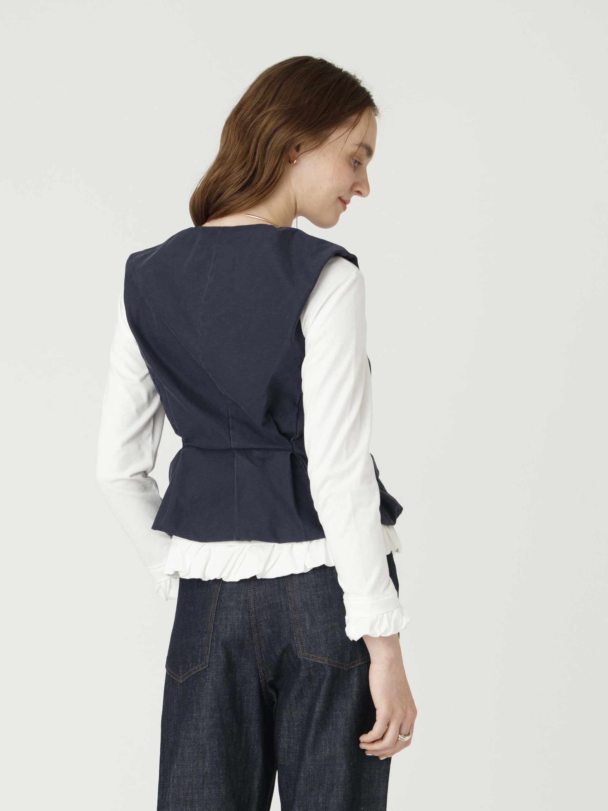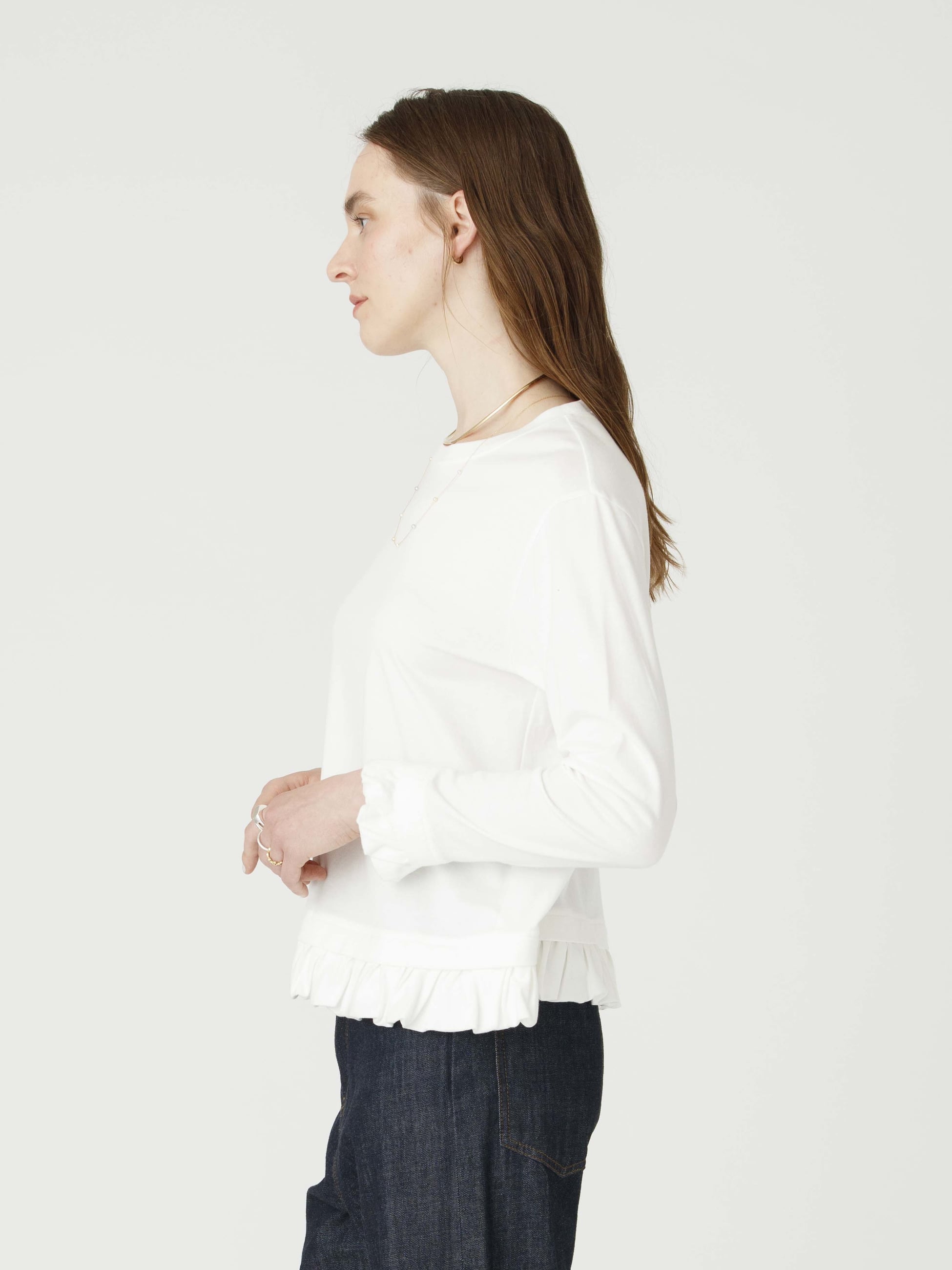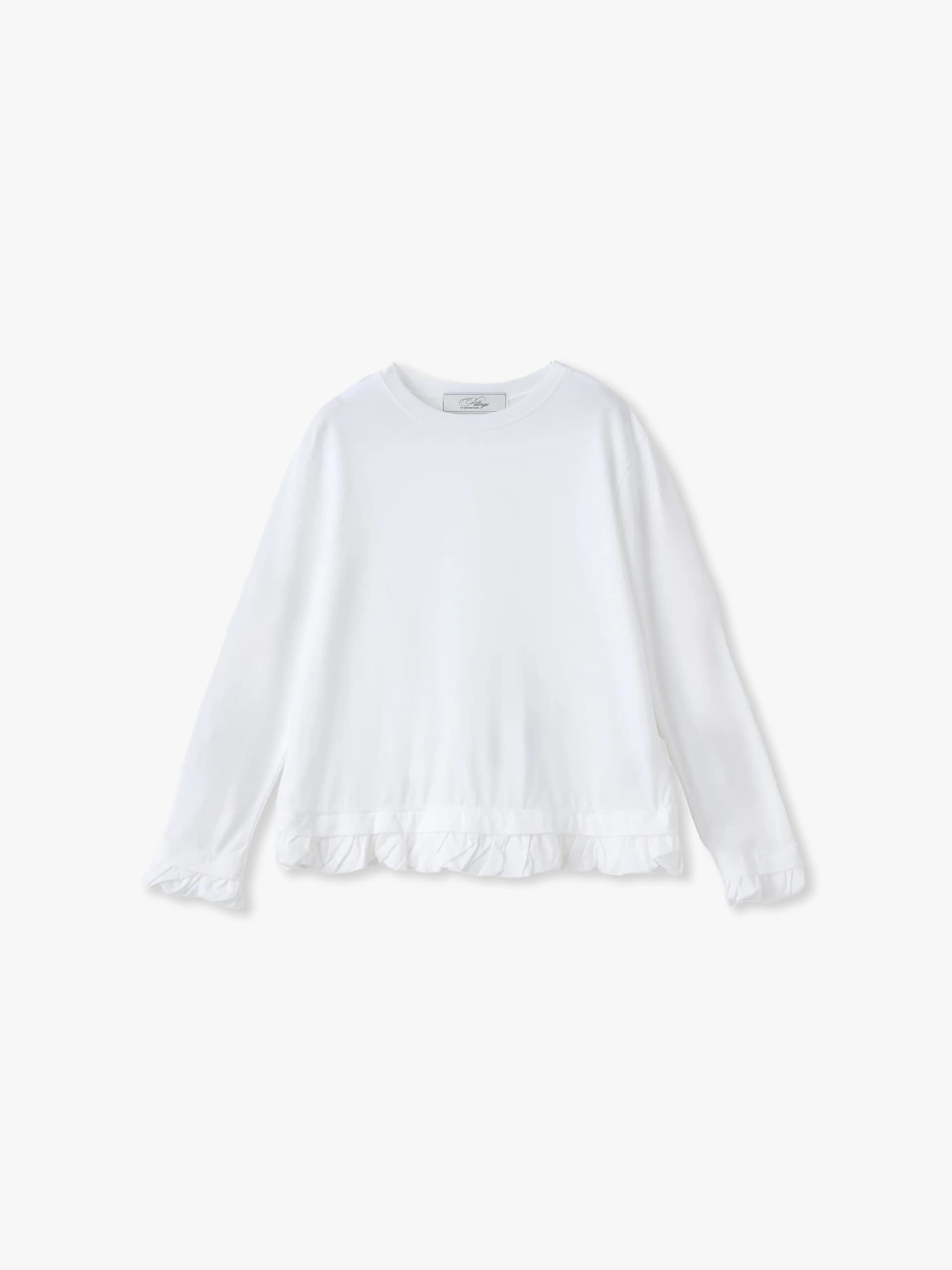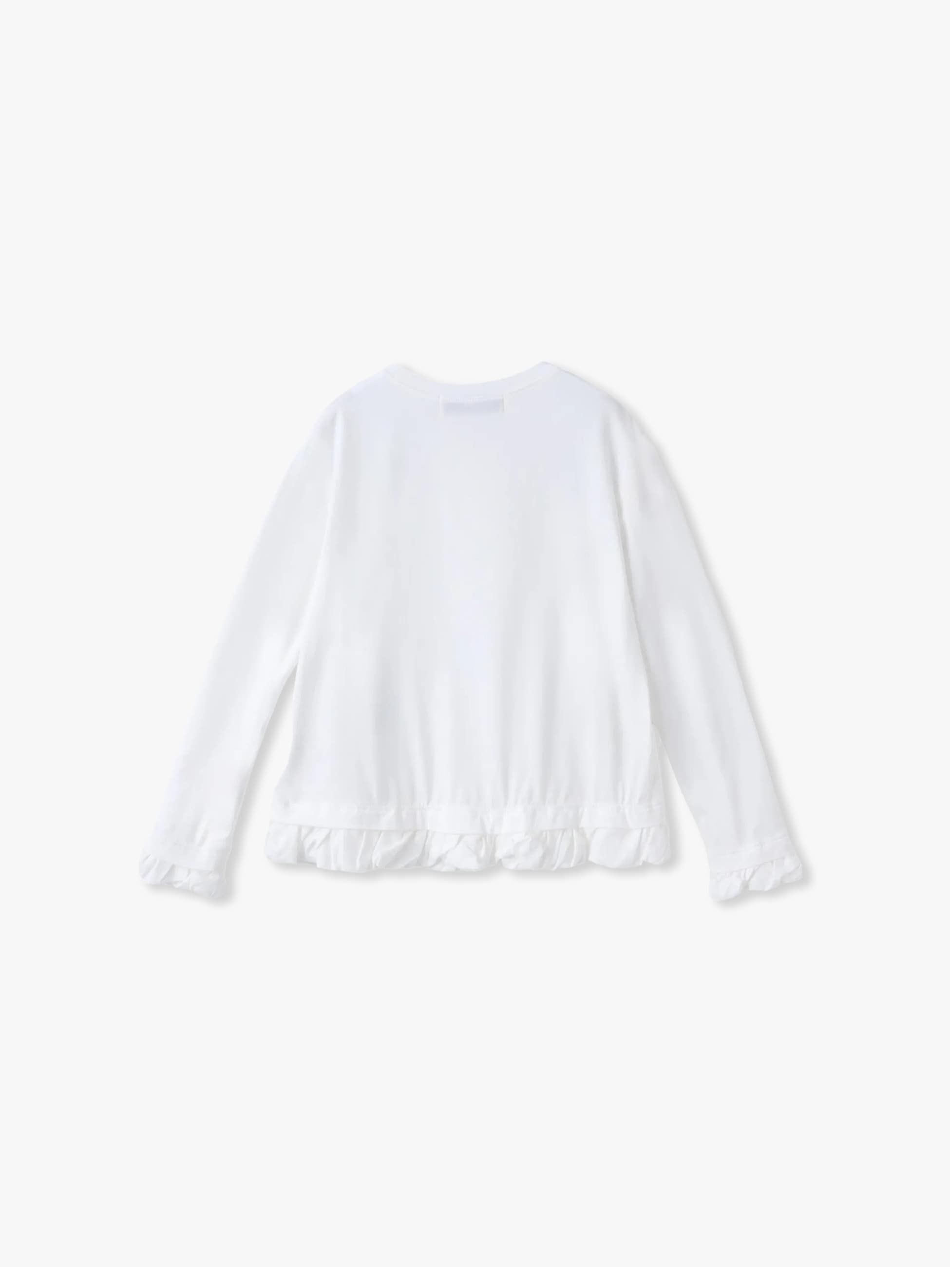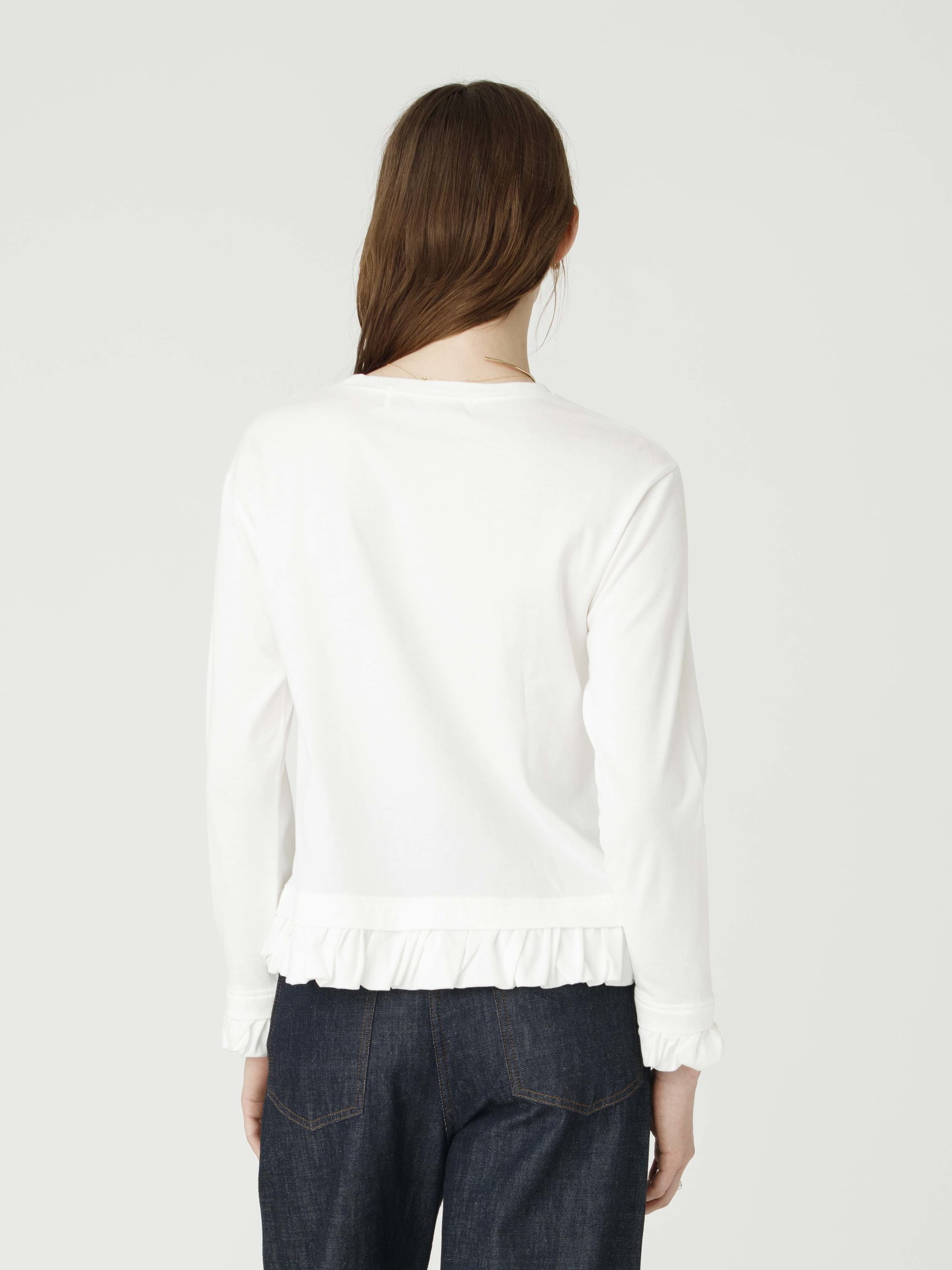 pillingsのシグネチャーである、縮絨アイテムのディテールからインスパイアされたロングスリーブTシャツは、袖口や裾から生地が吹き出しているかのようなフリルディテールが心をくすぐる仕上がりに。肌触りの良いコットン素材で、1枚でトップスとしてはもちろん、pillingsのその他のアイテムとのレイヤードスタイルも様になります。