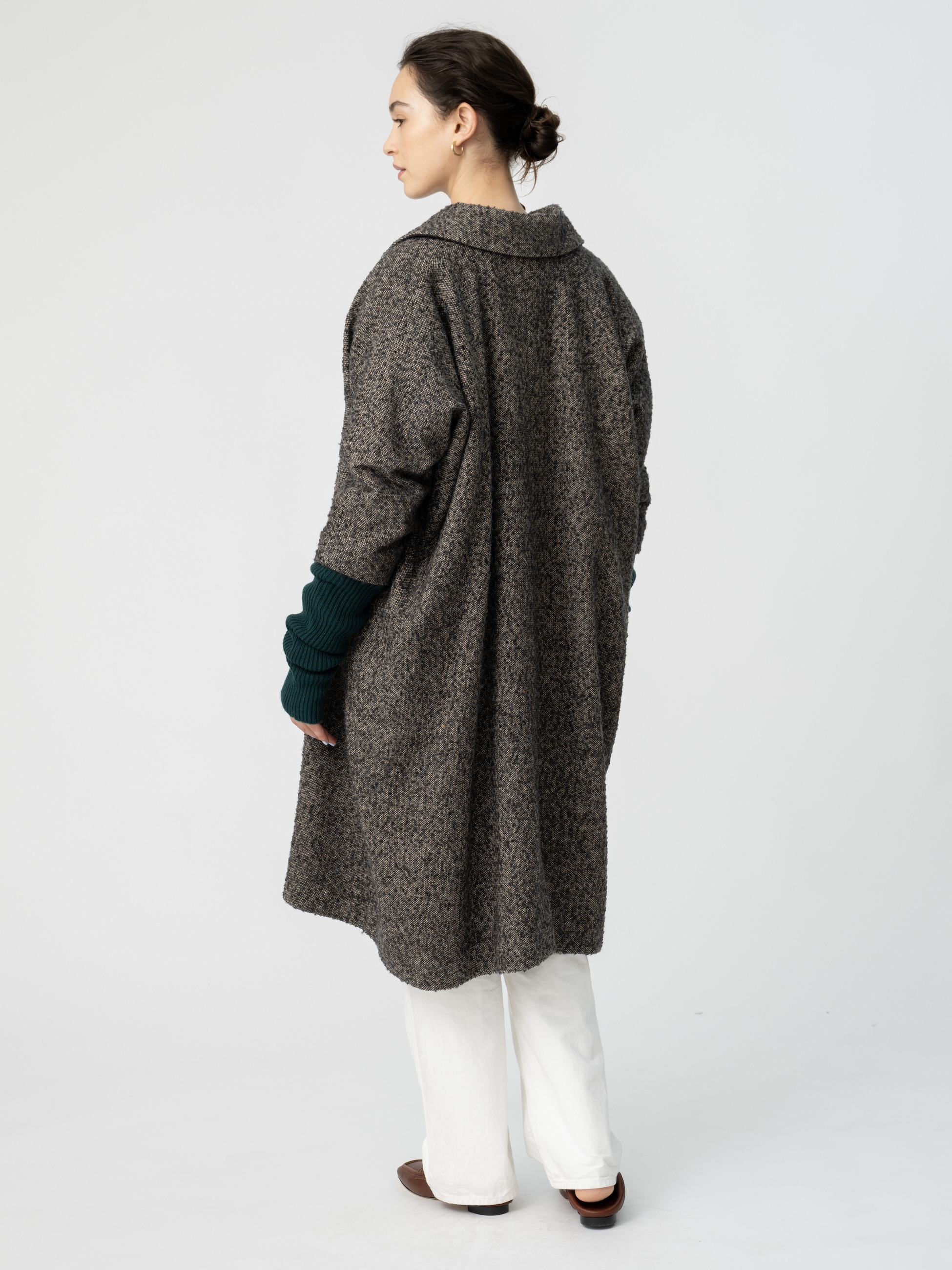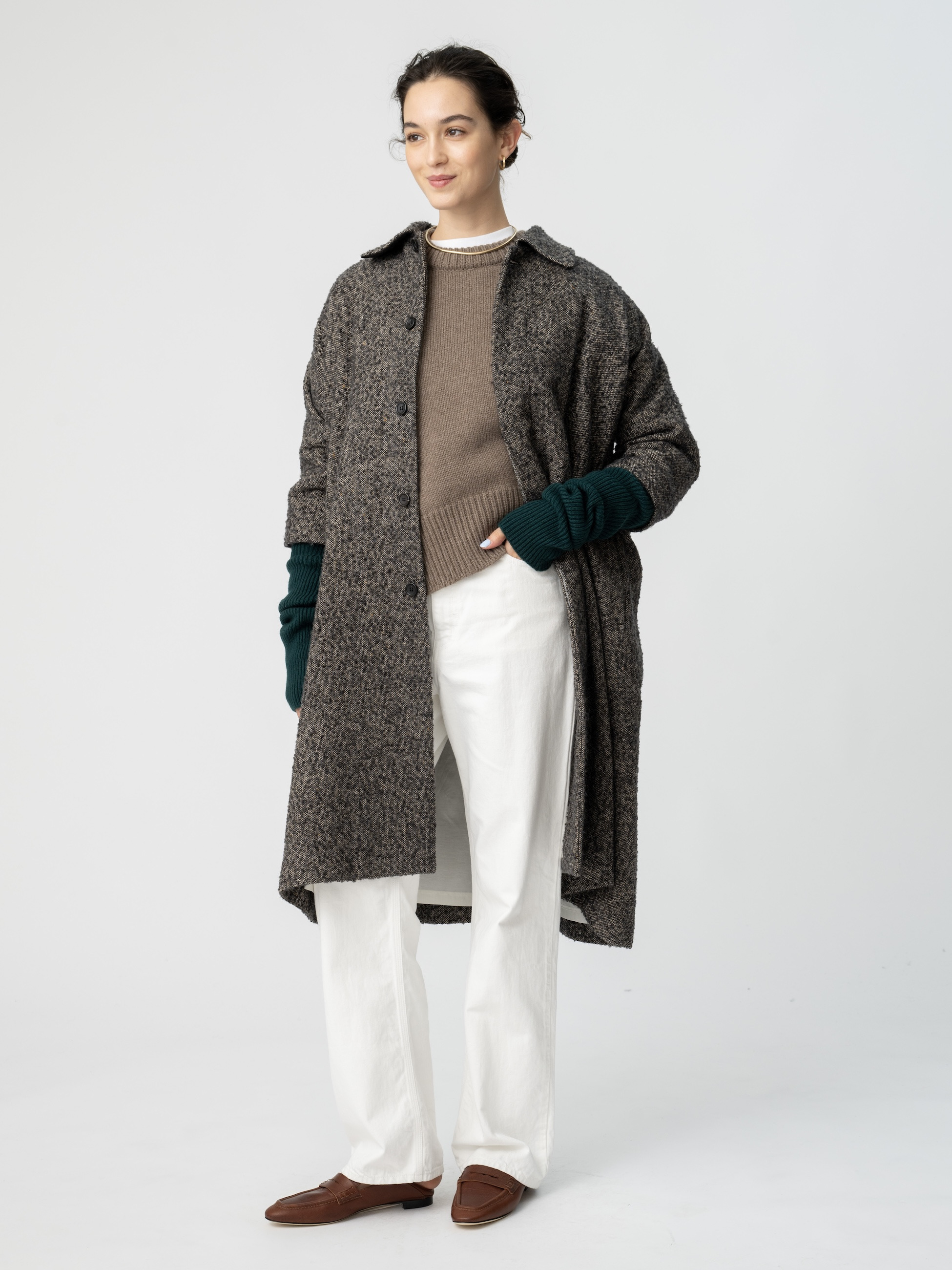 あえて袖丈を短く調整し、付属のニットグローブで袖口にアクセントを加える新しいシルエットのコートをロンハーマンで別注しました。寒い時期に、見た目から上品であたたかい印象のツイード生地をセレクトし、ニットグローブのカラーにもこだわりが詰まった1着です。カジュアルにもきれいめにも決まり、重くなりがちな冬の装いを軽やかに演出する、新鮮なスタイリングをお楽しみください。