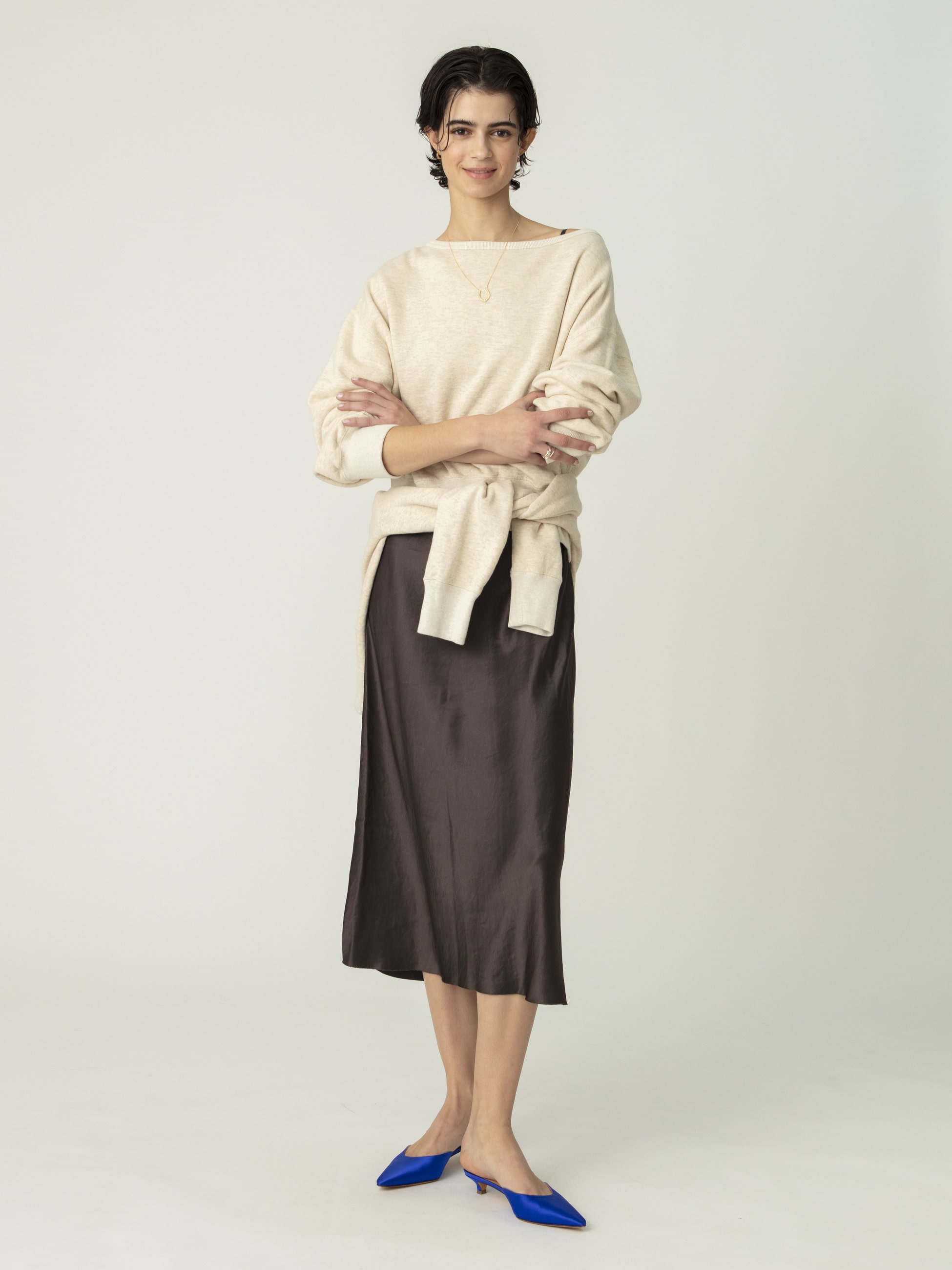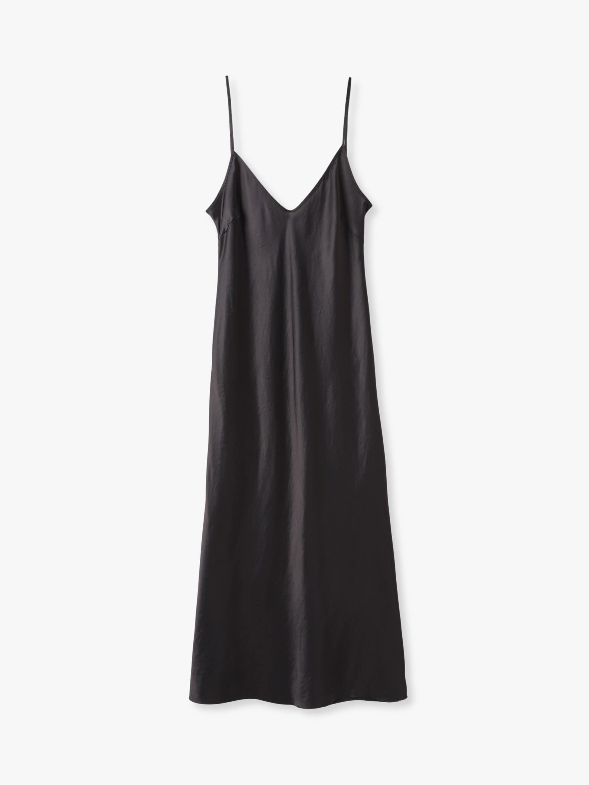 艶のある素材感で、型から別注したキャミソールドレスは、バイヤス裁断することで体に沿う美しいラインに仕上げています。爽やかなライトブルーに上品なパープル、クラシックなブラウンの3色展開で、オーバーサイズのトップスともバランス良く着ていただけます。ドレスアップからカジュアルまで、さまざまなテイストのスタイリングをお楽しみいただける一着です。