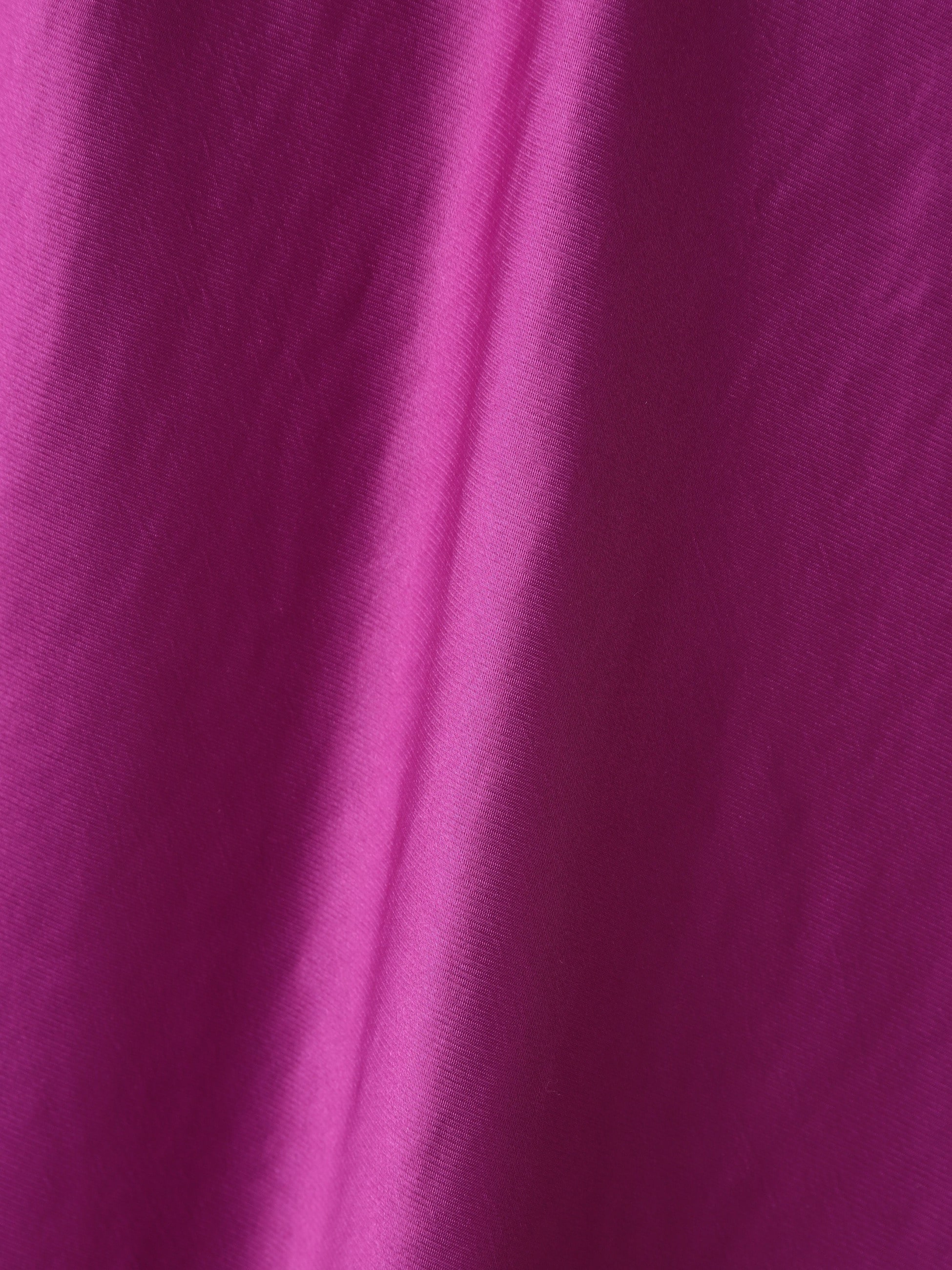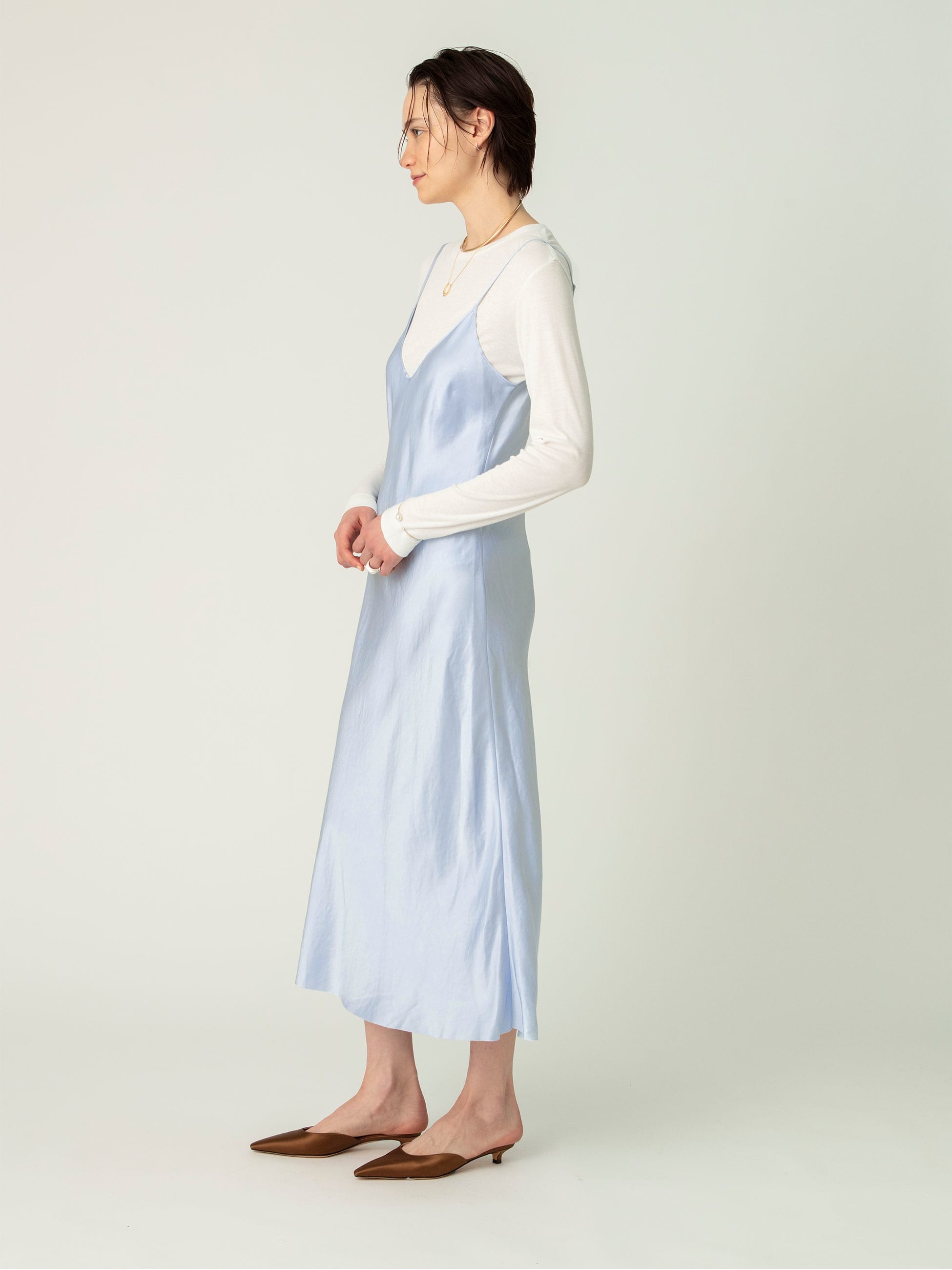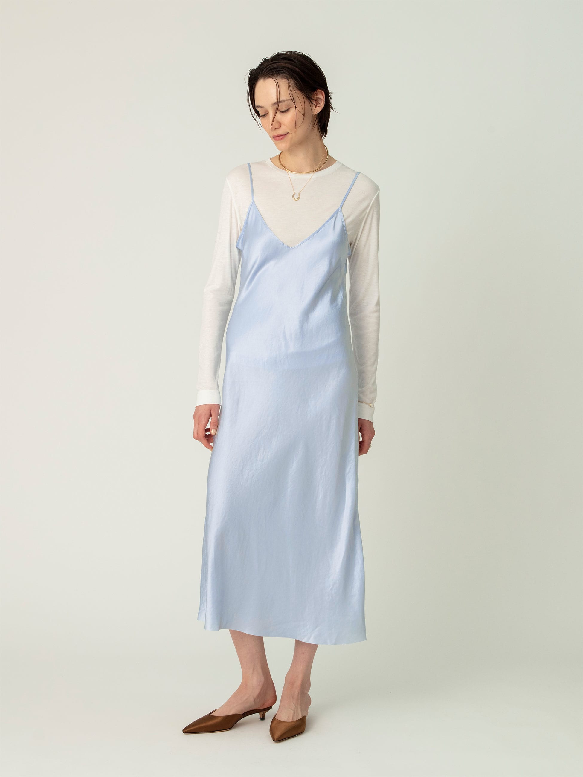 艶のある素材感で、型から別注したキャミソールドレスは、バイヤス裁断することで体に沿う美しいラインに仕上げています。爽やかなライトブルーに上品なパープル、クラシックなブラウンの3色展開で、オーバーサイズのトップスともバランス良く着ていただけます。ドレスアップからカジュアルまで、さまざまなテイストのスタイリングをお楽しみいただける一着です。