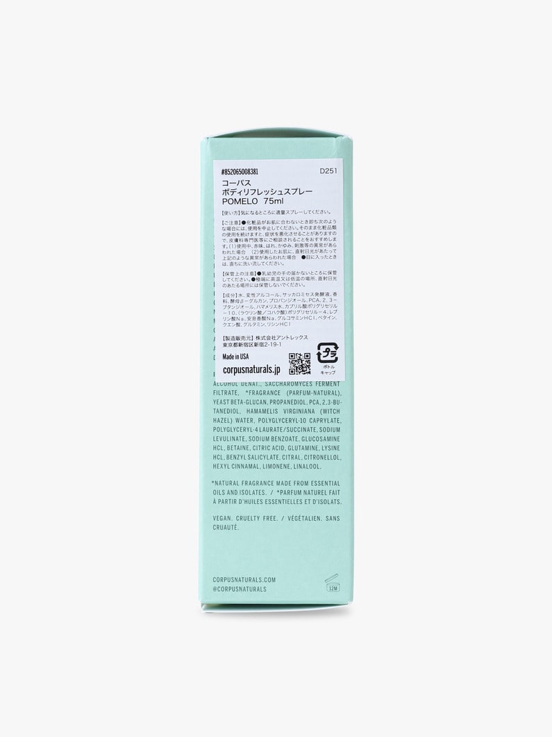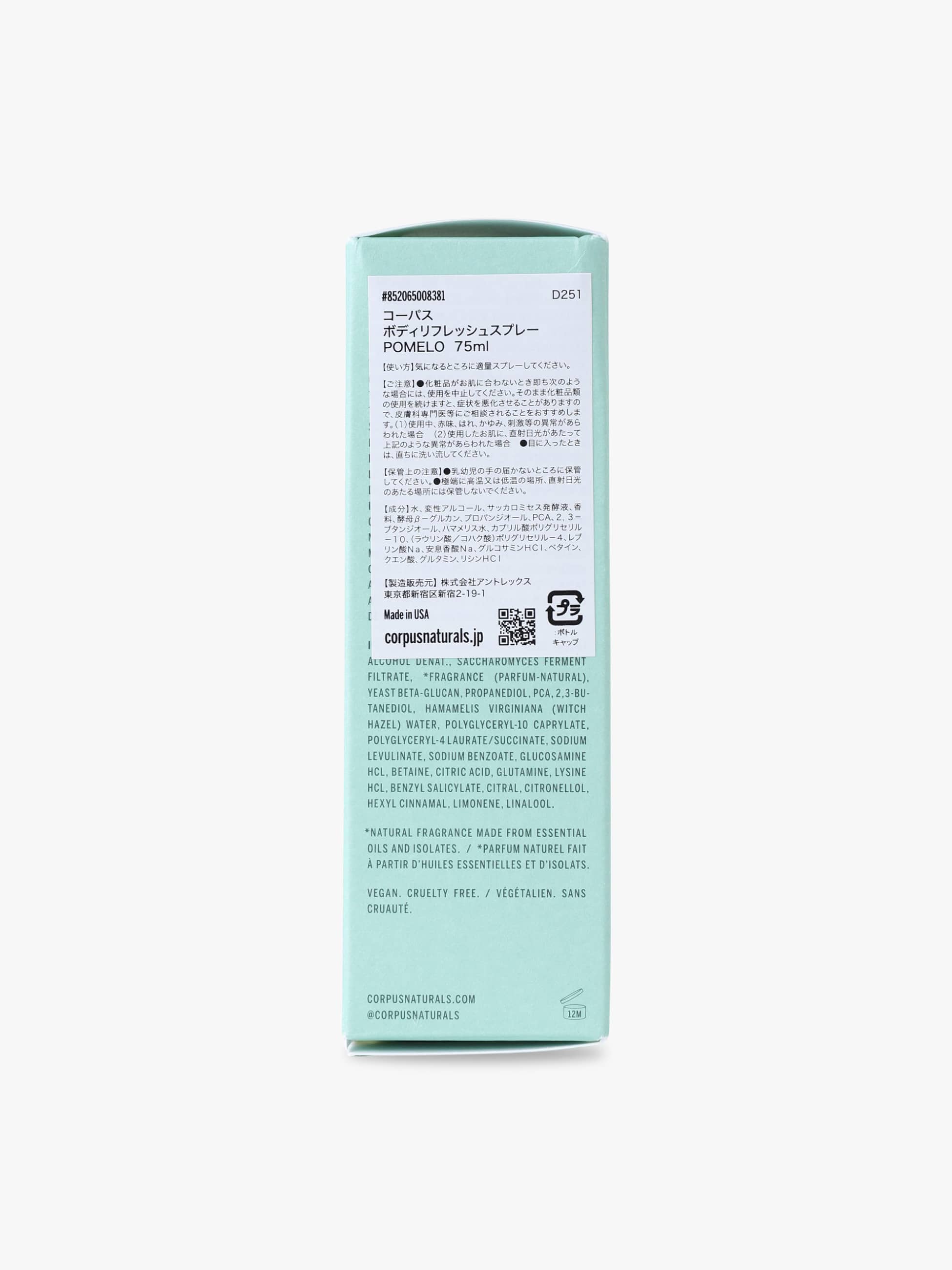 - 汗の気になるニオイを防いでくれる、植物由来のデオドラントスプレーです。天然酵素、植物エキス、プレバイオティクスがブレンドされており、臭いを効果的に軽減。POMELOの香りは、爽やかでクリーンなシトラスのトップノートから始まり、ハーブやホワイトフローラルの明るい香りが広がります。
