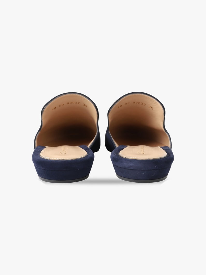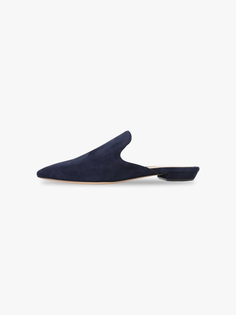 - スリッパ型のフラットミュールを25FWシーズンのムード漂うシックなネイビーカラーのスウェード素材で別注しました。アーモンドトゥの優美なフォルムと、高さ1.5cmのフラットなヒールが絶妙なバランスです。イタリアで職人により一足ずつ丁寧にハンドメイドされ、抜け感と上質さが際立つ一足です。ワードローブにもマッチし、あえてオールネイビーでまとめたスタイリングに合わせていただくのもおすすめです。