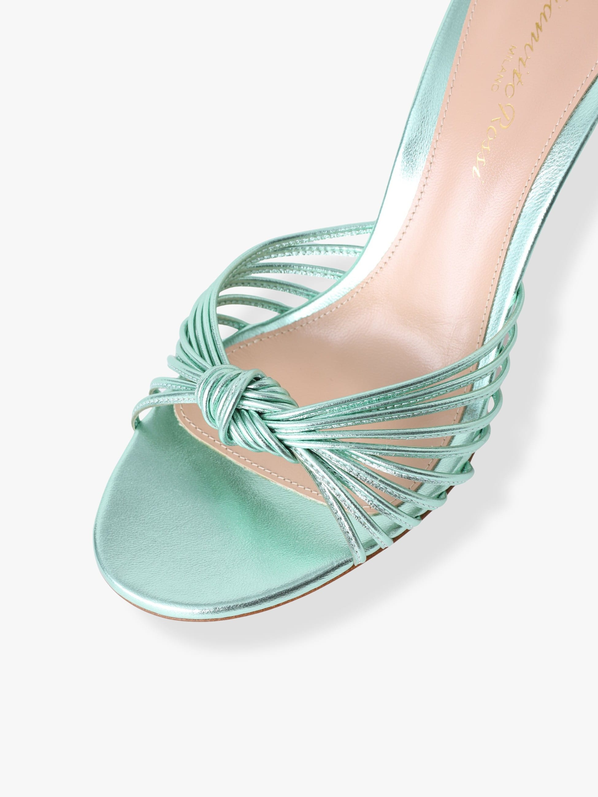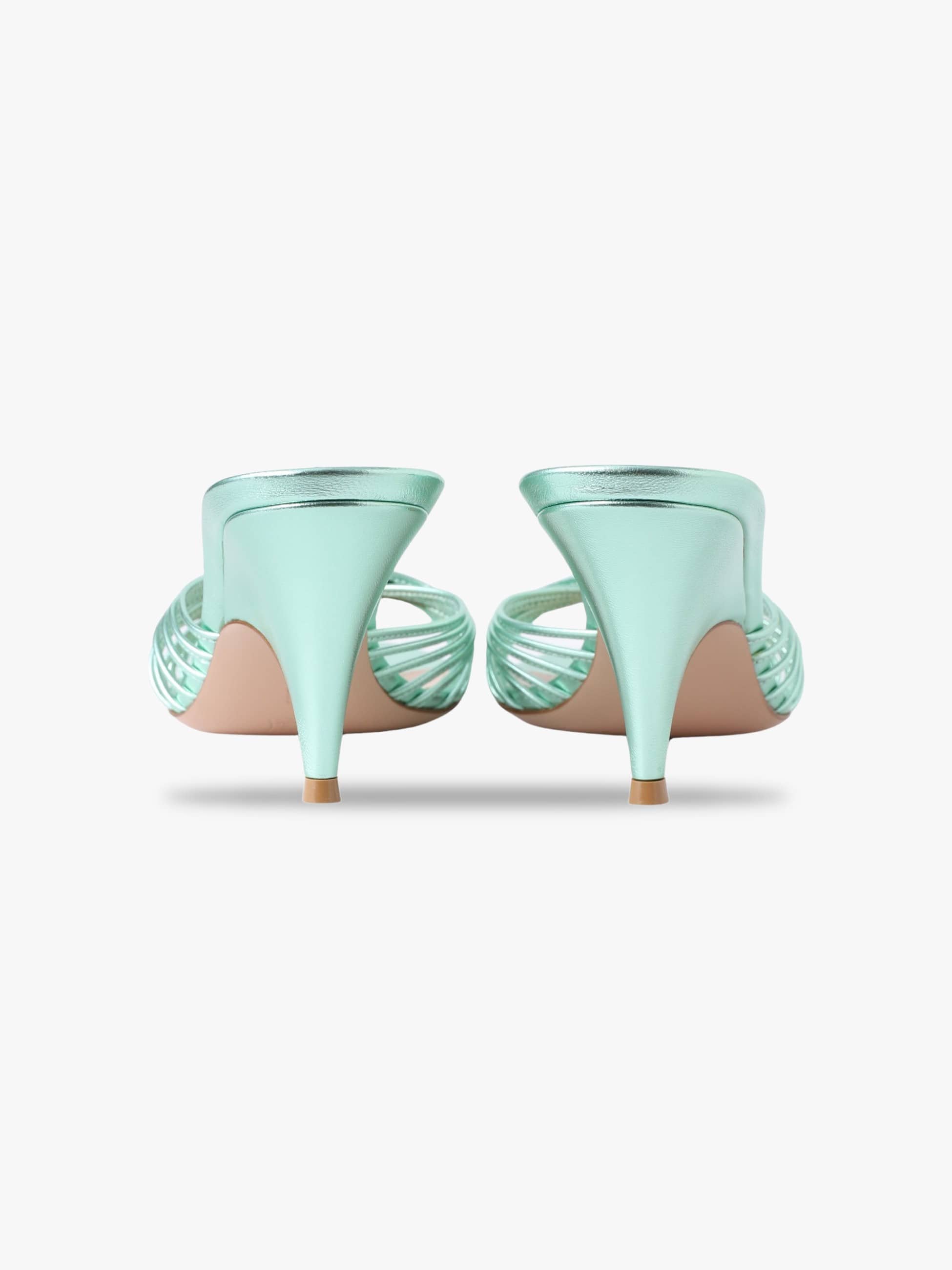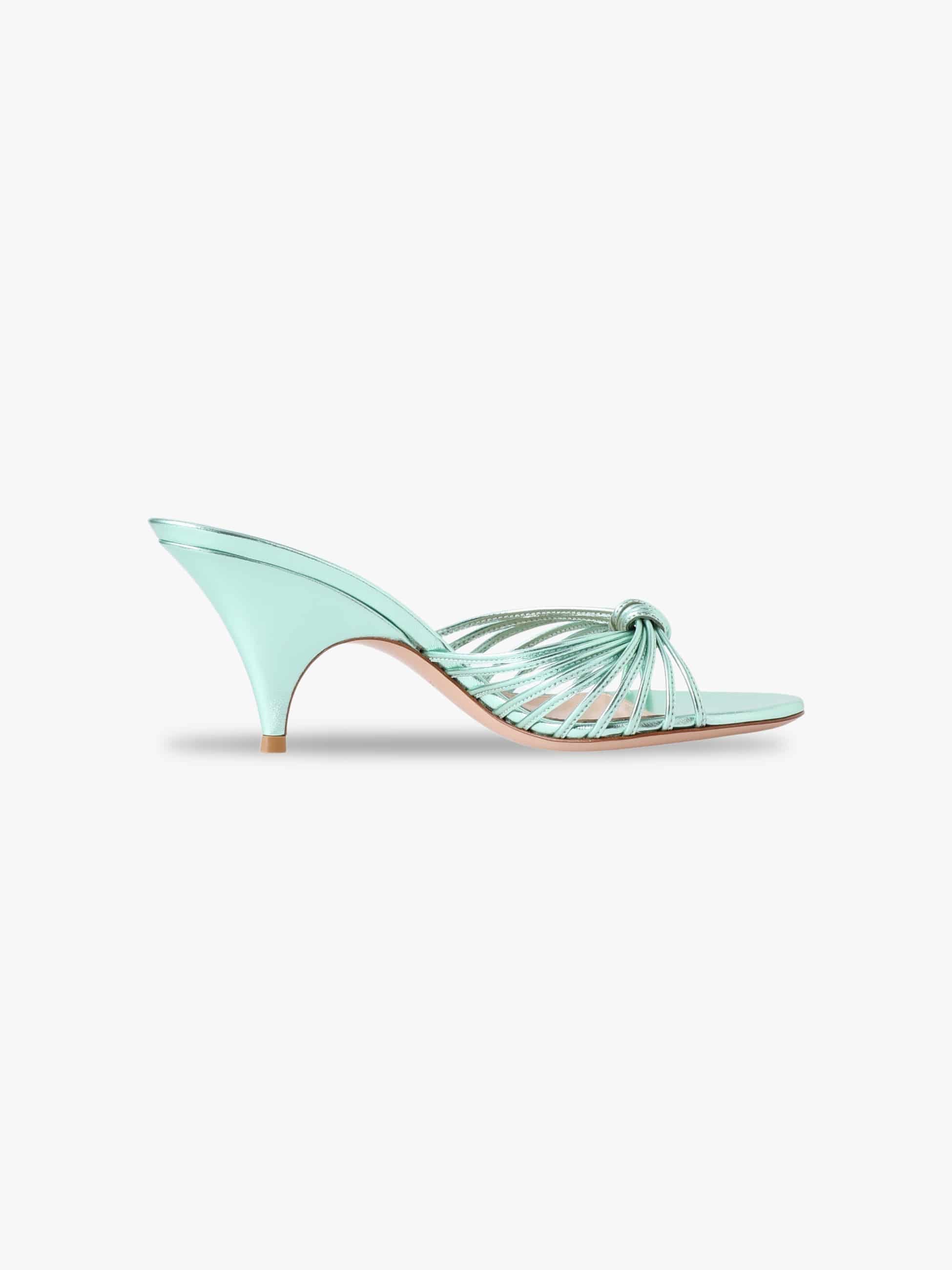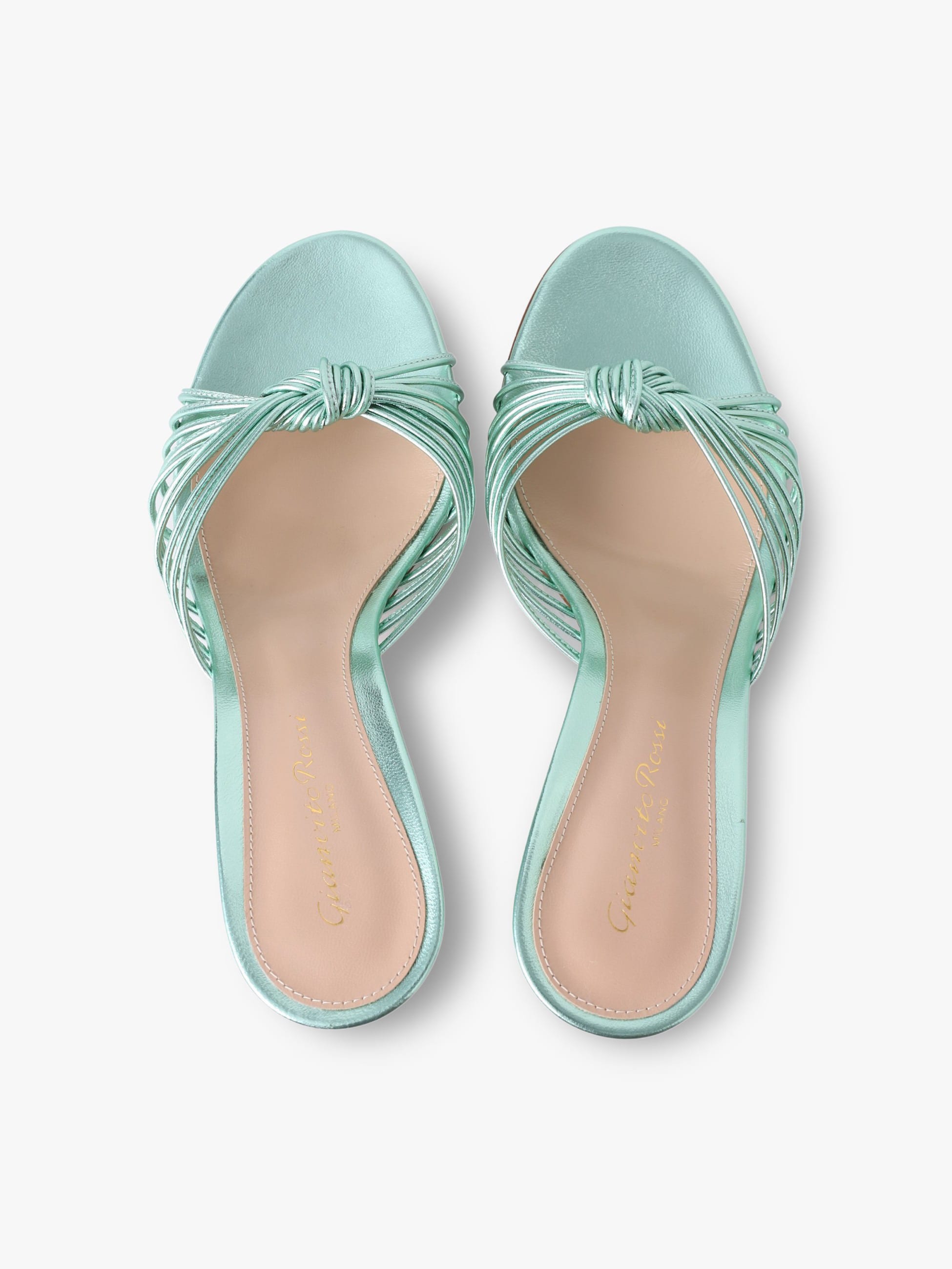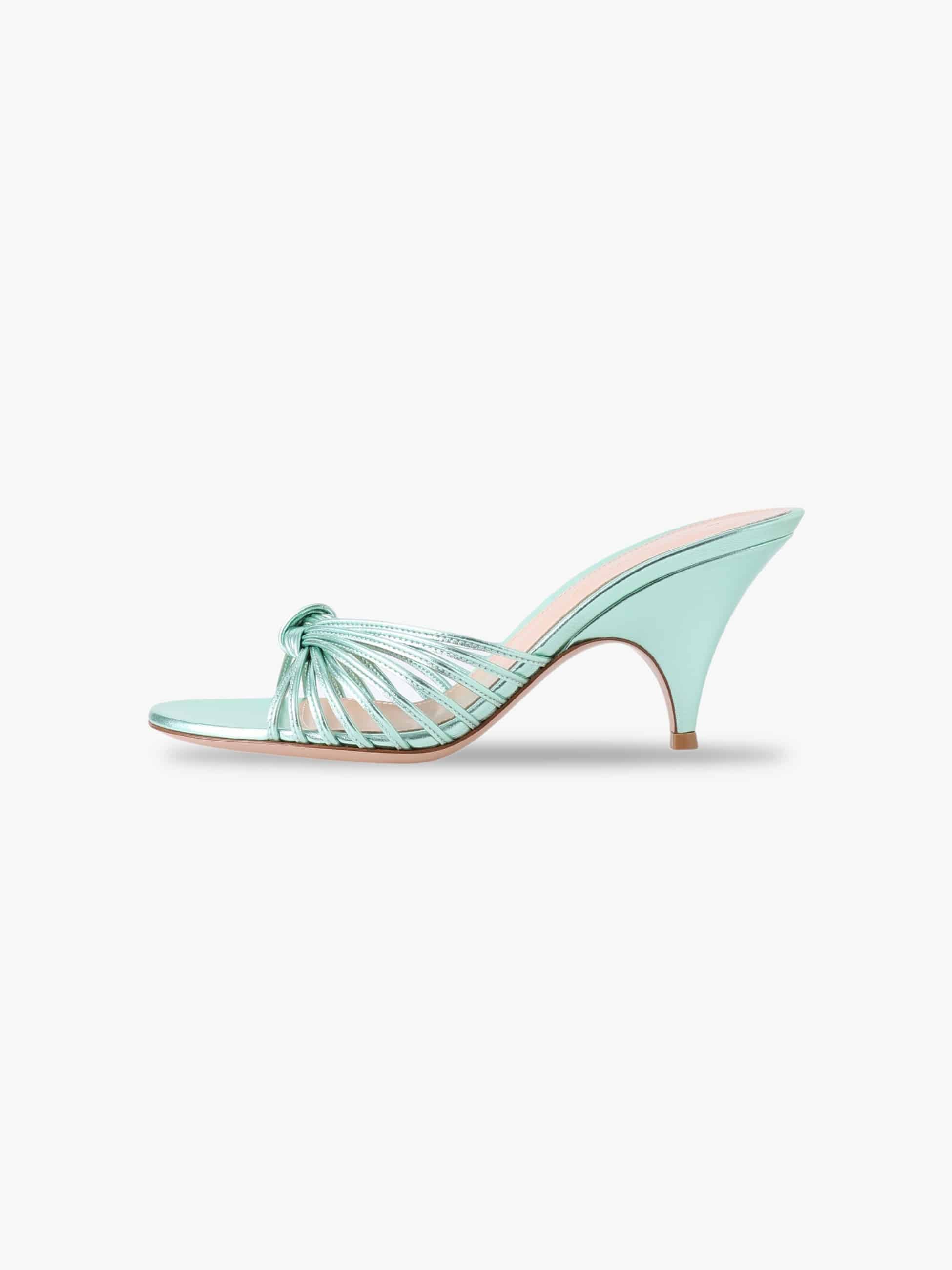- 海中にある様々な色からインスピレーションされた、Gianvito Rossiの26SSコレクションのテーマの一つ「Under Water」から、アロエグリーンの色味が美しいミュールが登場です。シルクのようになめらかな質感を持つ、上質なラムナッパレザーを使用し、ヒールは深いアーチにより、ピンヒールのような見た目とチャンキーヒールのような安定感を備えています。繊細なデザインとメタリック調の質感が、ラグジュアリーな足元を演出します。