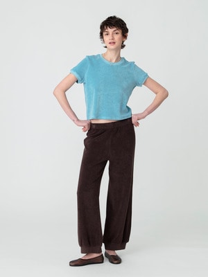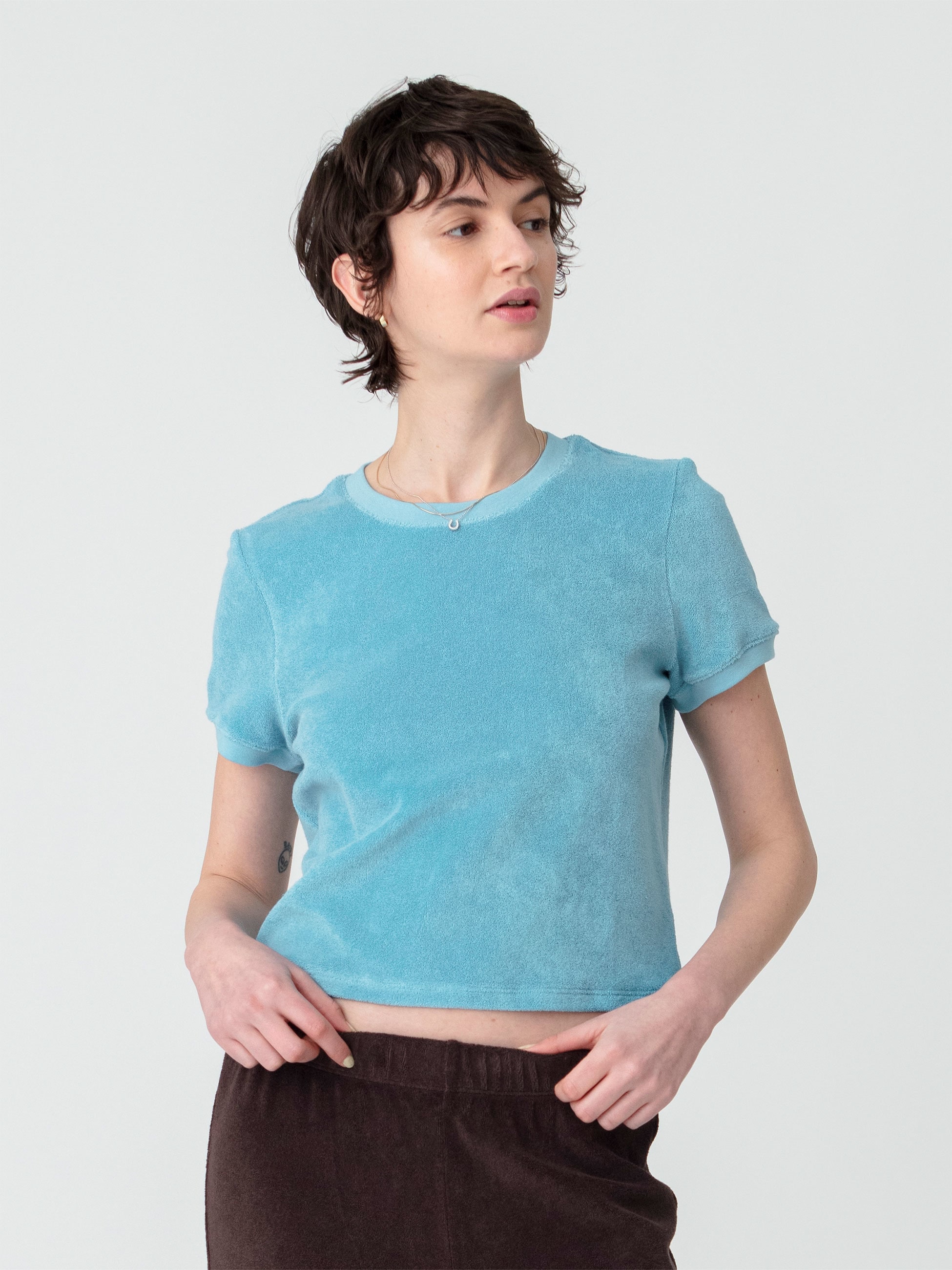 Suzie Kondiのシグネチャーのひとつ、カルピ クルーネックTシャツは、コンパクトなクロップド丈が可憐な印象で、暑いシーズンも快適な着心地が堪能できます。ハイウエストのパンツや、ギャザーがたっぷりと入ったスカートなどともバランス良く着ていただけます。Suzie Kondiのボトムと合わせたスタイリングもおすすめです。