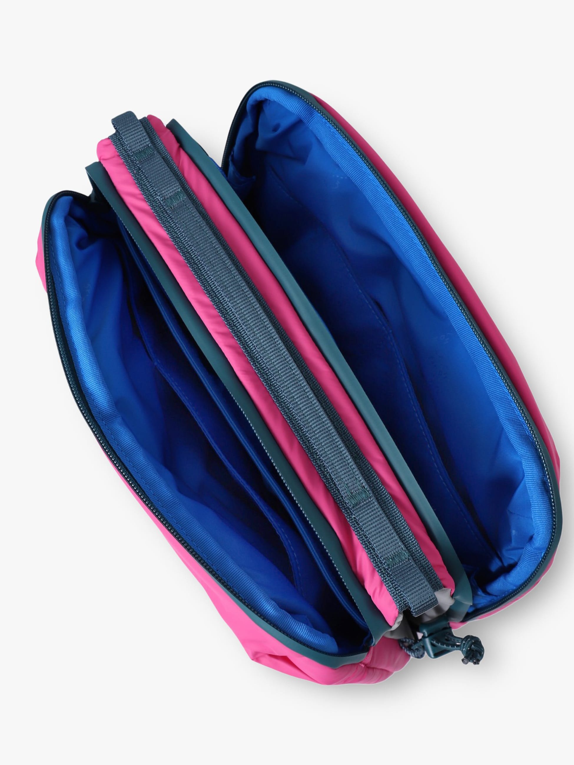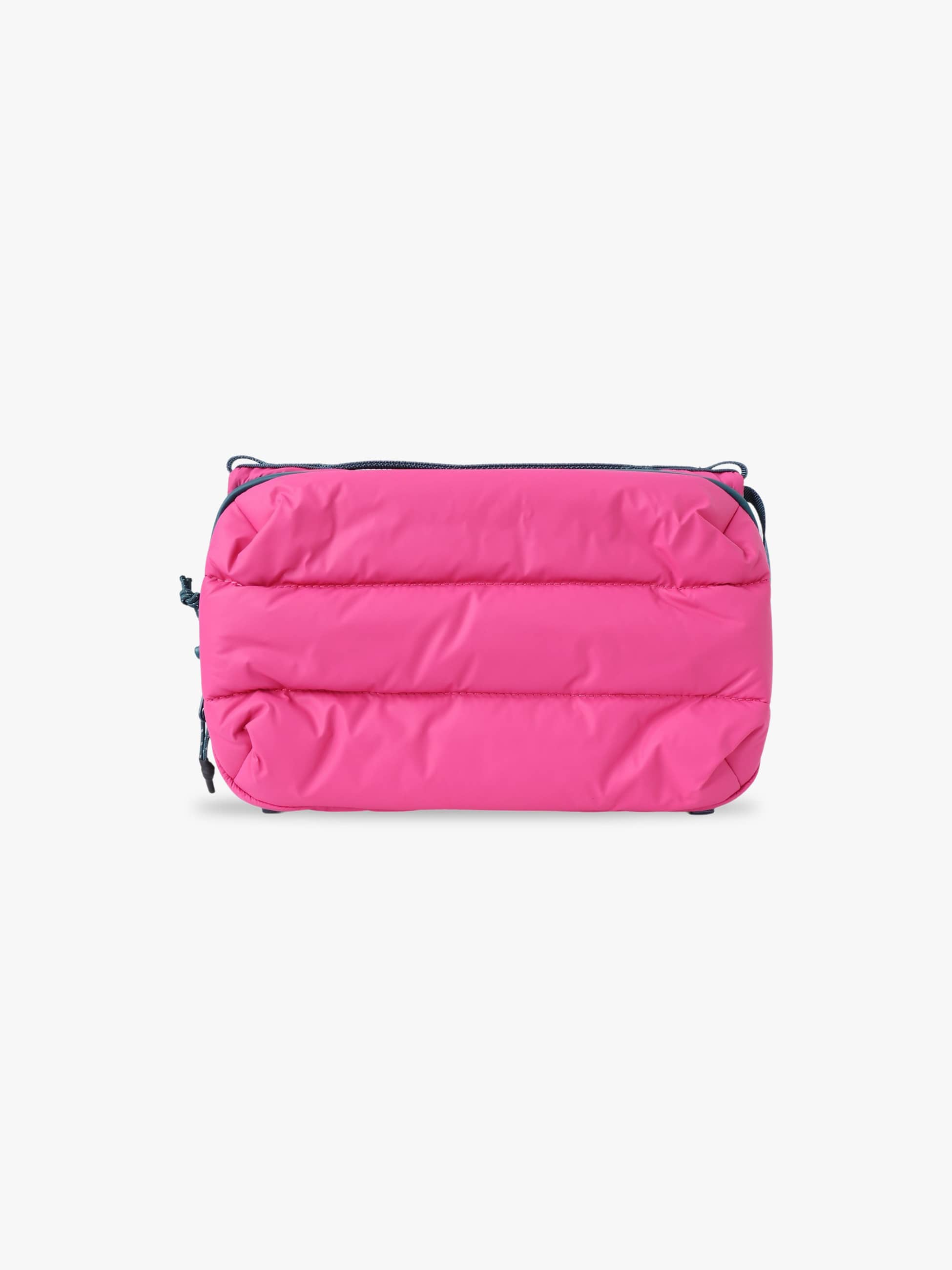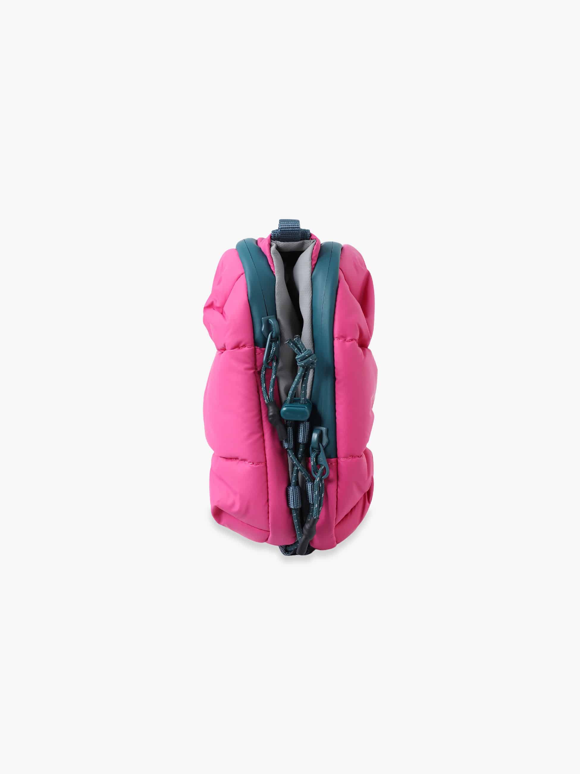 - タンブラーボトルやスマートフォン、財布、鍵などの必需品をを持ち運べる多機能ポーチ。ボトルや折り畳み傘の収納ができるコンパートメント付きで、旅行や外出にも便利です。軽量で撥水仕様のパファー素材を採用し、別売りのロープを付けるとショルダーバッグとしても活躍します。環境に配慮したサステナブルなデザインも魅力です。