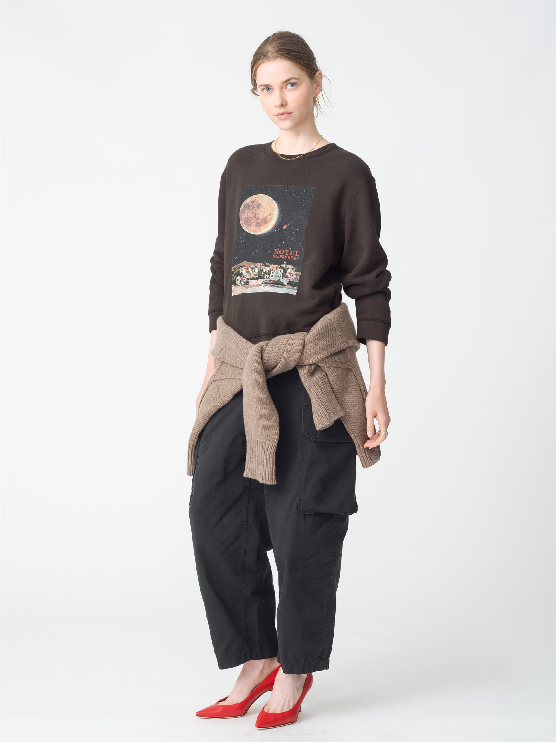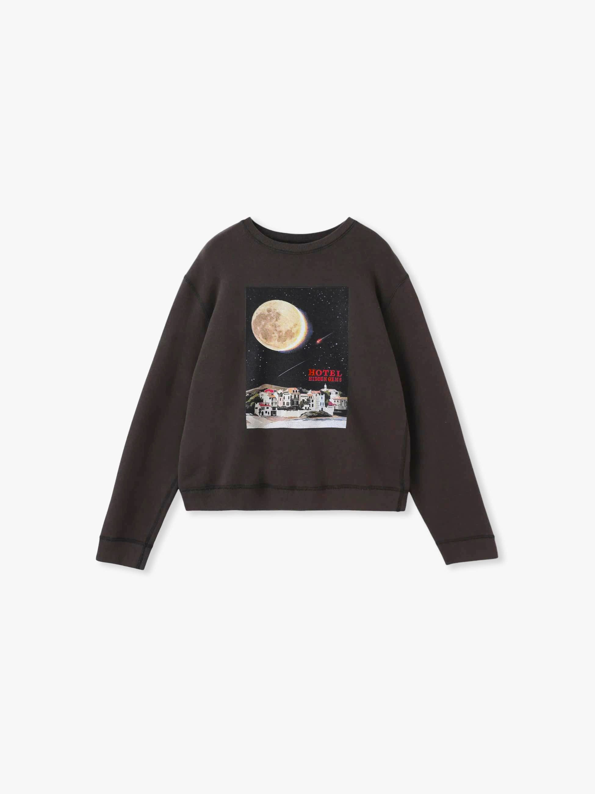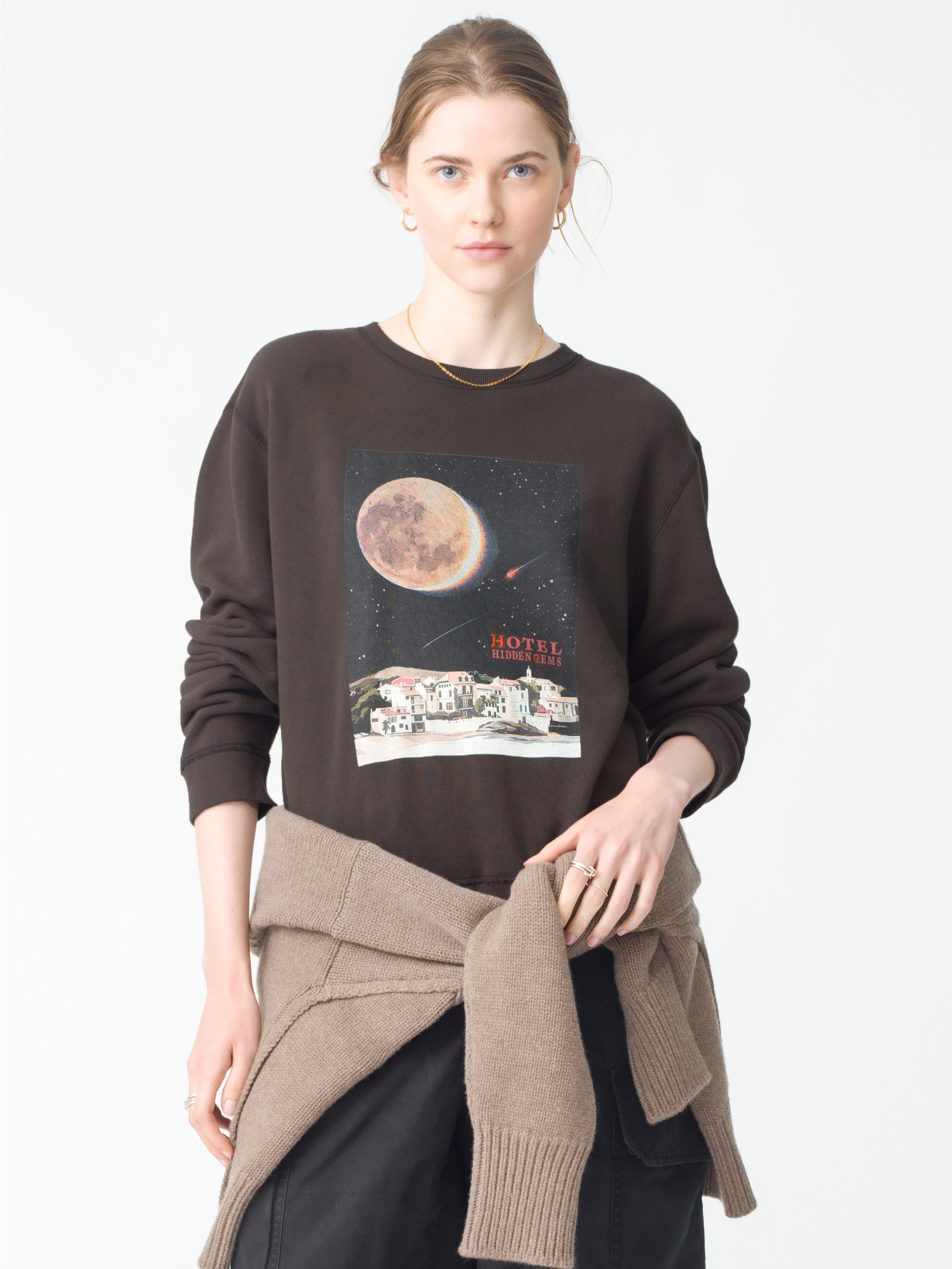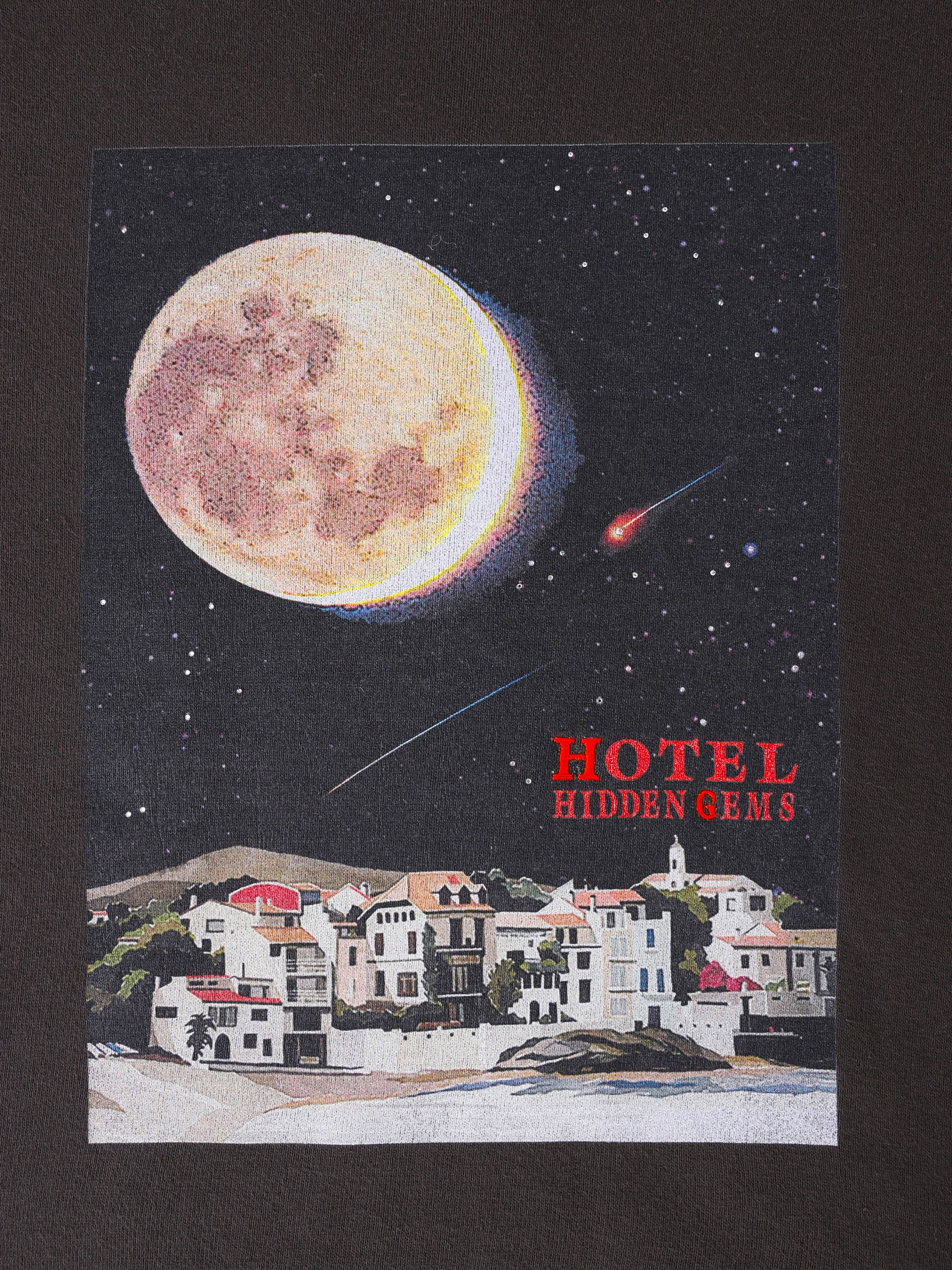 - 25FWシーズンのHidden Gemsでは、ロサンゼルスを舞台とし、LAでビンテージショップを営んでいる、大人の女性がセレクトするようなビンテージアイテムを思い描き、デザインに落とし込んだコレクションを展開します。架空のホテル『HOTEL HIDDEN GEMS』を照らす大きな月明かりを大胆に表現したグラフィックをのせたスウェットプルオーバーは、滑らかで柔らかい風合いの素材が特徴で、着込み、洗いこむことでより馴染んでいく経年変化もお楽しみいただけます。スワロフスキーで表現した煌めく星空や、さりげなく施したロゴ刺繍など、心をくすぐるこだわりの詰まったアイテムです。
