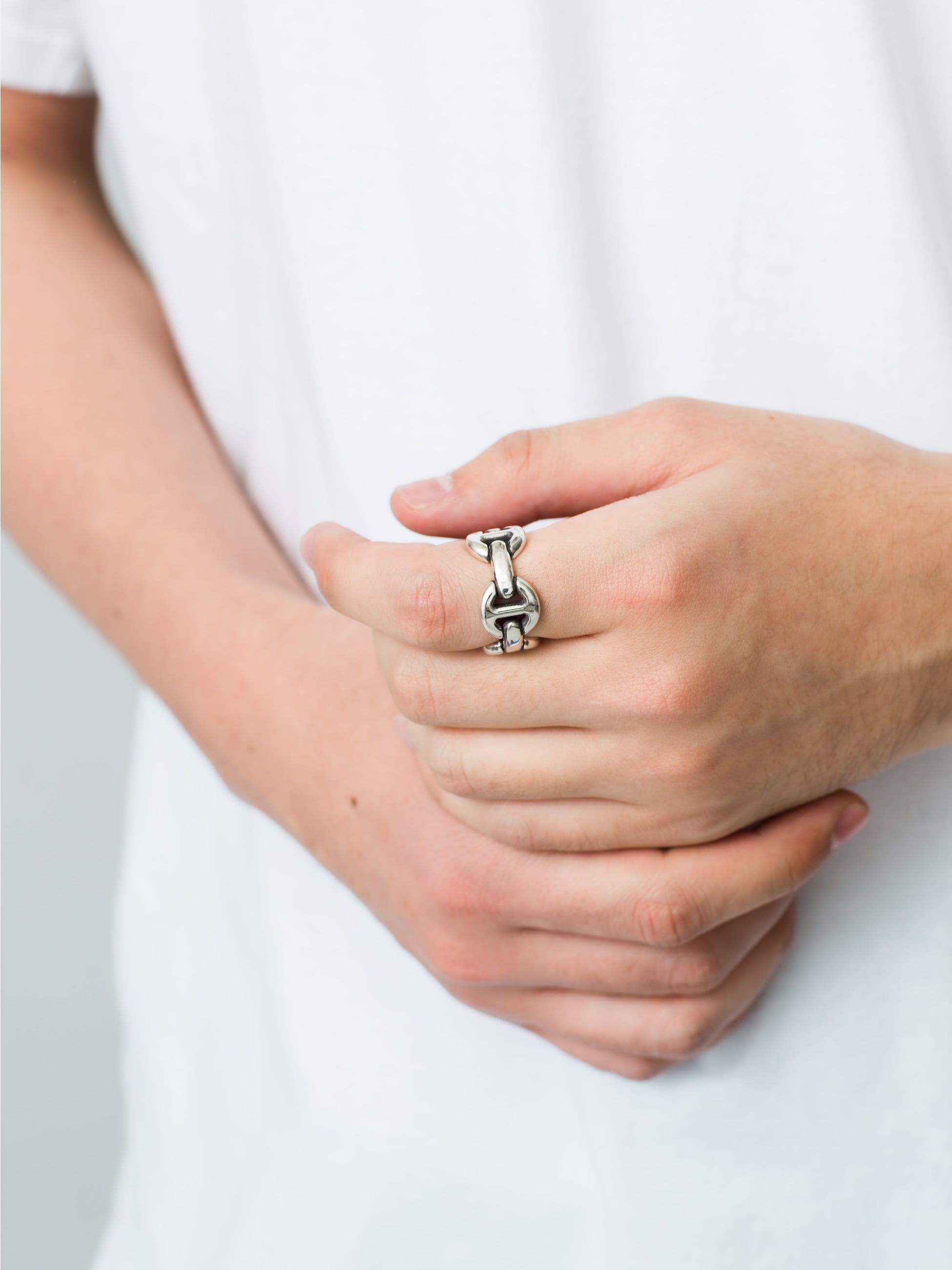- ブランドを象徴する TRI-LINKモチーフのリングで、最もボリュームのあるデザインです。ユニセックスでお楽しみいただけます。