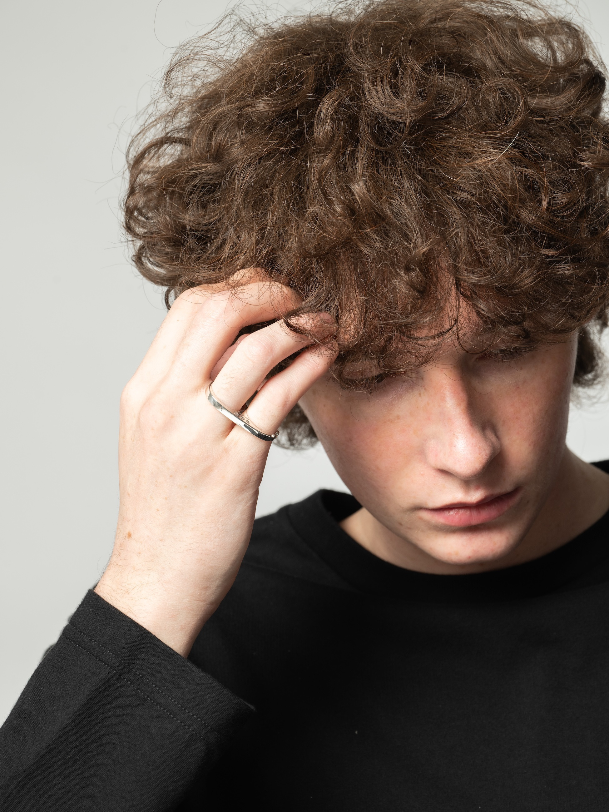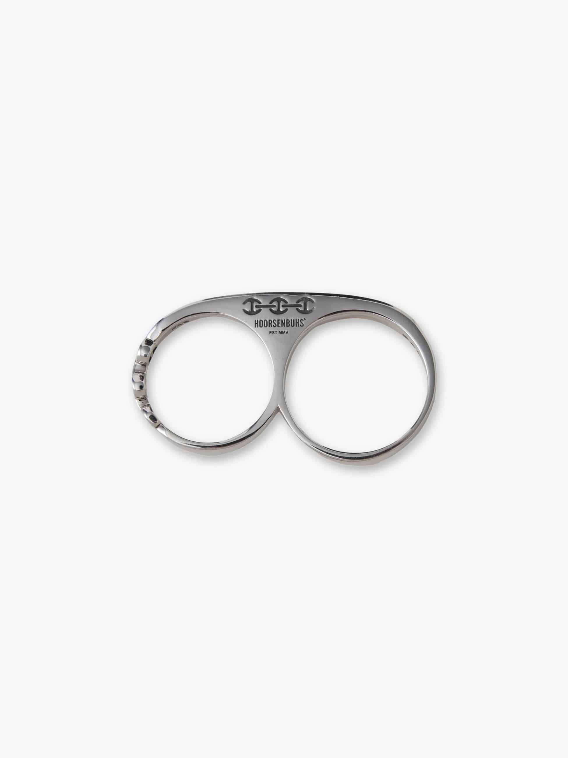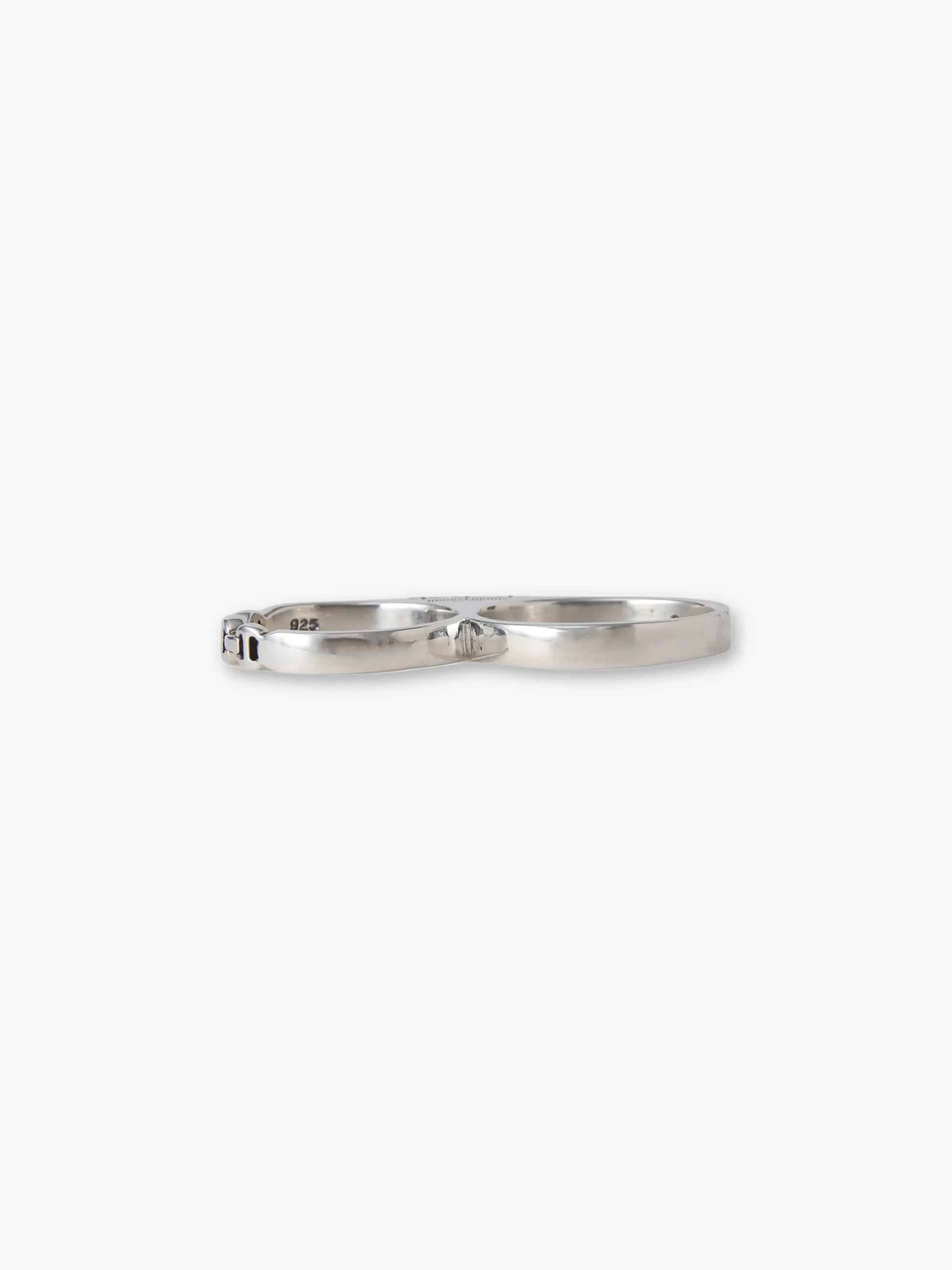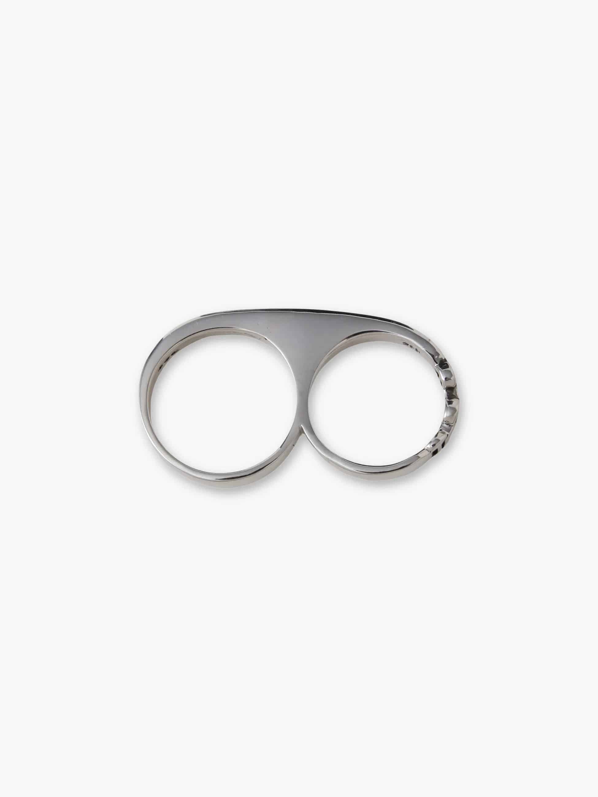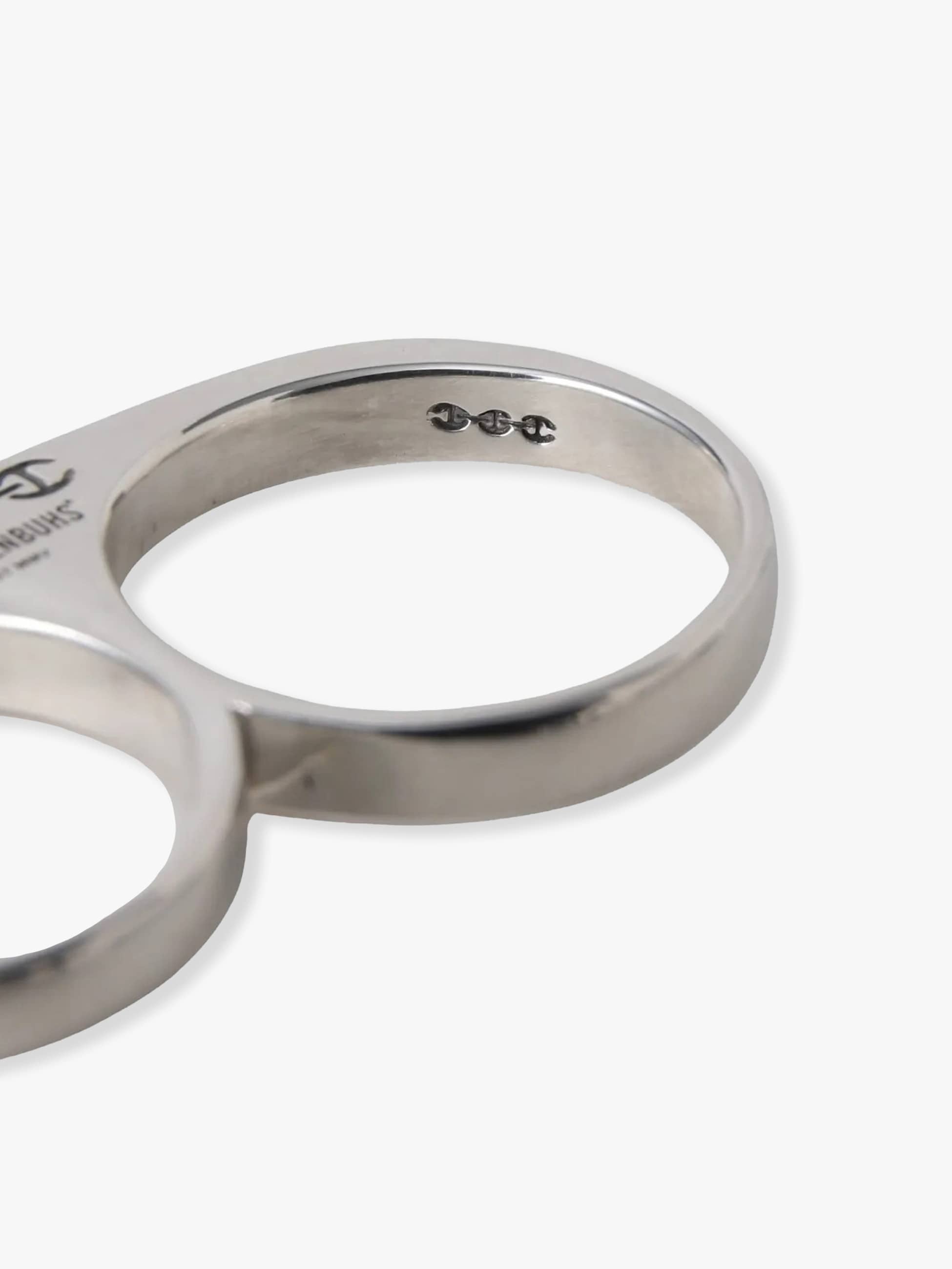 - 2本指を通すタイプのナックルリングは、外側にブランドシグネチャーであるTRI-LINKデザインが落とし込まれています。中心部分にはブランド刻印があしらわれ、手元をより印象的に演出します。
