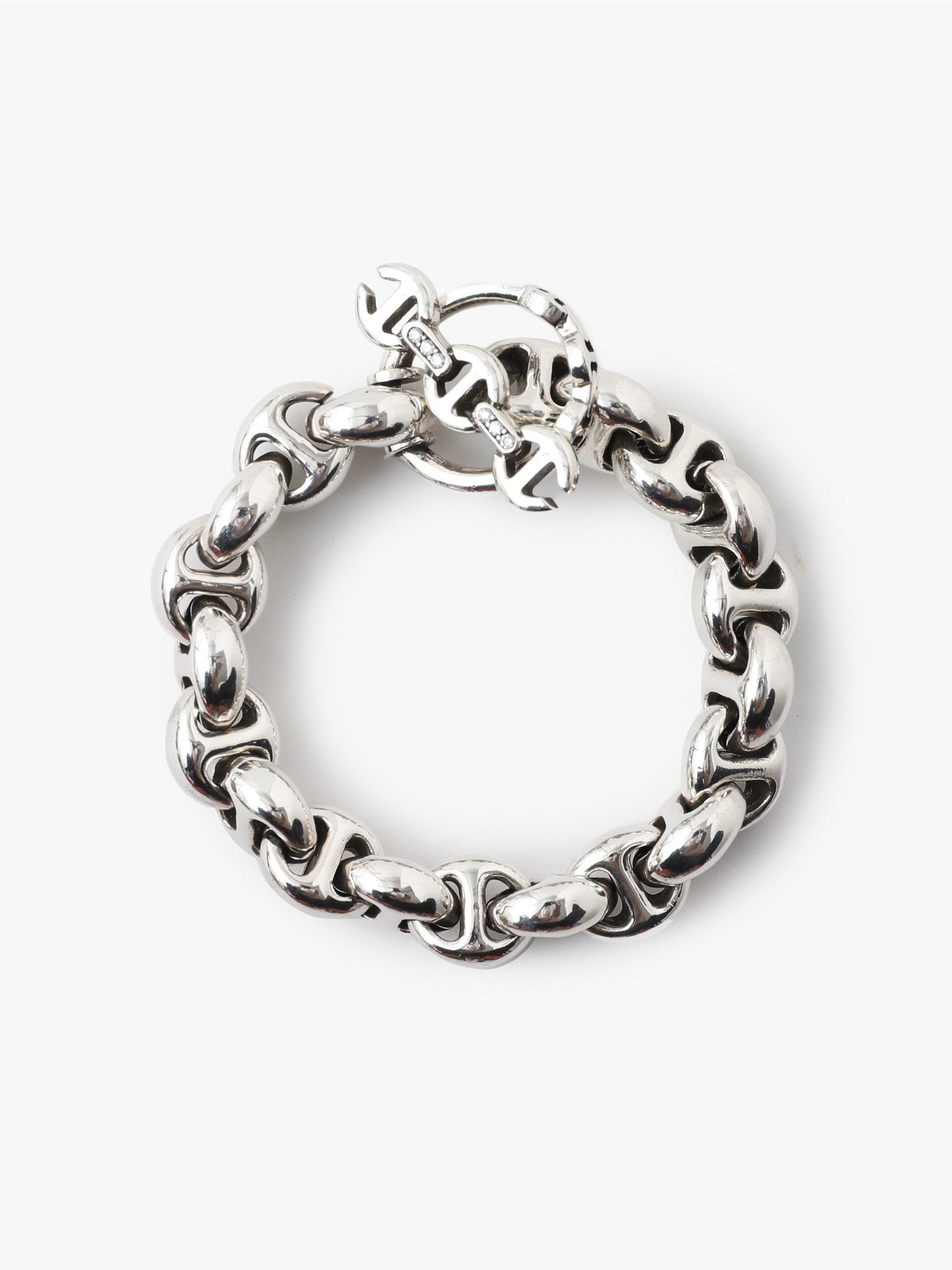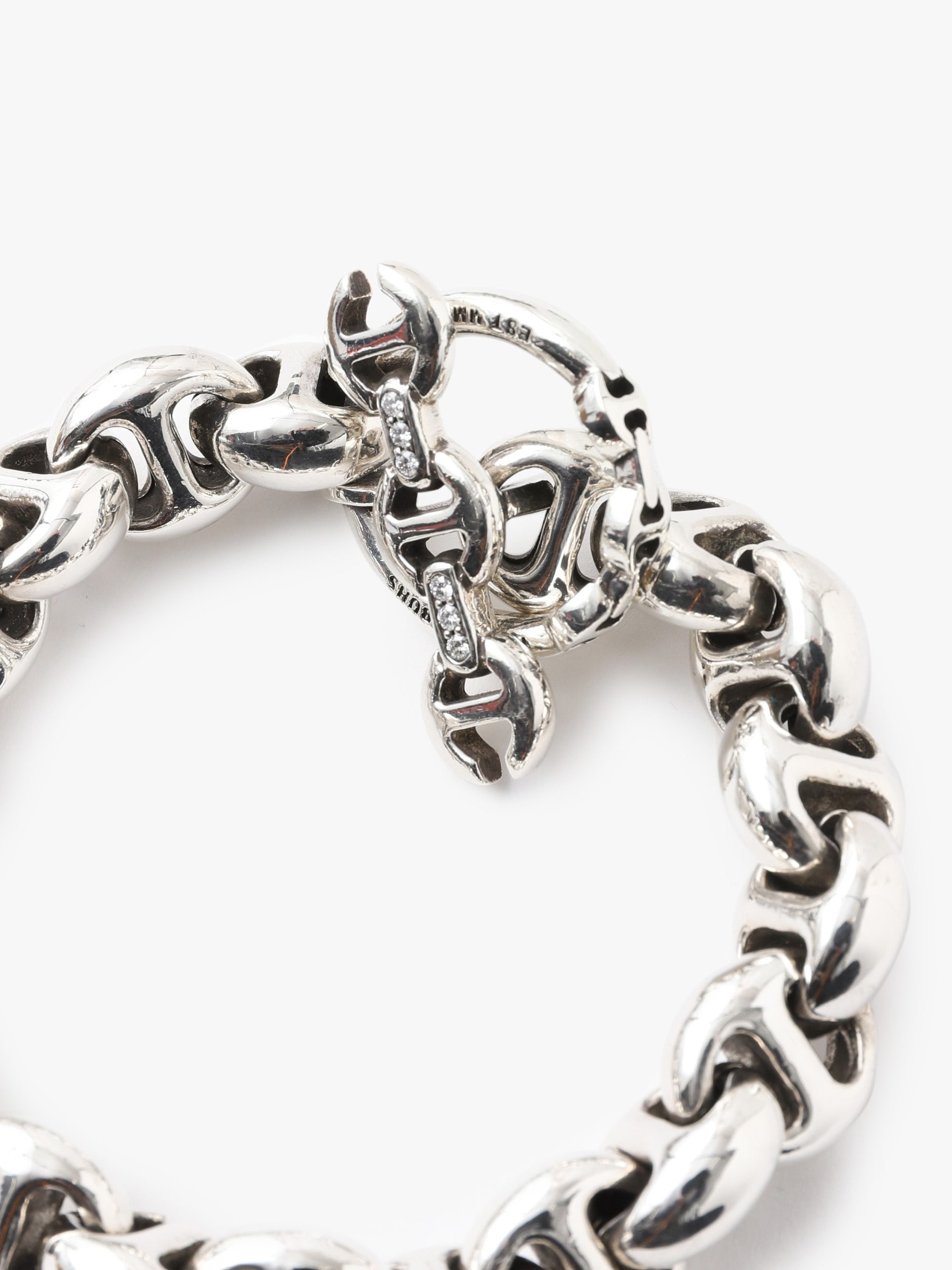- HOORSENBUHSの代表的なOPEN-LINKデザインで、最もボリュームのある15mmのブレスレットは、ひとつで存在感を醸し手元をより印象的に演出します。トグル部分にはさりげなくダイヤモンドがあしらわれています。
