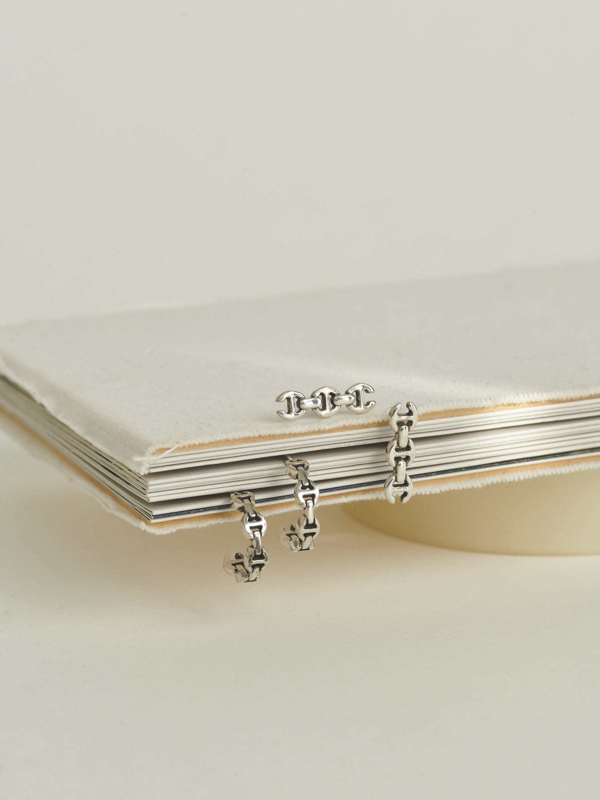 - アイコニックなマイクロアンカーチェーンリンクが特徴的な半円形のピアス。華奢なデザインですが、チェーンリンクが程よい存在感となっています。上品で風格のある雰囲気を演出します。