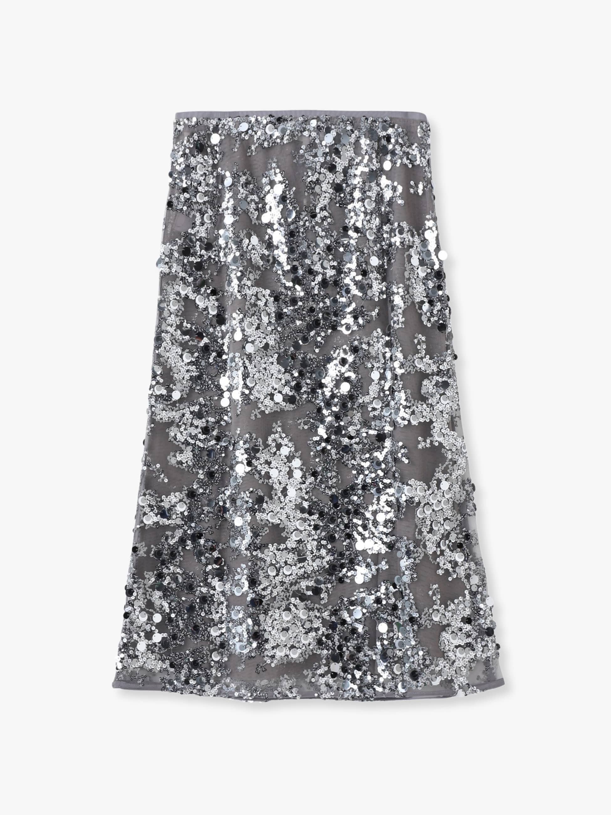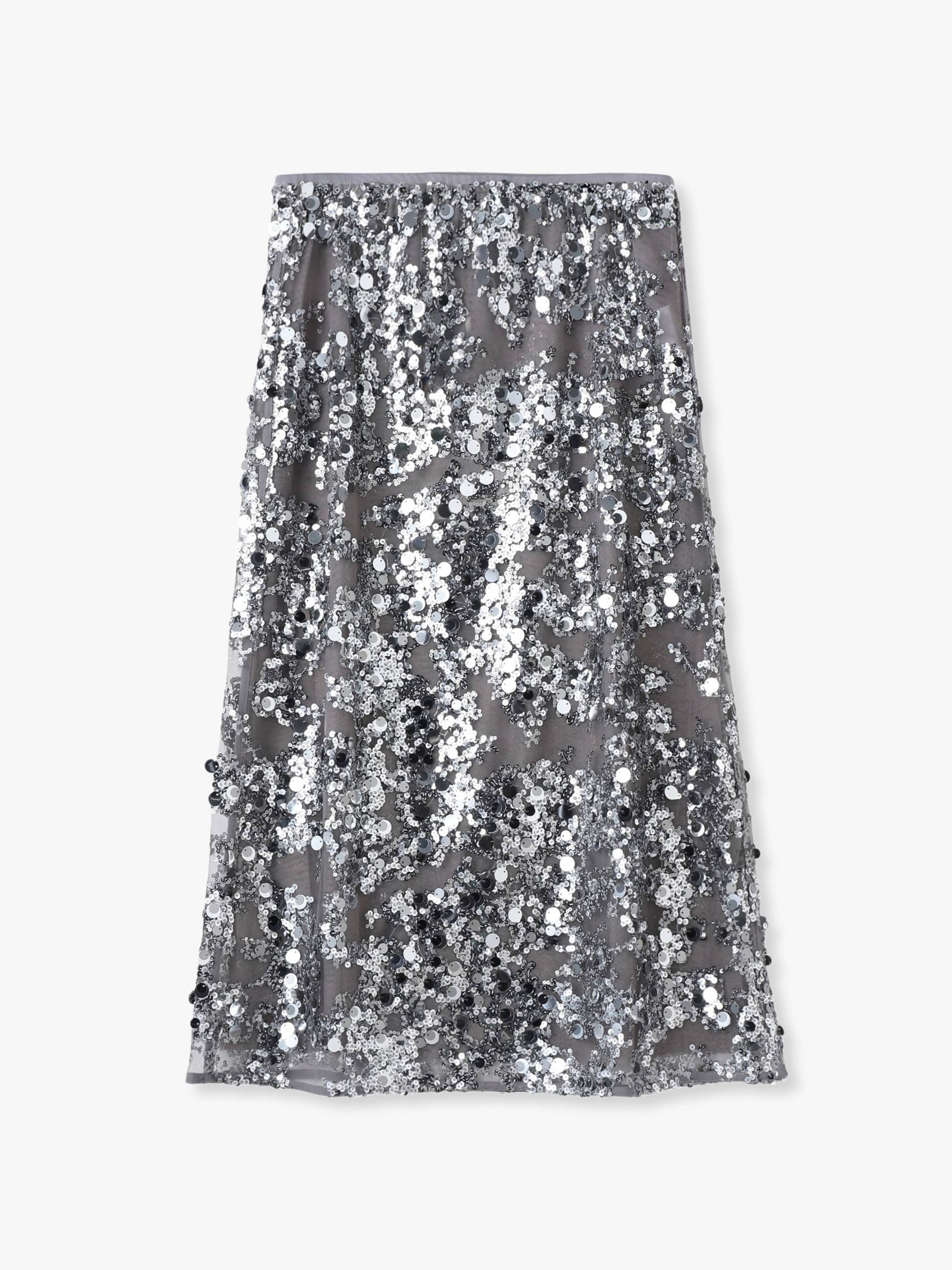 煌びやかなスパンコールが存在感抜群のミディ丈のスカートは、透け感のあるメッシュ生地で仕立てられ、伸縮性のあるウエストバンドがストレスフリーな穿き心地です。シンプルなトップスと合わせるだけで、スタイリングが華やぎ、オンオフ問わず活躍する1着です。