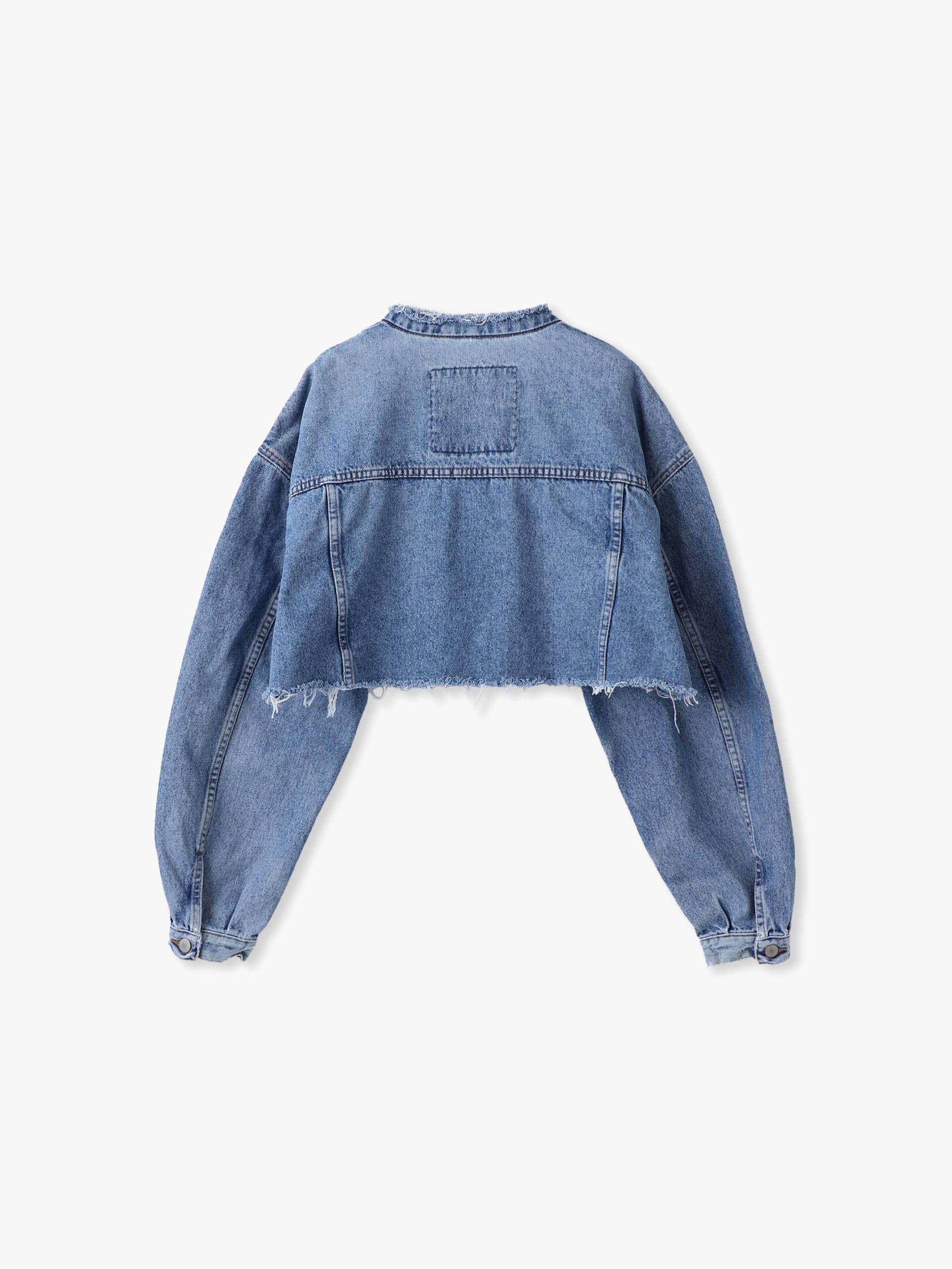 - オーバーサイズのデニムジャケットをカットし、前立てにディテールを付け加えてリフォルムした、胸下丈の超短丈デニムジャケットです。切りっぱなしの仕様を多めに配し、抜け感のあるラフな印象です。女性らしいワンピースの上から羽織っていただくスタイリングも素敵です。