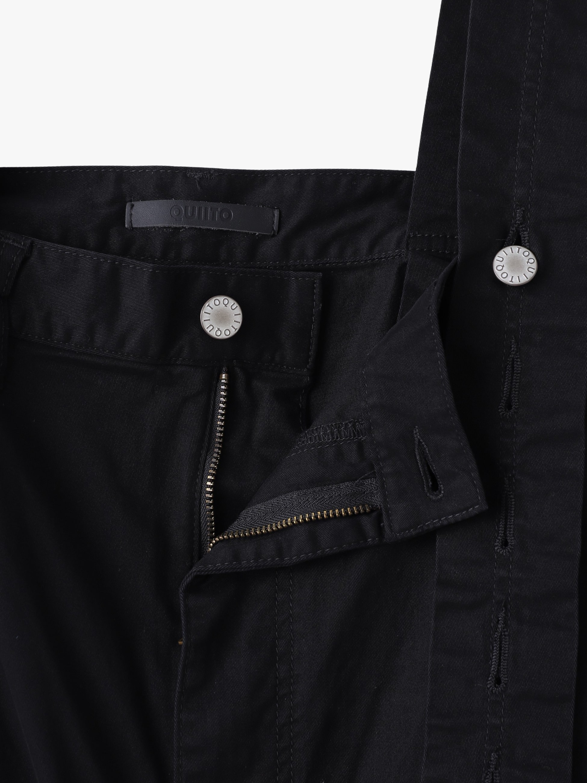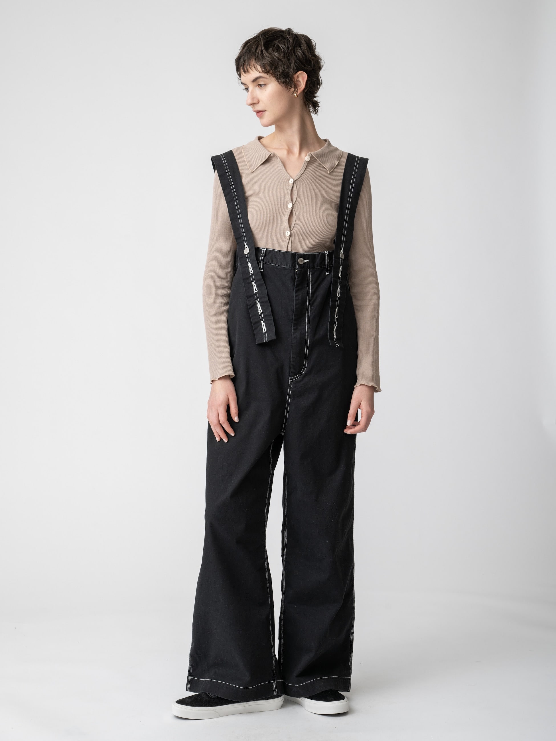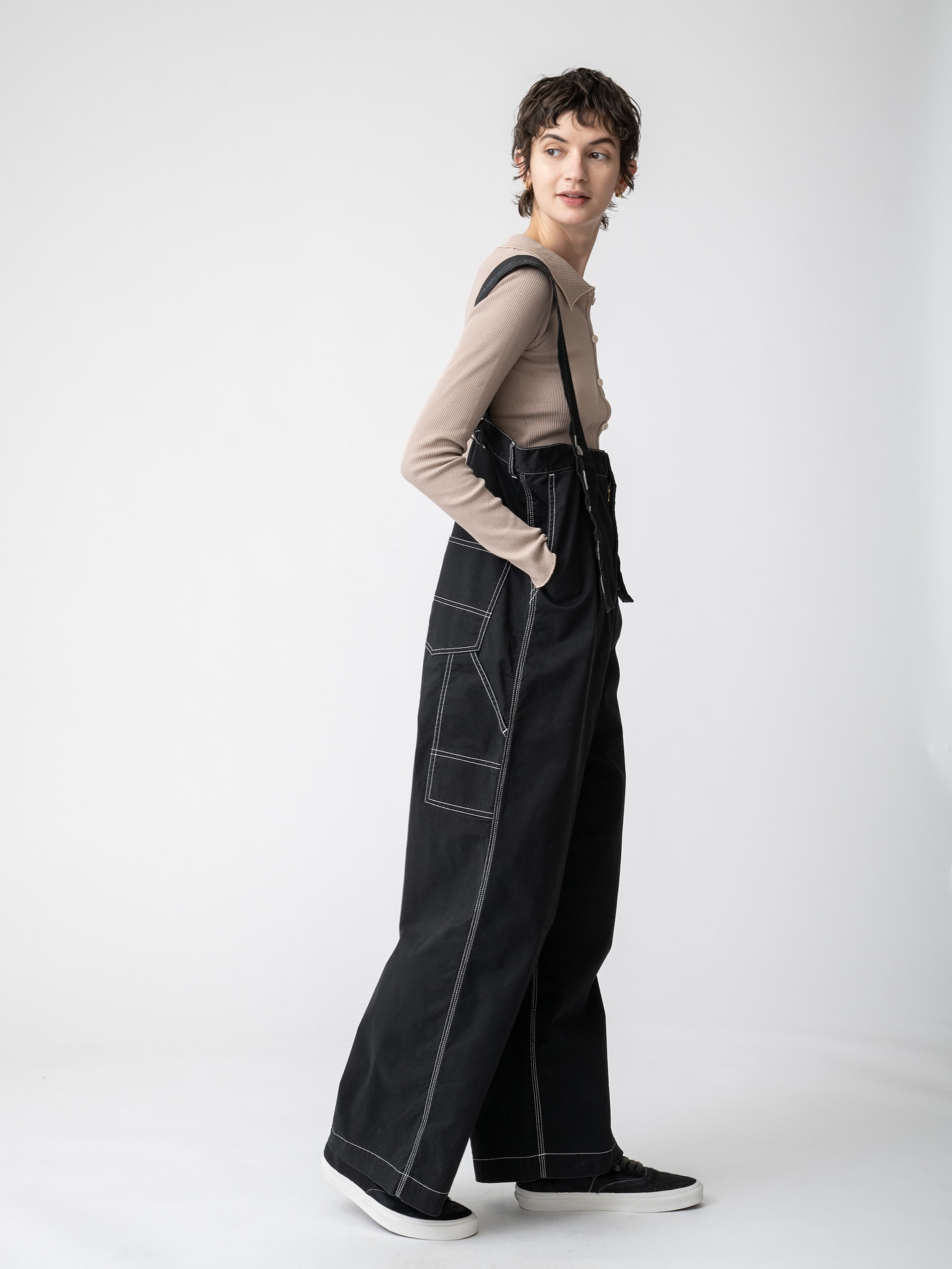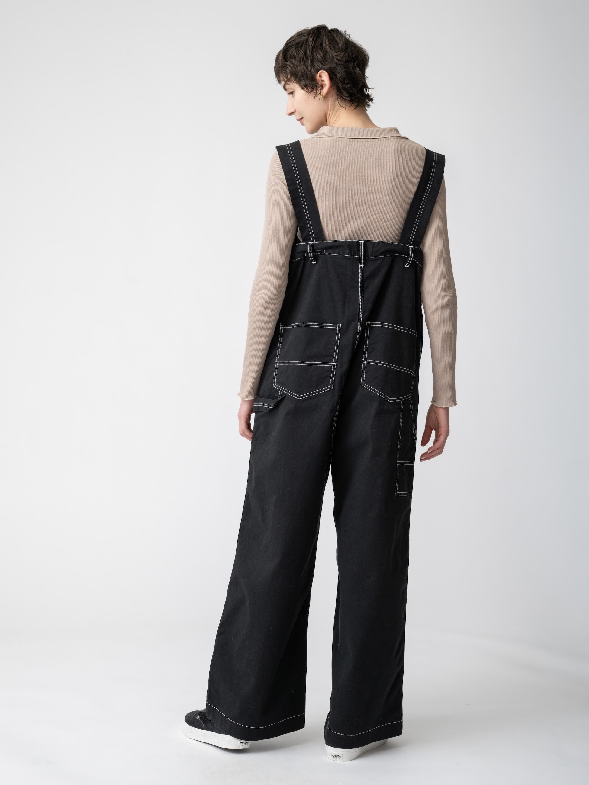 - ワークウエアをベースに、適度なストレッチ性を加え、ラフな印象に仕立てたオーバーオールです。ショルダー部分はボタン仕様で、着丈の調節が可能なのも嬉しいポイント。ルーズに落として着ても、ややコンパクトに整えてもバランスよく決まります。ウエストにレザーベルトを巻いていただくのも素敵です。
