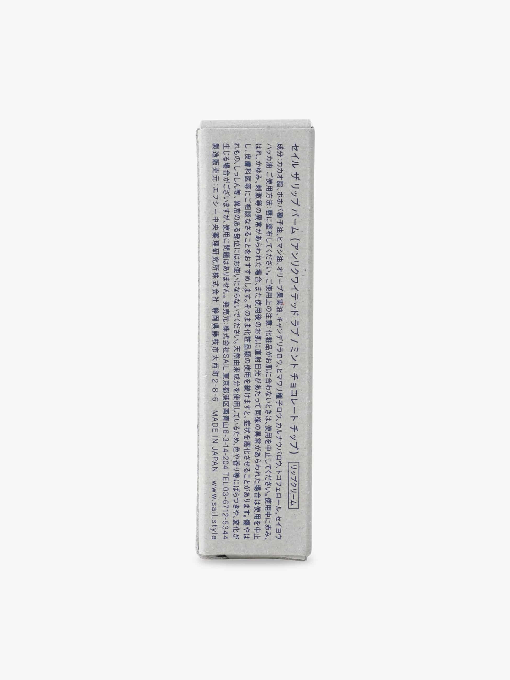 - カカオ脂、ホホバ種子油、ヒマシ油、オリーブ果実油、キャンデリラロウ、ヒマワリ種子ロウ、カルナウバロウ、トコフェロール、セイヨウハッカ油