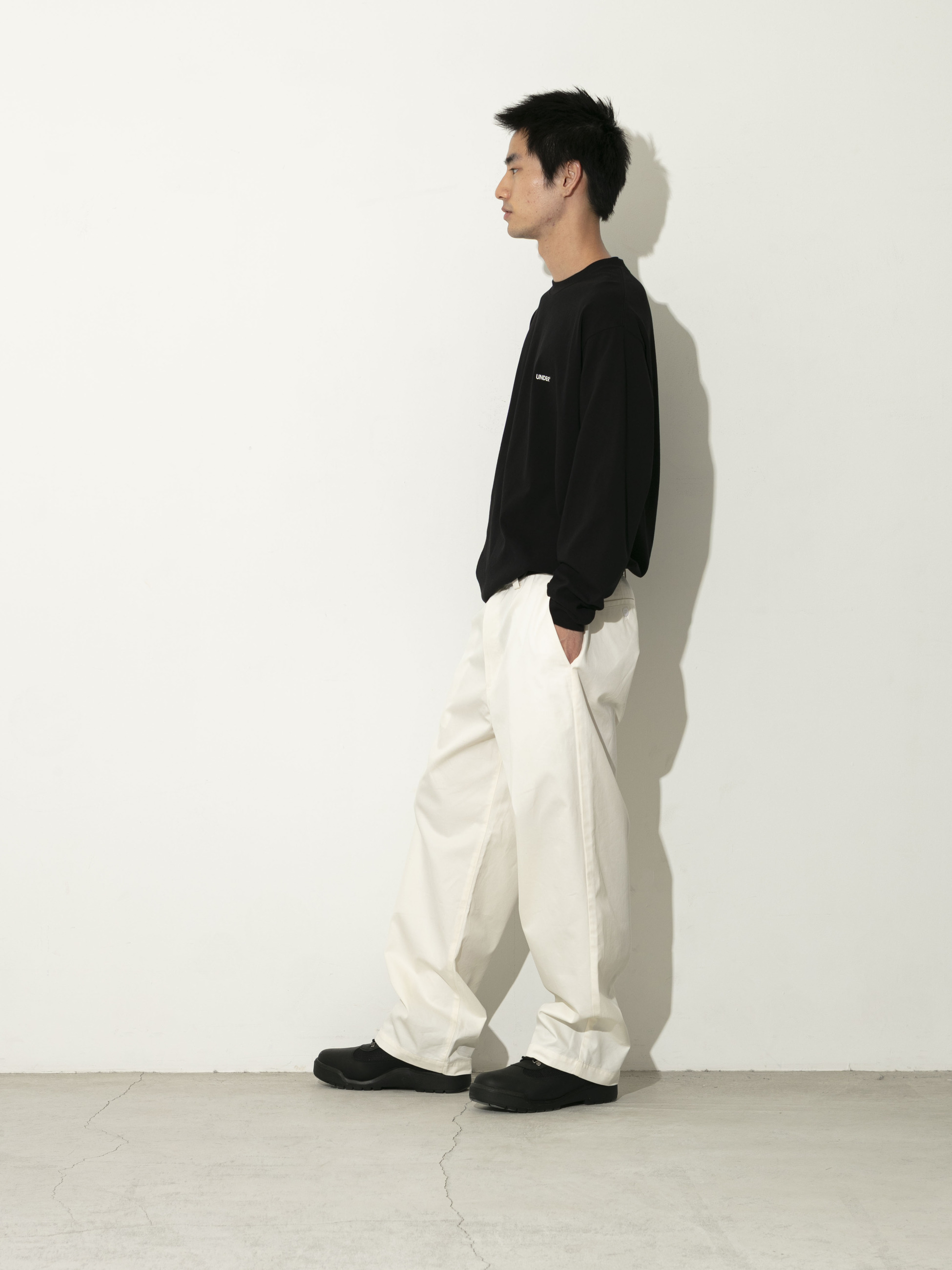 - コーマ糸を使用したコットンギャバジン生地のパンツ。2本の細かい糸を撚り上げた双糸を高密度で織り上げた生地は、耐久性が高く、きれいな表情の綾目が特徴です。また、さらっとした肌触りや軽やかな穿き心地は、様々な時季で活躍します。ゆったりとしたワイドフィットは、、シンプルなコーディネートに取り入れやすく、汎用性の高い一着です。