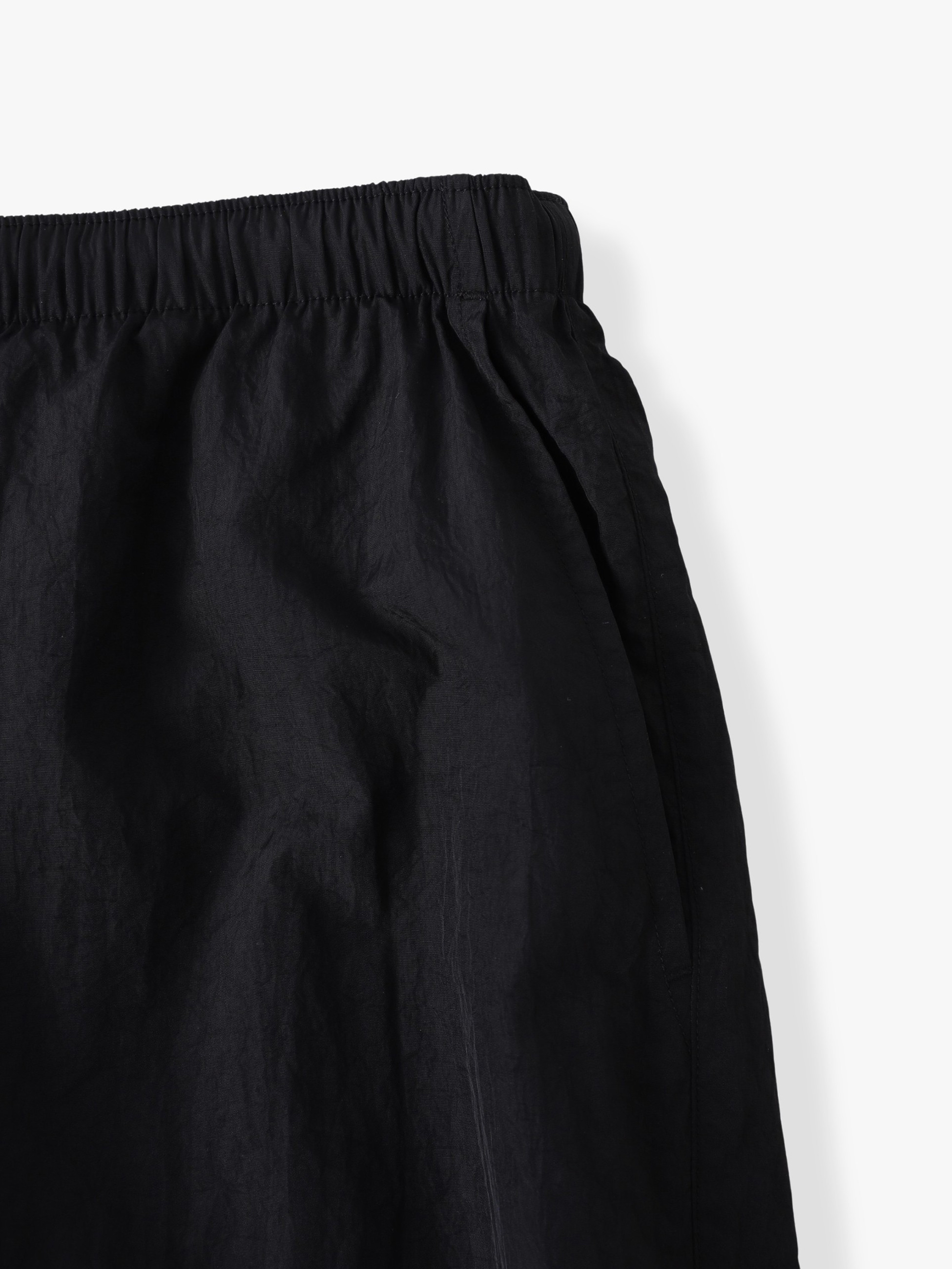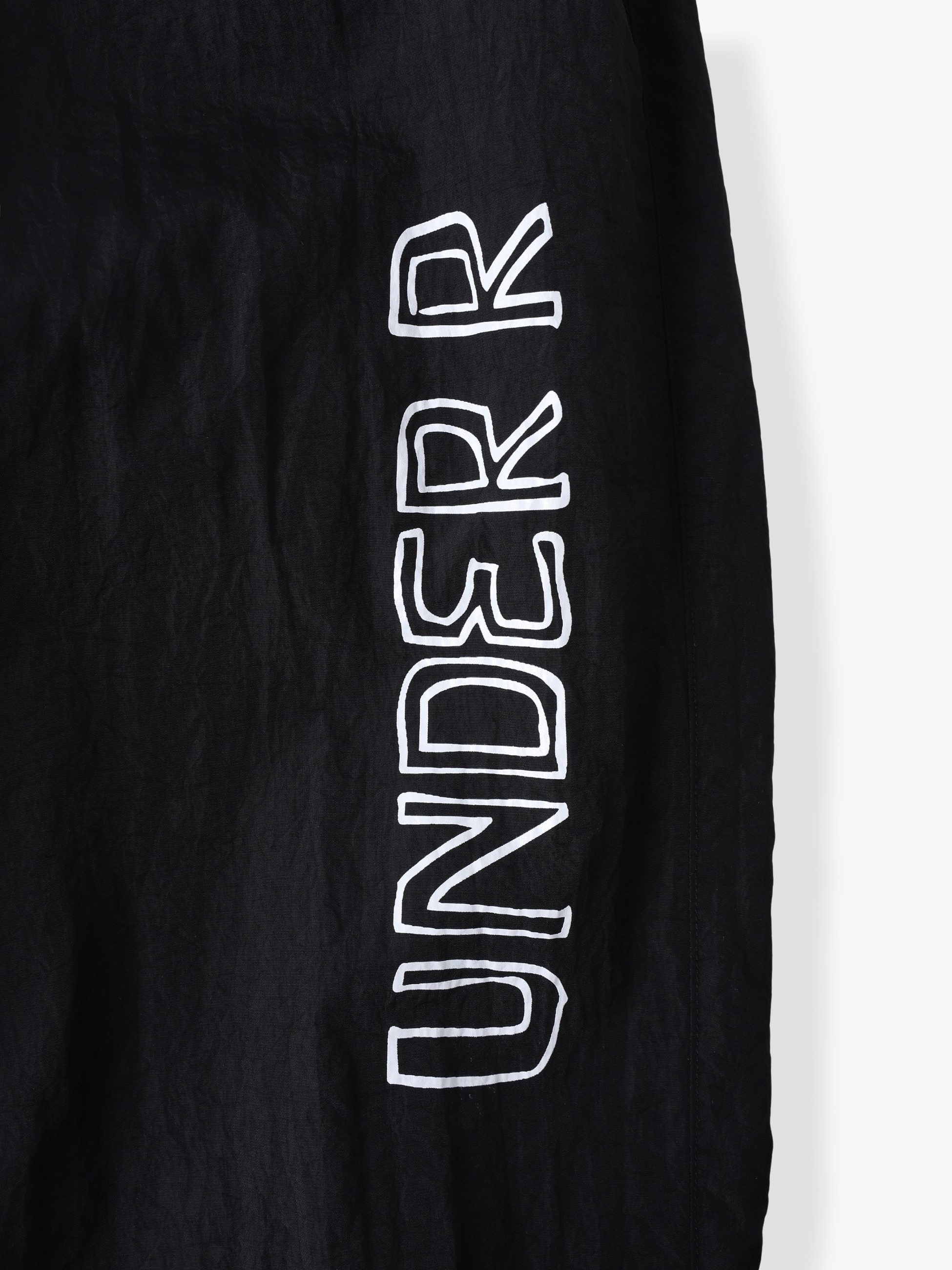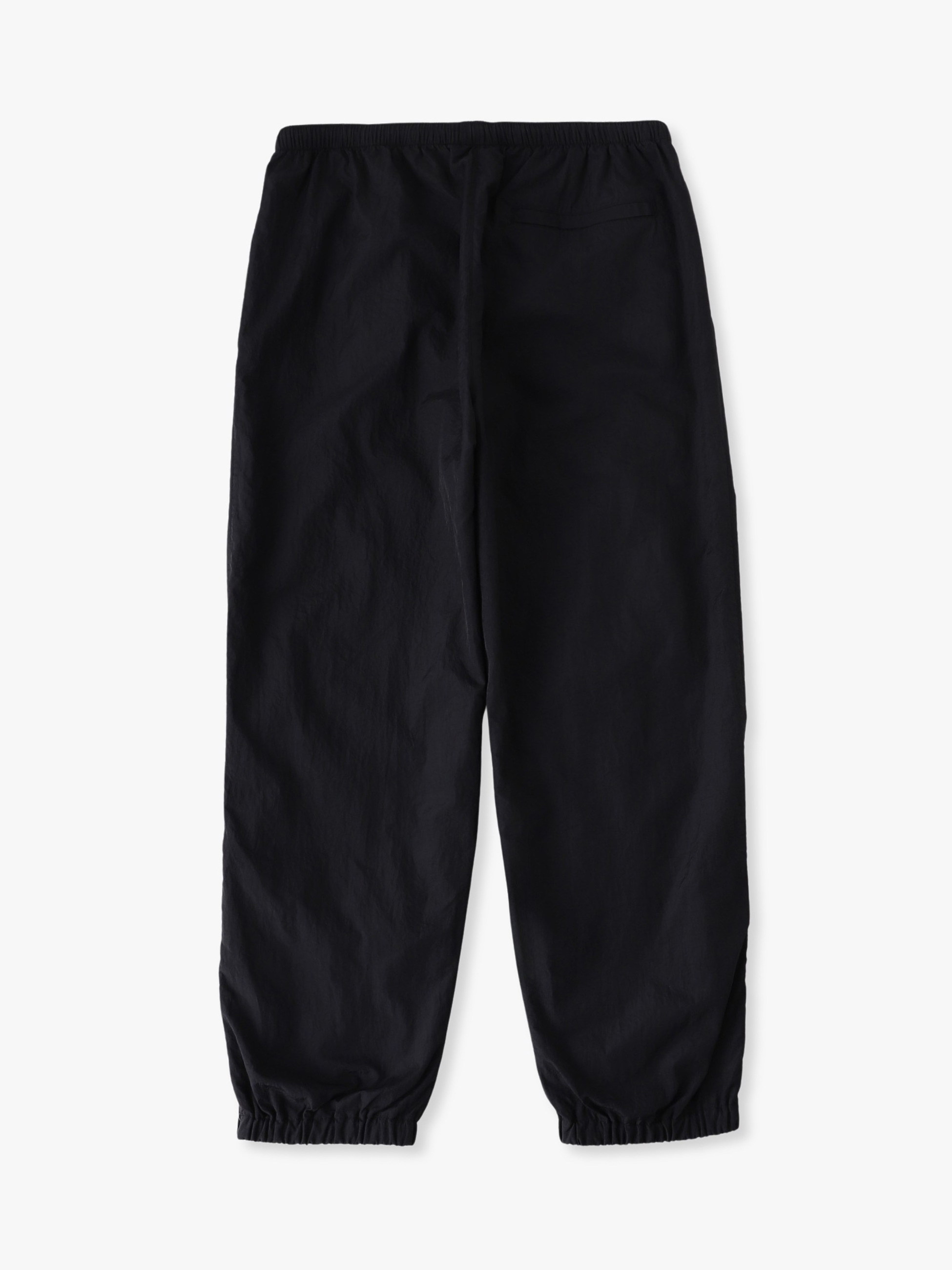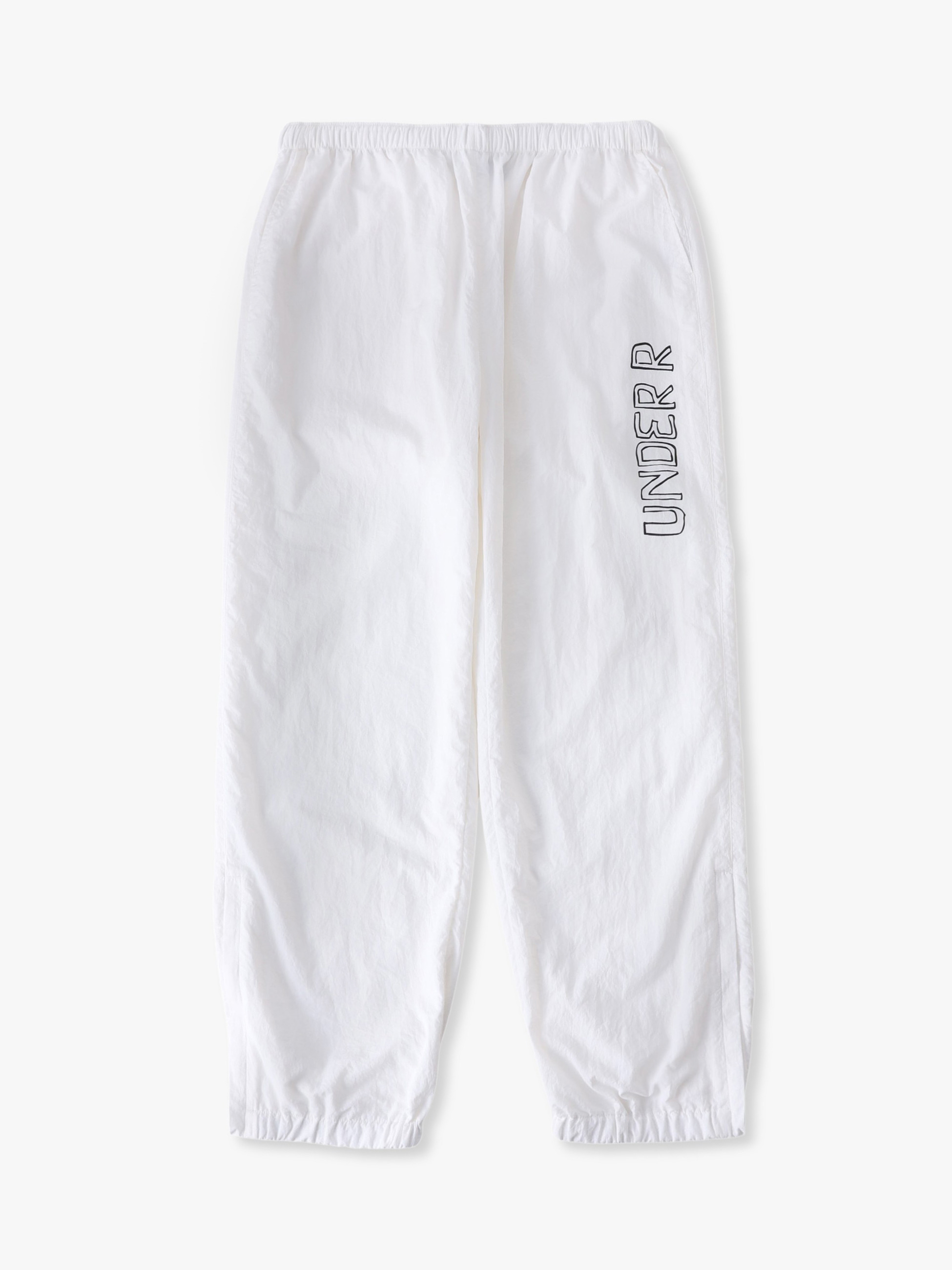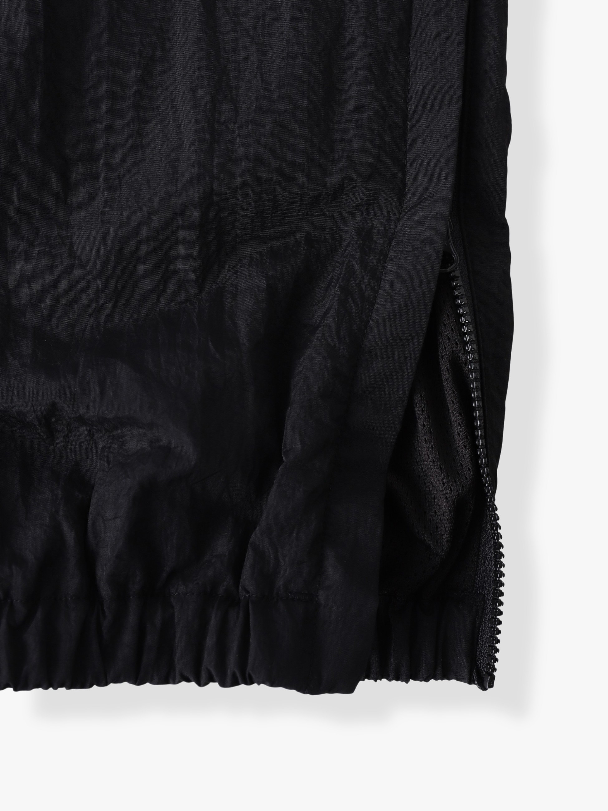 ナイロン素材を使用したトラックパンツは、裏地にポリエステルメッシュを配したさらっとした快適な着心地が特徴です。また、フロントには、90年代初頭よりスケートインダストリーでアーティストとして活動し、社会や政治的メッセージを込めた過激かつユーモラスな作風で知られるアーティストである「トッド・フランシス」による、オリジナルで製作されたフォントをプリントしたデザインがアクセントになっています。シルエットに変化を付けられる裾に配したジップとゆったりとしたフィットは、デイリーユースしやすい一着です。
