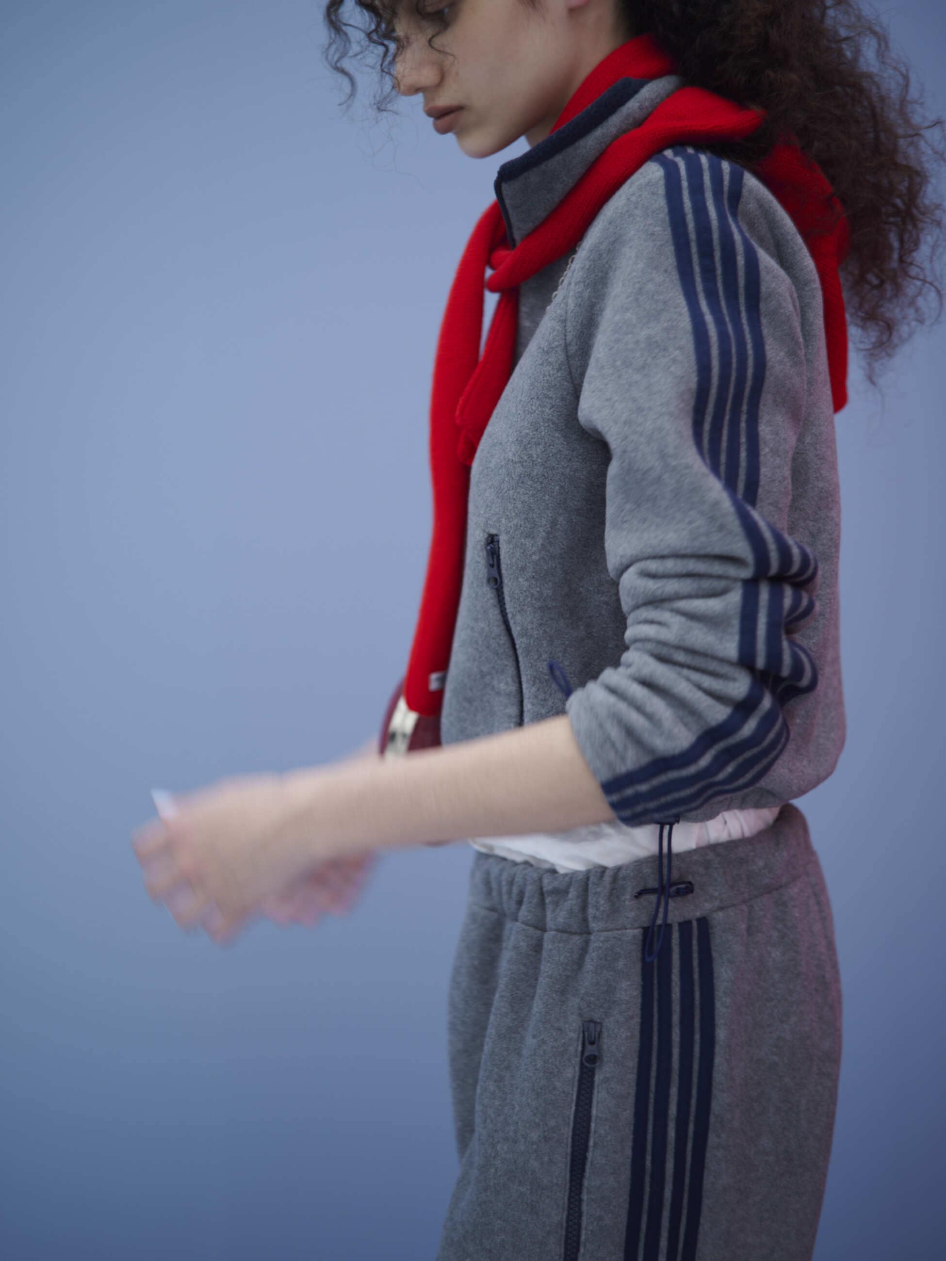 - INSCRIREインラインコレクションのフリーストラックジャケットとトラックパンツを、charcoal gray×navyのカラー配色、ポリエステルとレーヨン繊維を使用した素材でRHC ロンハーマンで別注しました。耐久性と速乾性が高いポリエステルにレーヨンが加わることで、落ち感とドレープ感がプラスされ、抜け感のあるシルエットが完成。そして、フリースの毛足を短くタンブラー加工をすることで、ピリングが発生しにくい仕様に。また、ポイントの4本ラインは、生地の特性上、手の込んだ縫製技術が必要とされるデザインで、こだわりの詰まった仕上がりに。セットアップでスポーティーなスタイリングはもちろん、スカートやドレスをレイヤードして、スポーツアイテムにレディースの要素を取り入れたスタイリングをお楽しみください。