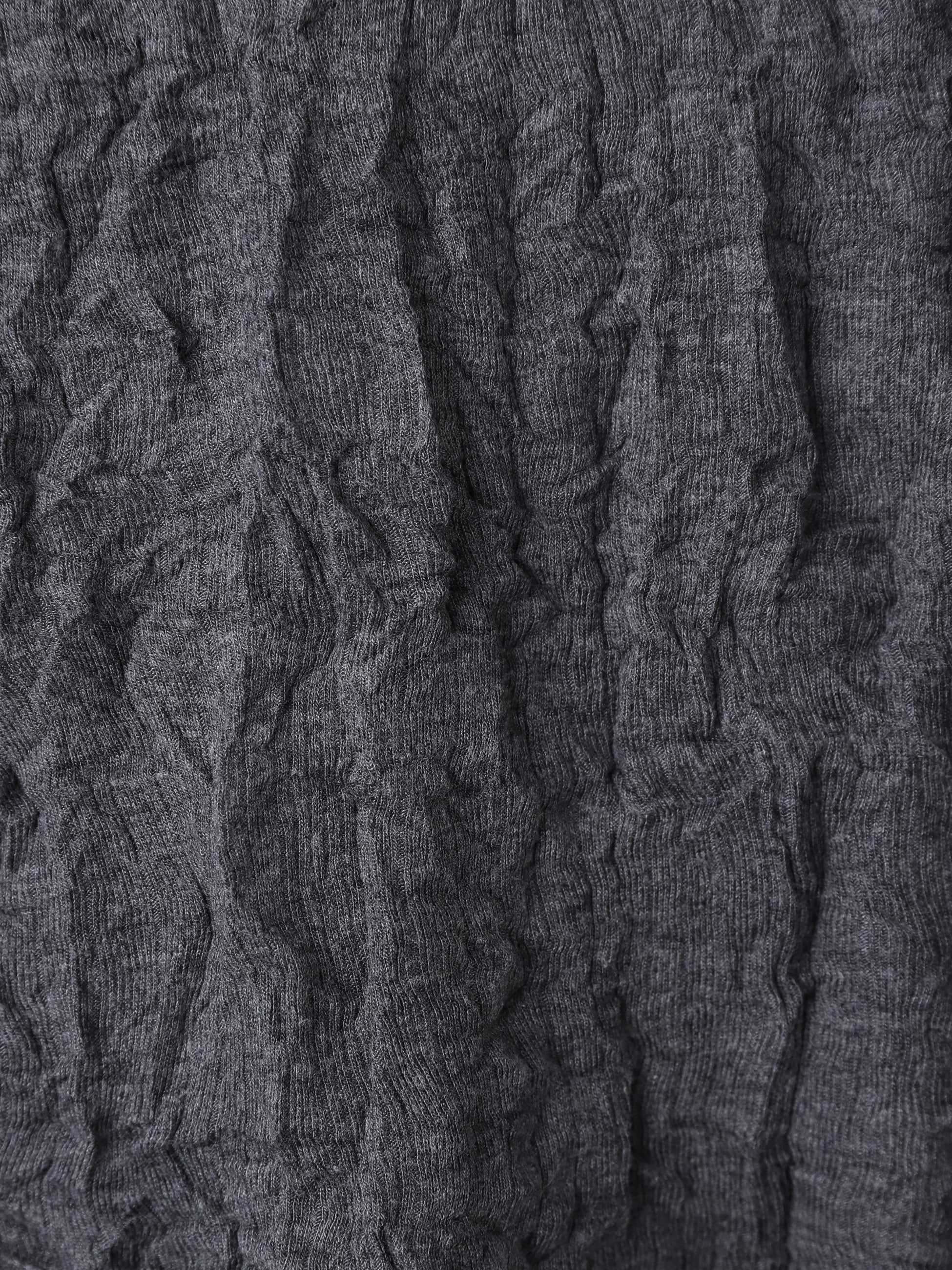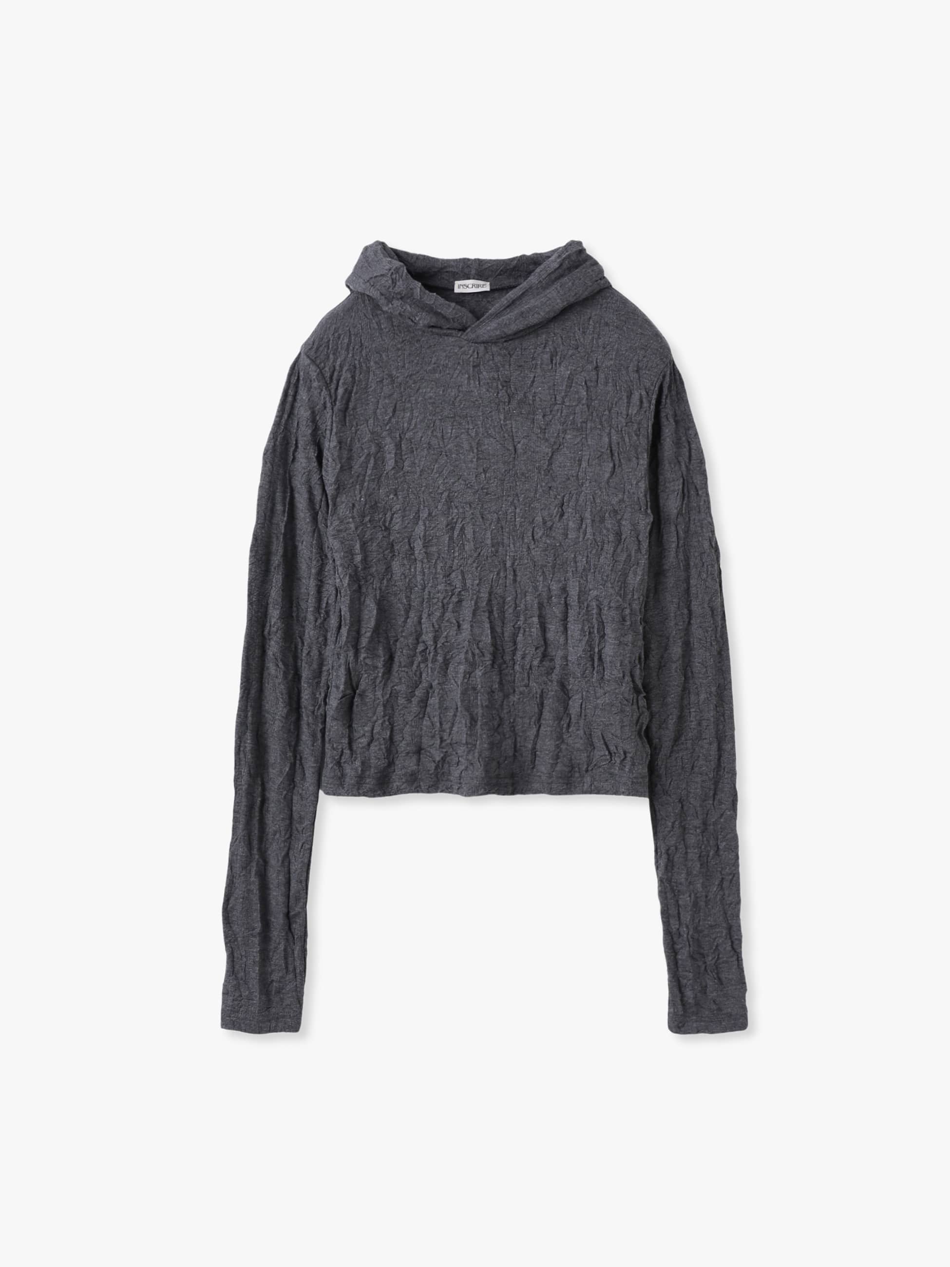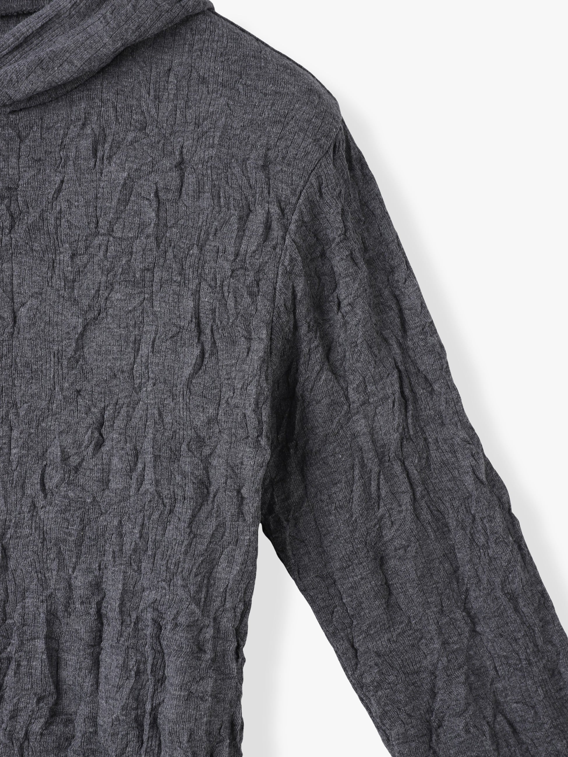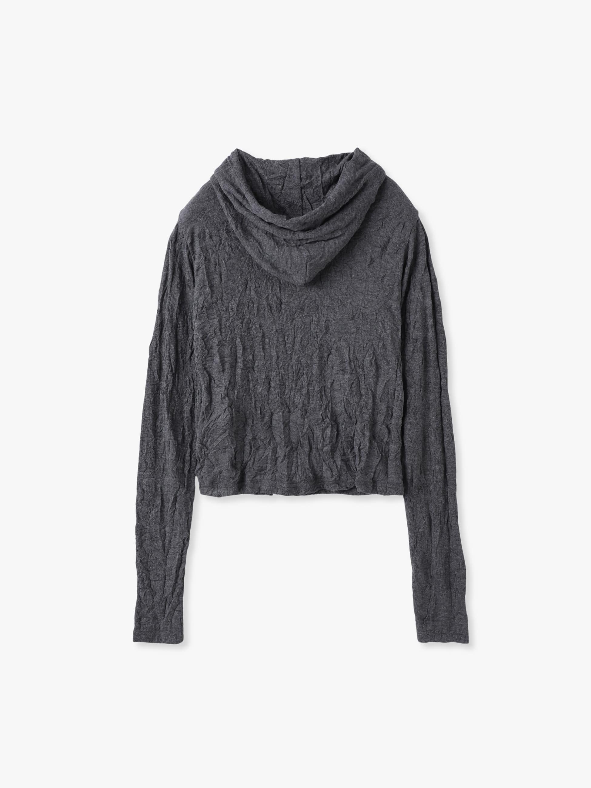 生地の風合いが目を惹くフーディーは、職人によって針を一本ずつ抜いて作られたハリ抜き柄にシワ加工を施すことで、独特の立体感を生み出しています。タイトフィットなサイズ感で、一枚でも、インナーとしても活躍します。