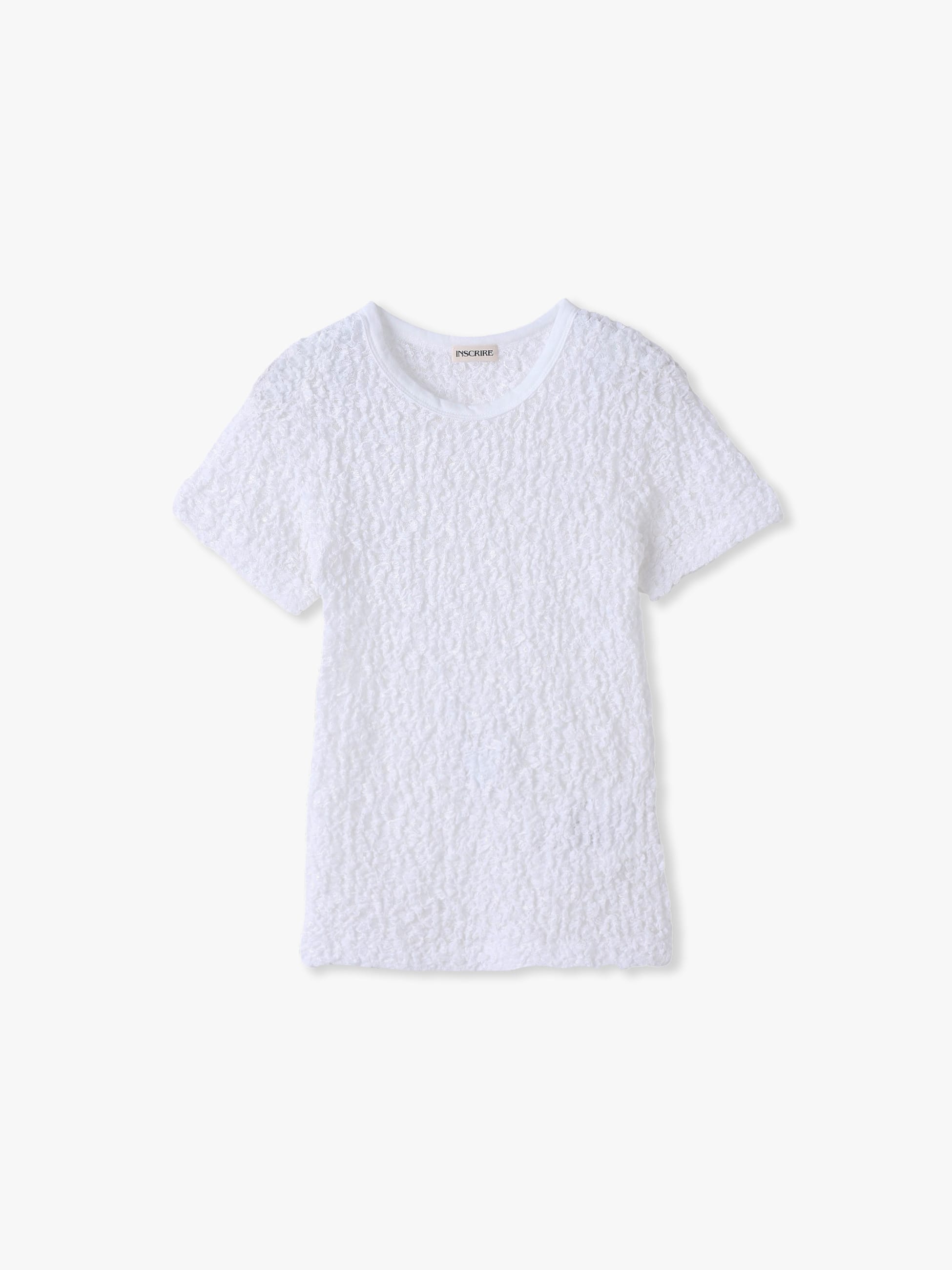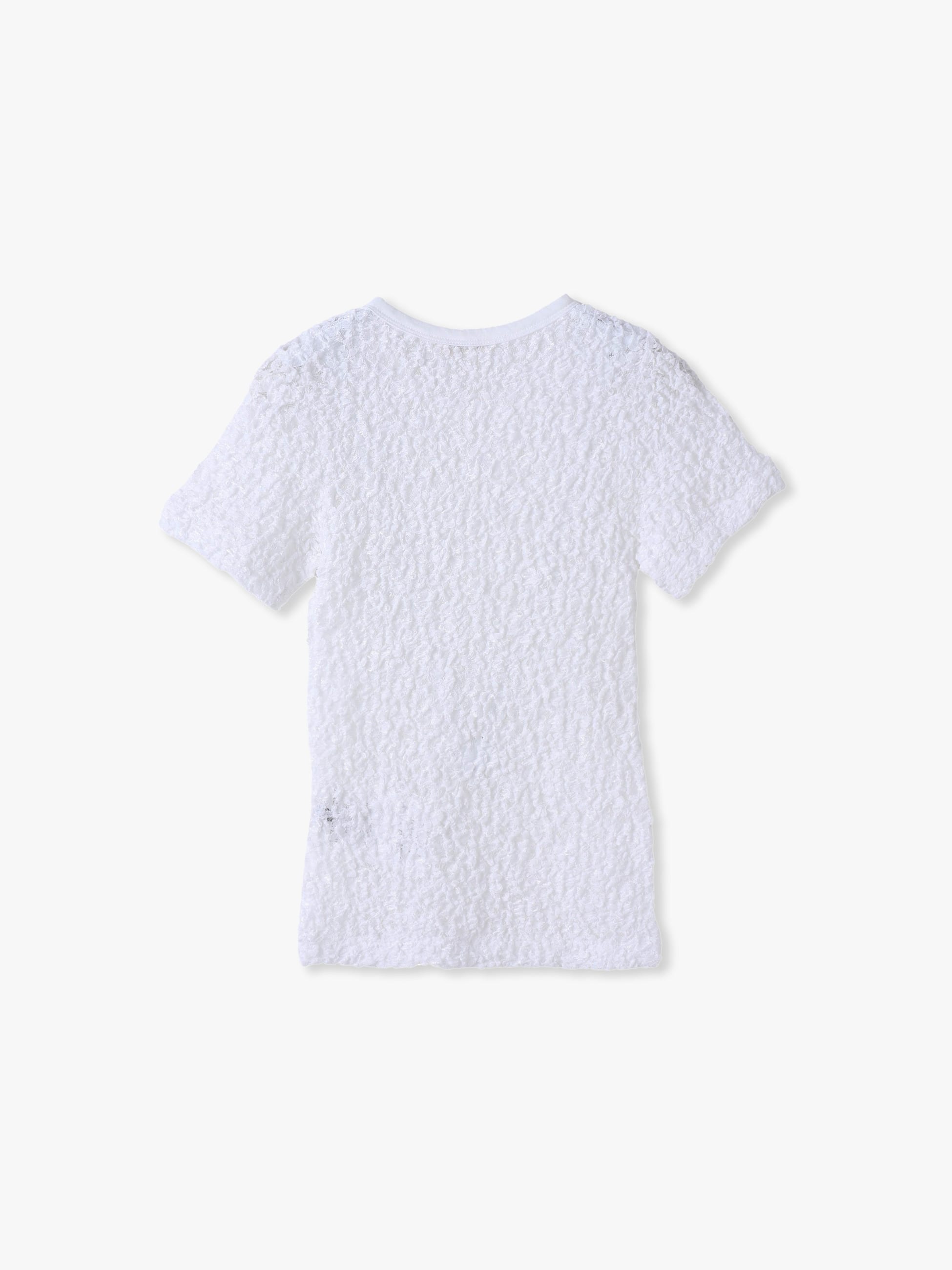 立体感のある美しいレース生地で仕立てられたTシャツは、伸縮性があるため身体にフィットするミニマルなサイジングで、襟元のパイピングがシルエットをキープします。ボリュームのあるボトムとも好相性で、インナーの透け感もお楽しみいただけます。
