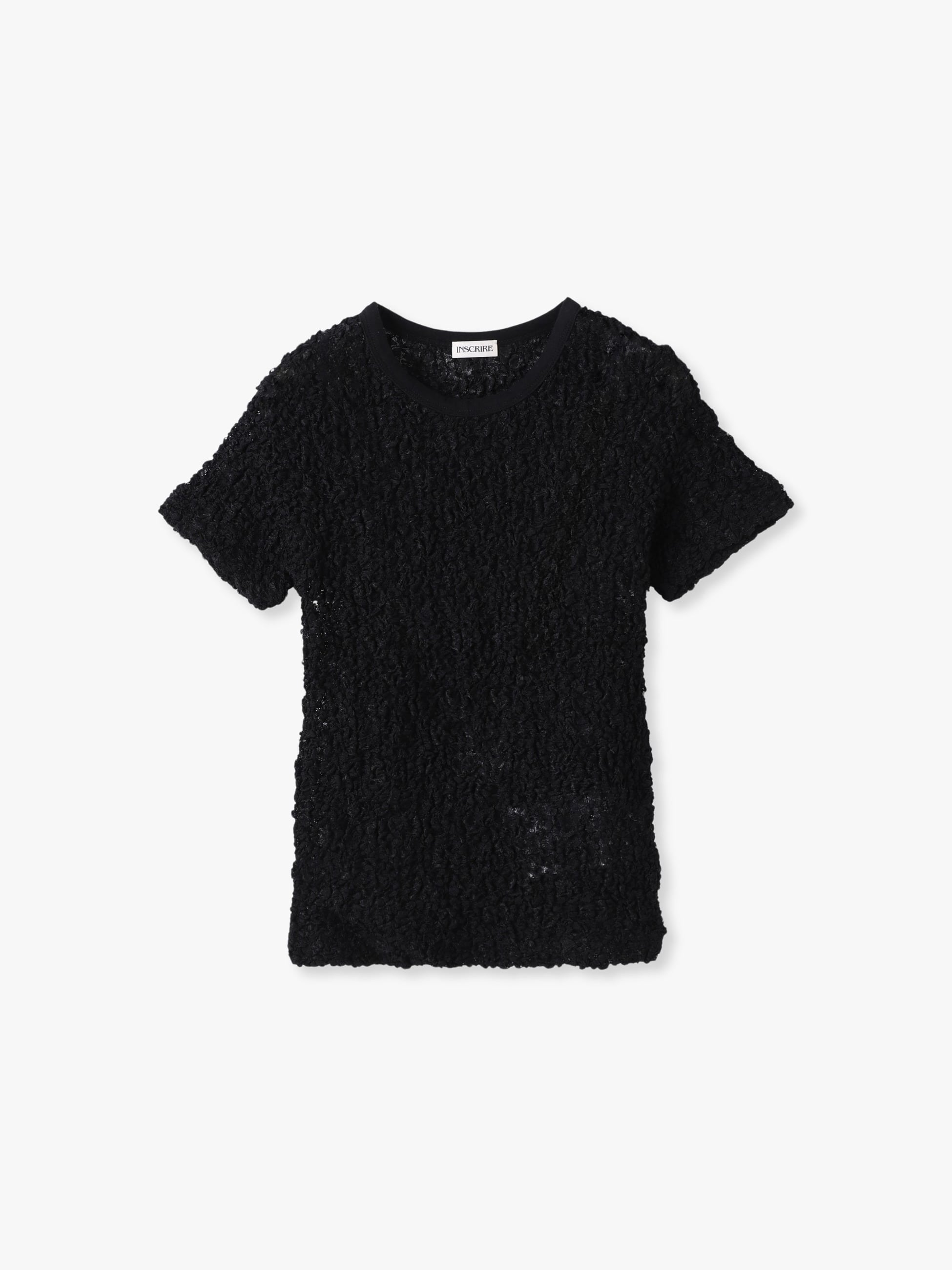 - 立体感のある美しいレース生地で仕立てられたTシャツは、伸縮性があるため身体にフィットするミニマルなサイジングで、襟元のパイピングがシルエットをキープします。ボリュームのあるボトムとも好相性で、インナーの透け感もお楽しみいただけます。
