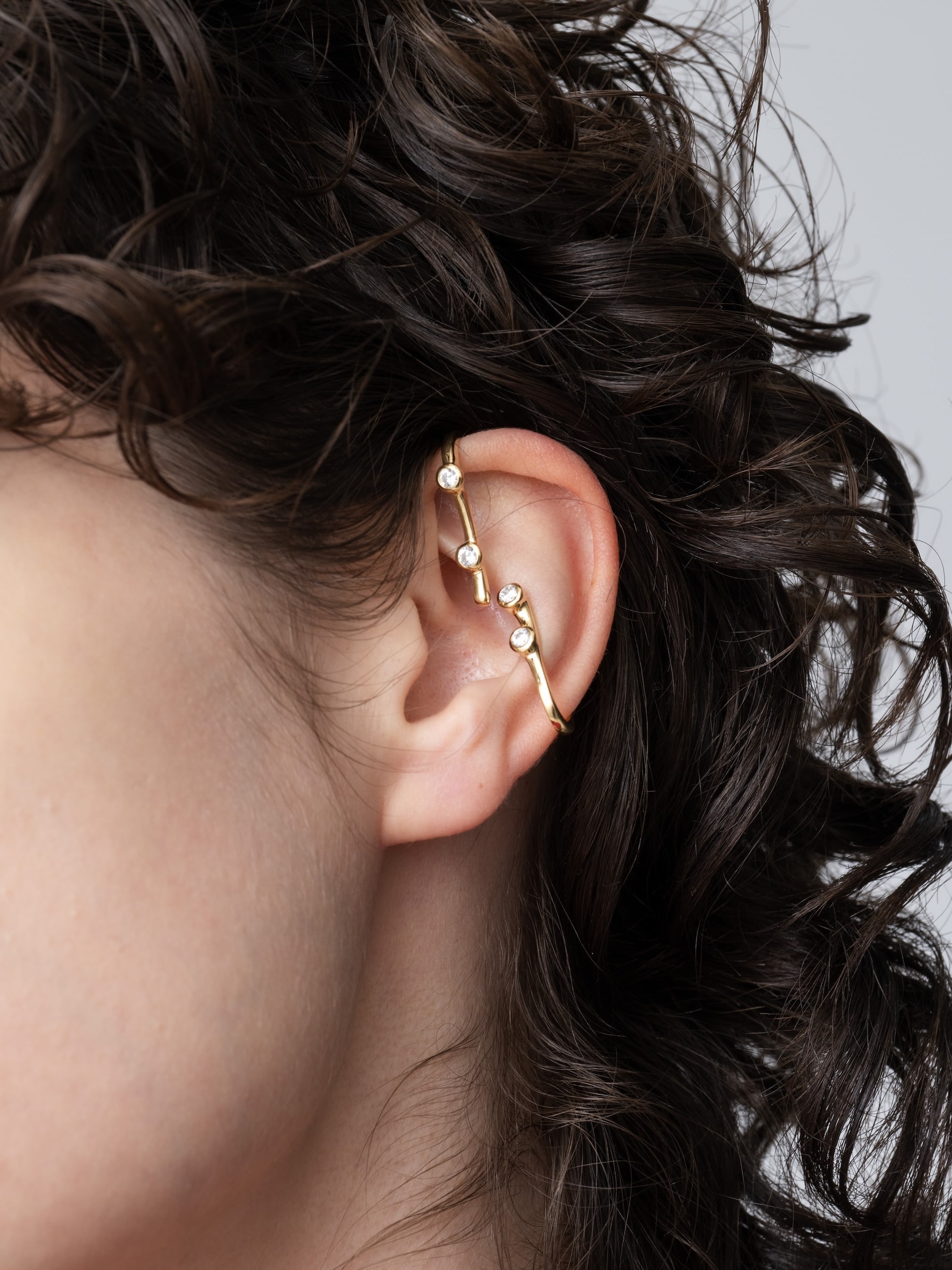 - 有機的なラインで表現されたイヤーカフは、光や粒子を散りばめたイメージで、顔周りをより印象的に演出します。左右どちらの耳にも着用でき、片耳デザインのため、お手持ちのピアスやイヤリングとのレイヤードもお楽しみいただけます。