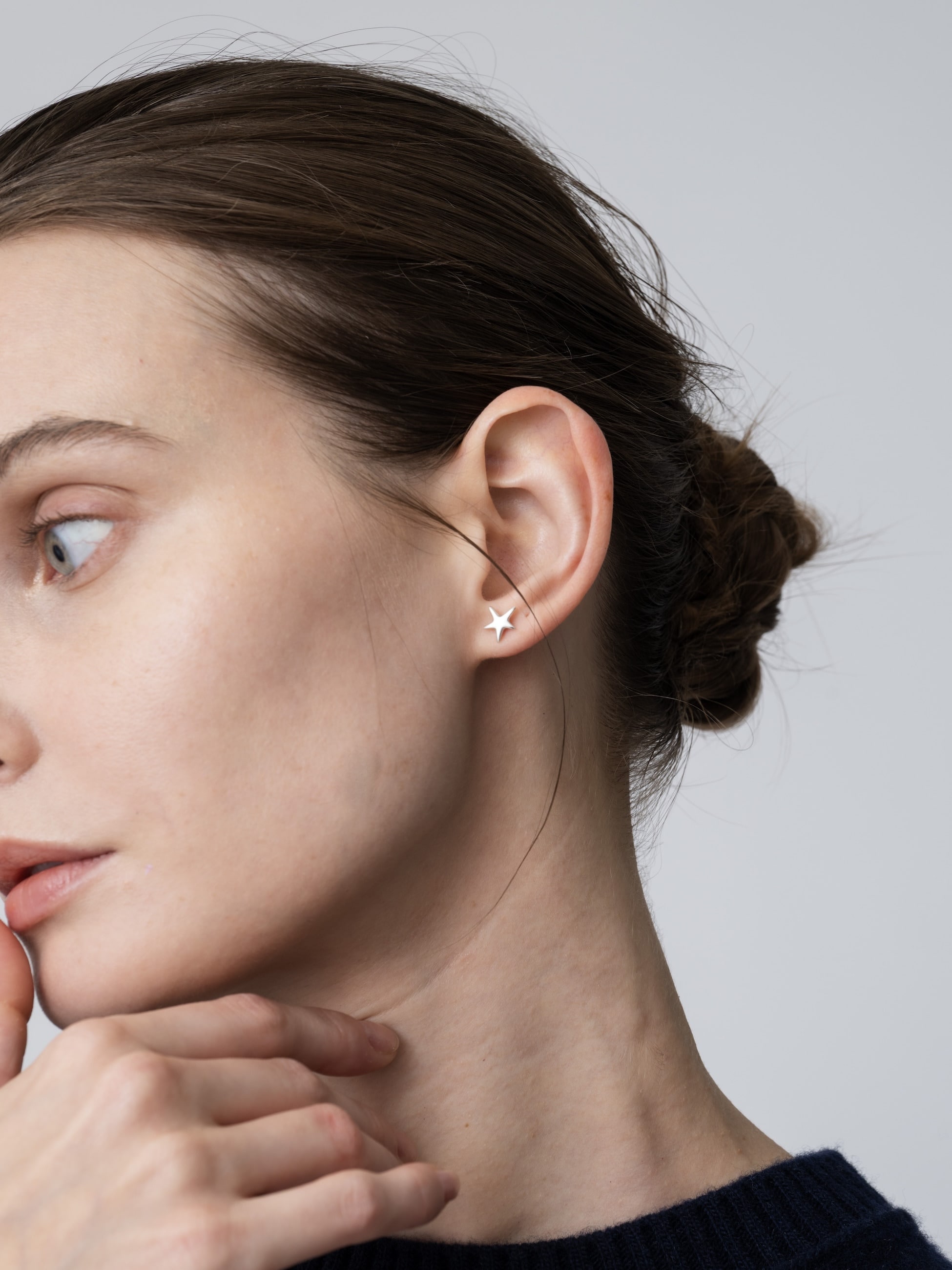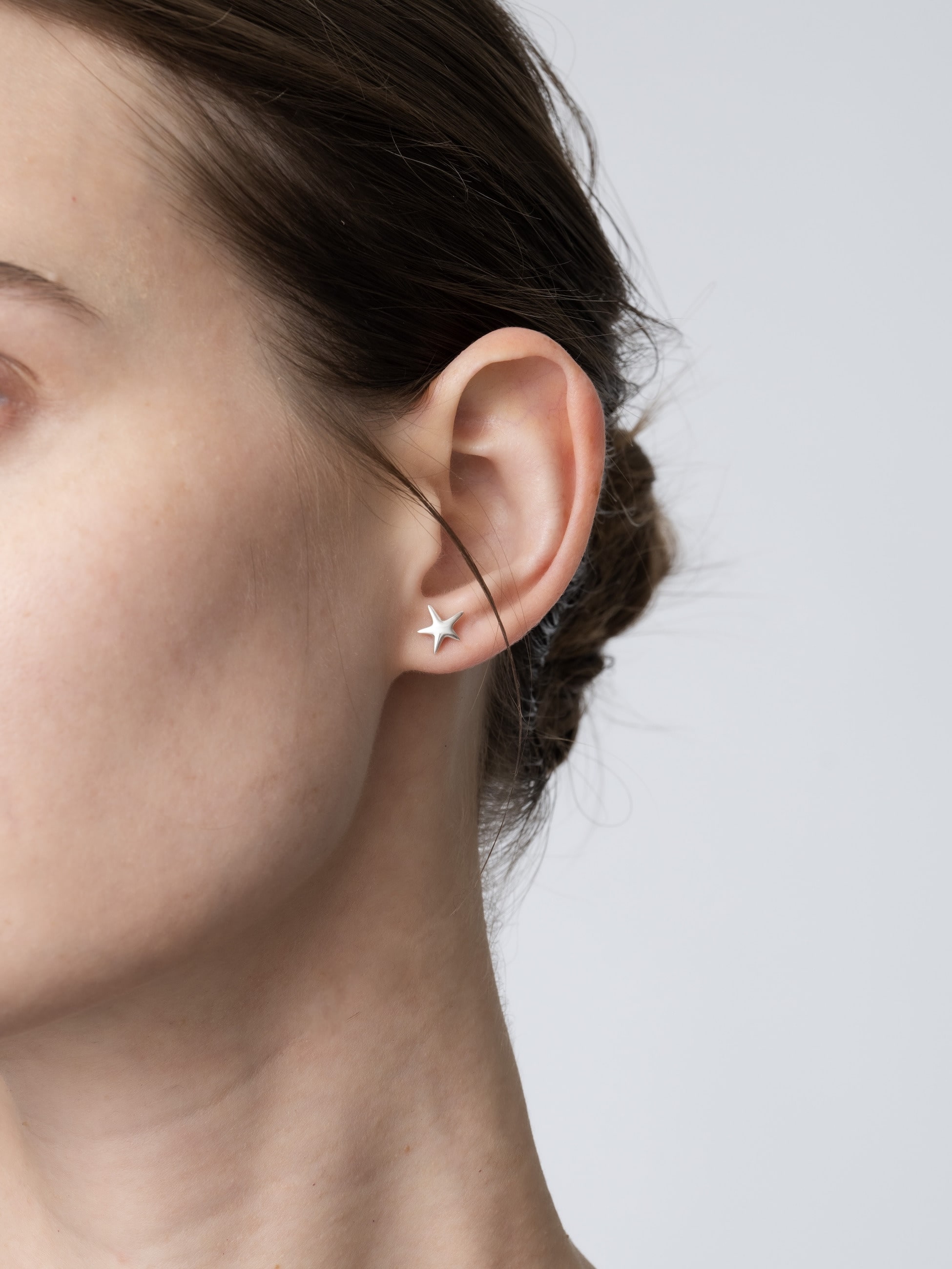 シャープなスターピアスを別注しました。どの向きでつけてもワンポイントになる、可愛らしいフォルムにこだわりました。一筆書きで星を書きたい!と何度も練習をした幼い頃を思い出すような一粒ピアスです。