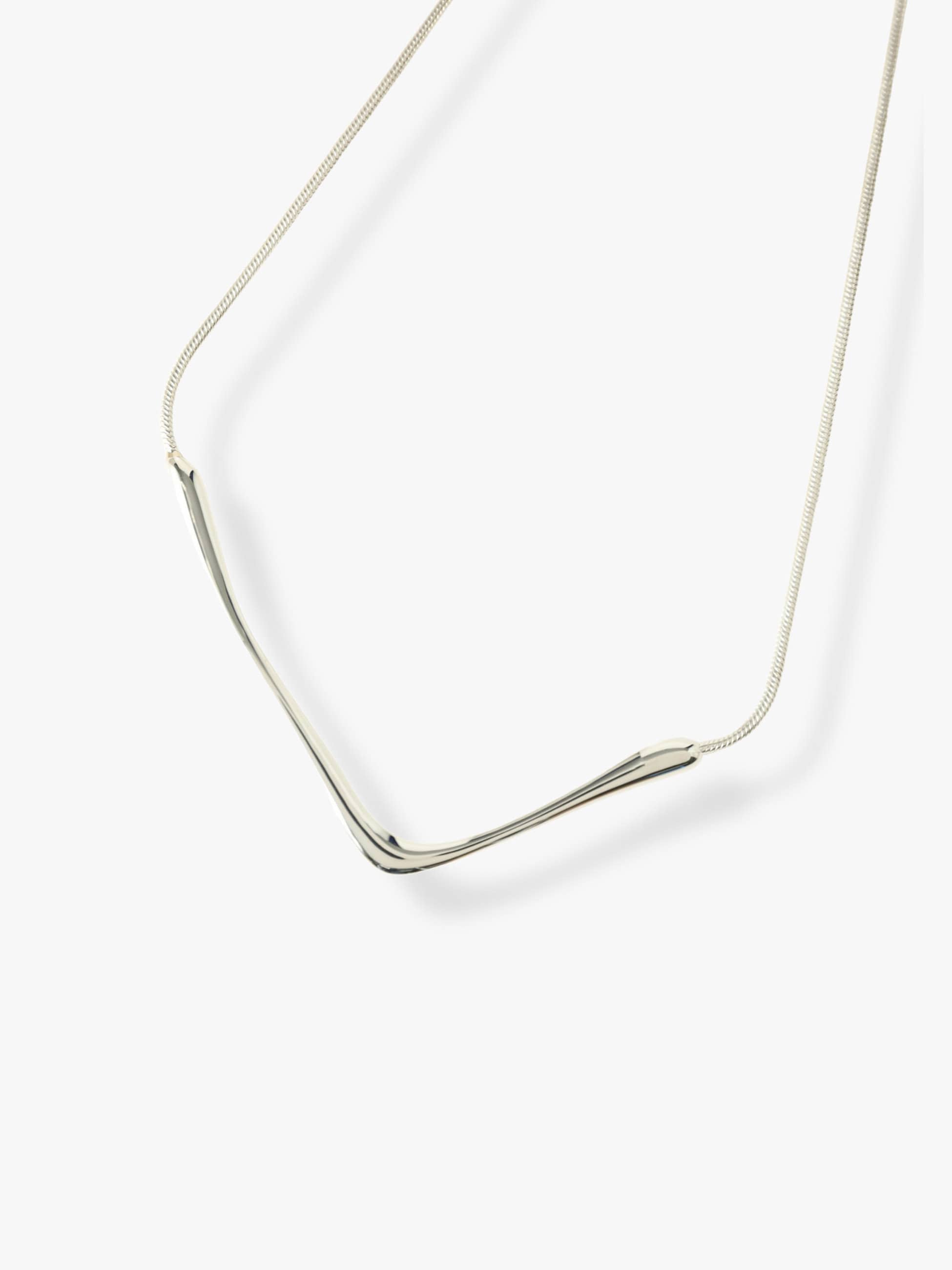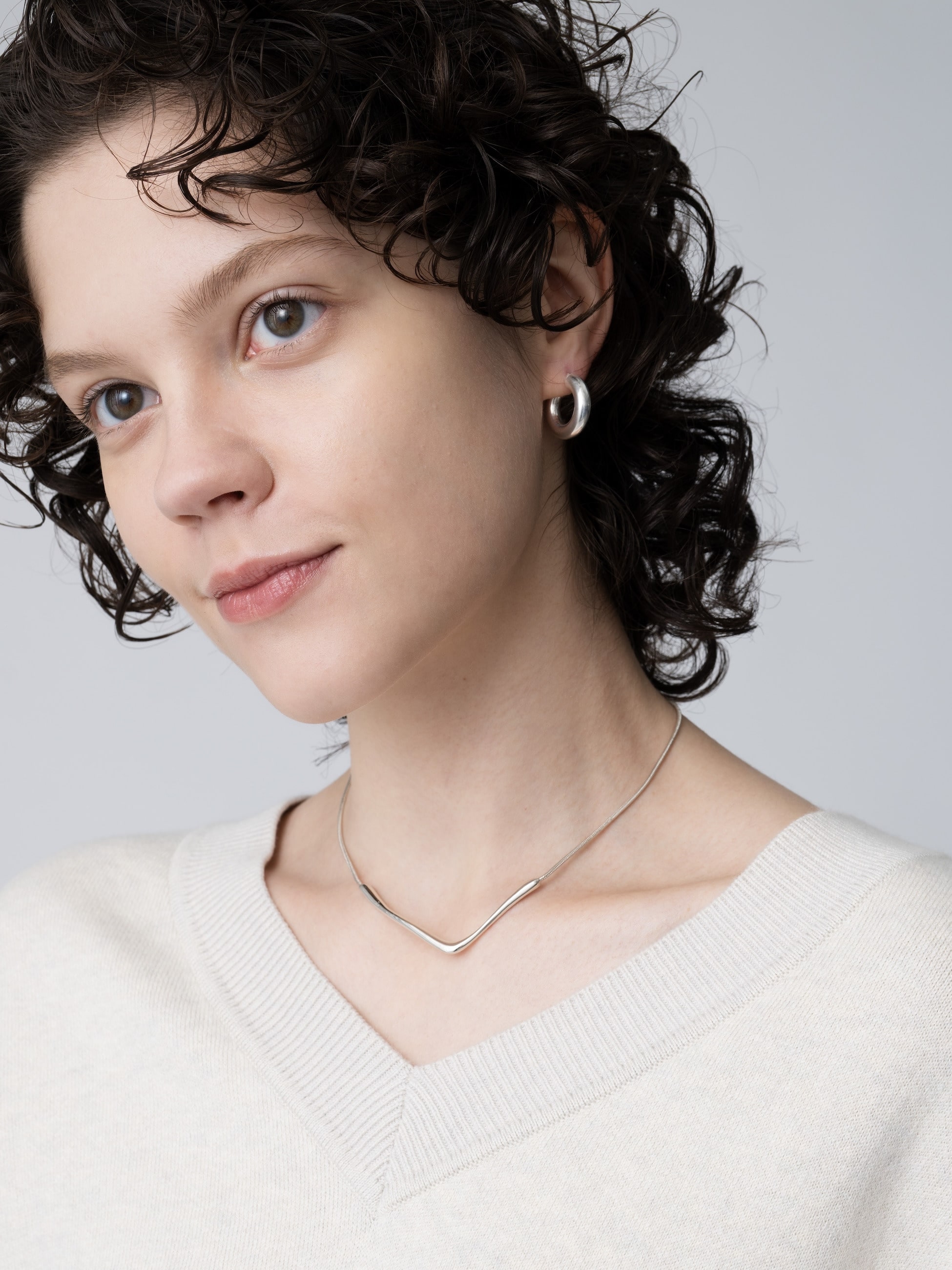 - 鎖骨にかけてゆるやかなアシンメトリーのVラインを描くネックレスは、滑らかなスネークチェーンが洗練された雰囲気をプラスします。華美にならないシルバーカラーは、綺麗めからカジュアルまで幅広いコーディネートをカバーし、より印象的なスタイリングを演出します。