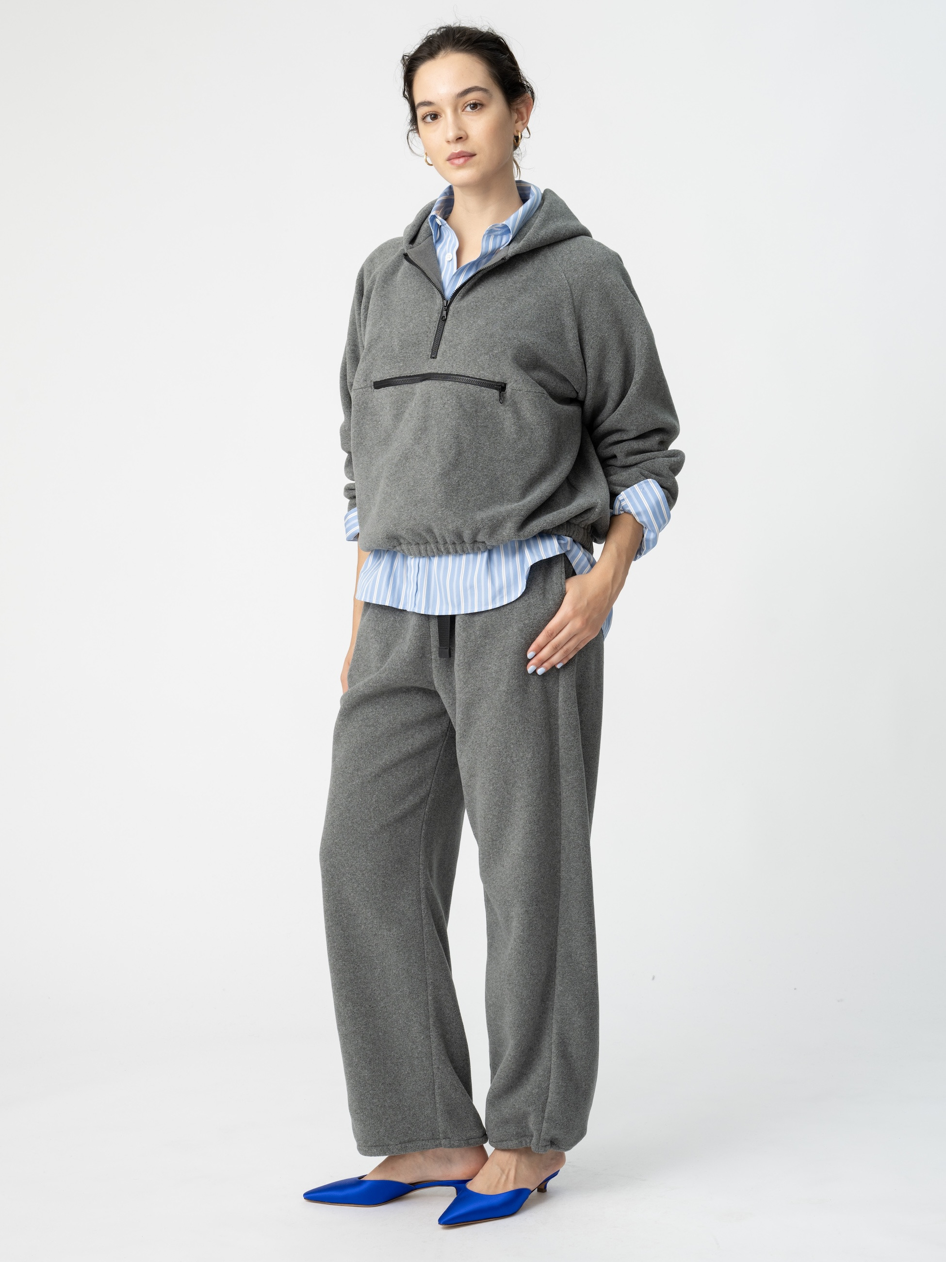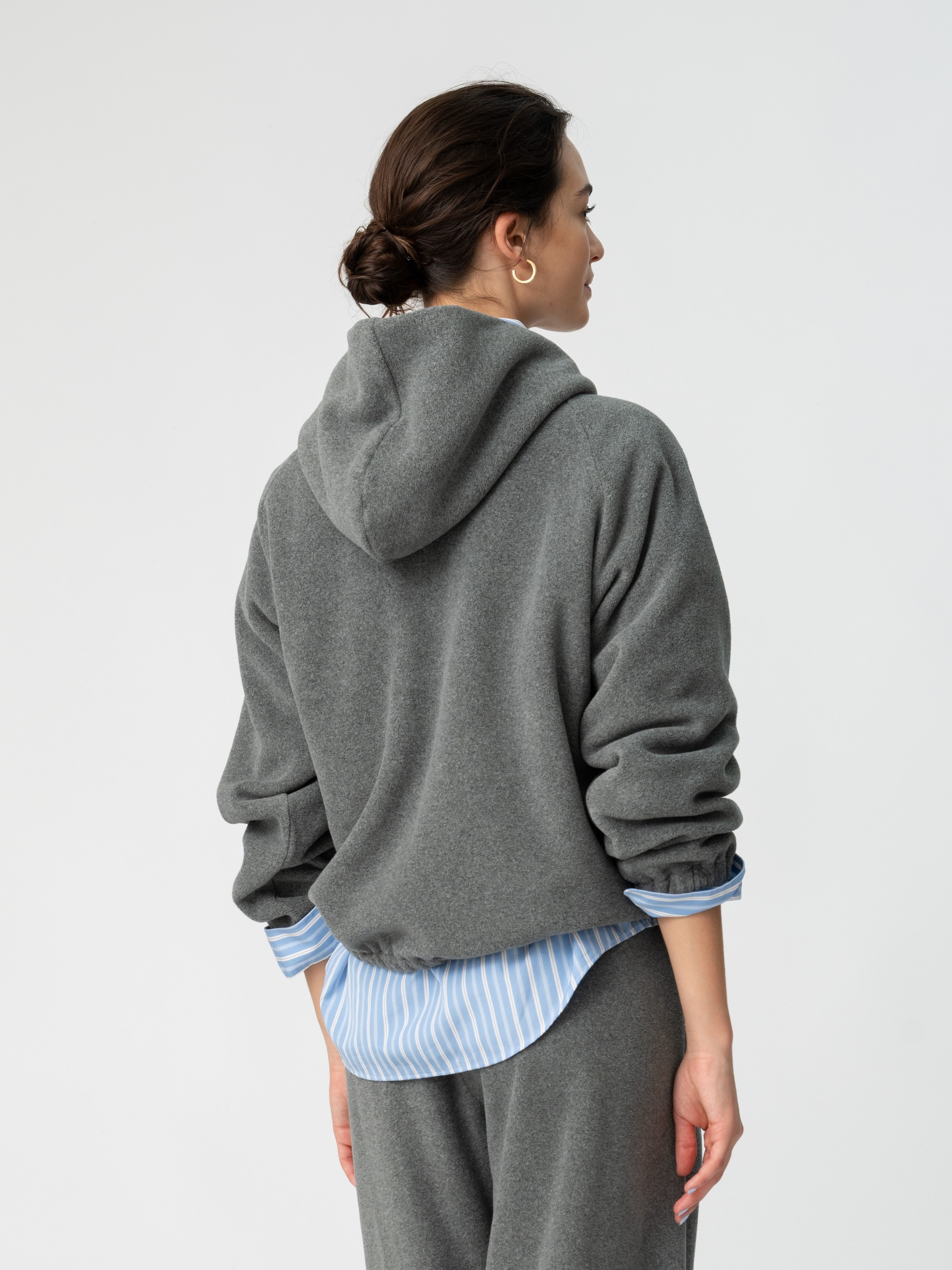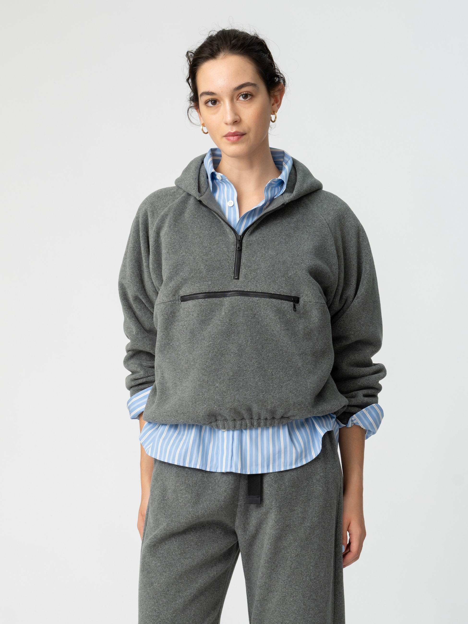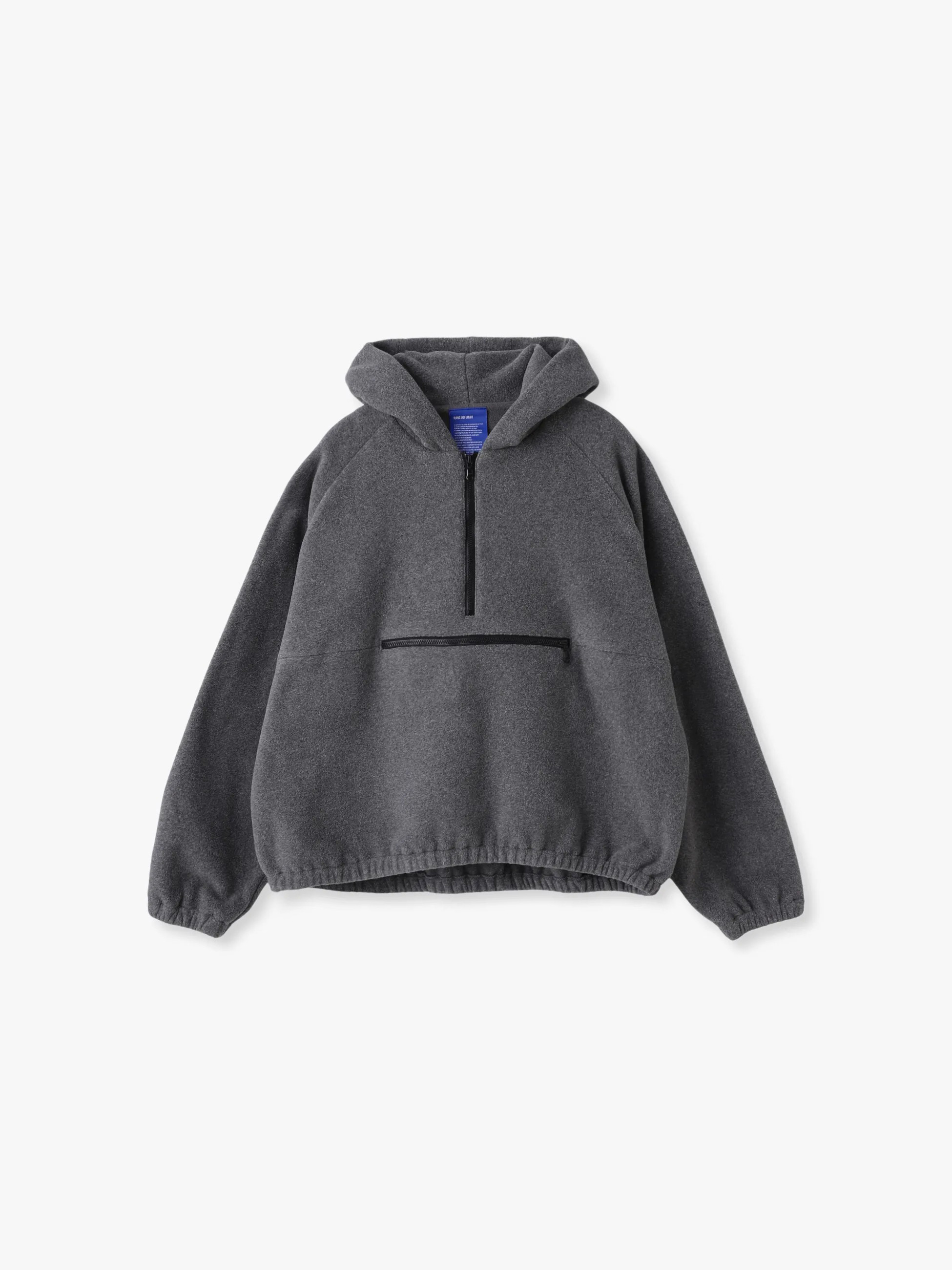 - ポーラテックの肌触りの良いフリースを使用したフーディーブルゾンは、カンガルーポケットを備えたアノラックタイプで、オーバーサイズすぎない程よくリラクシーなシルエットが魅力です。非常に軽量であたたかく、ご自宅でのお手入れがしやすいのも嬉しいポイントに。インナーにシャツをレイヤードしても様になり、可憐なスカートをあわせていただくのも素敵です。
