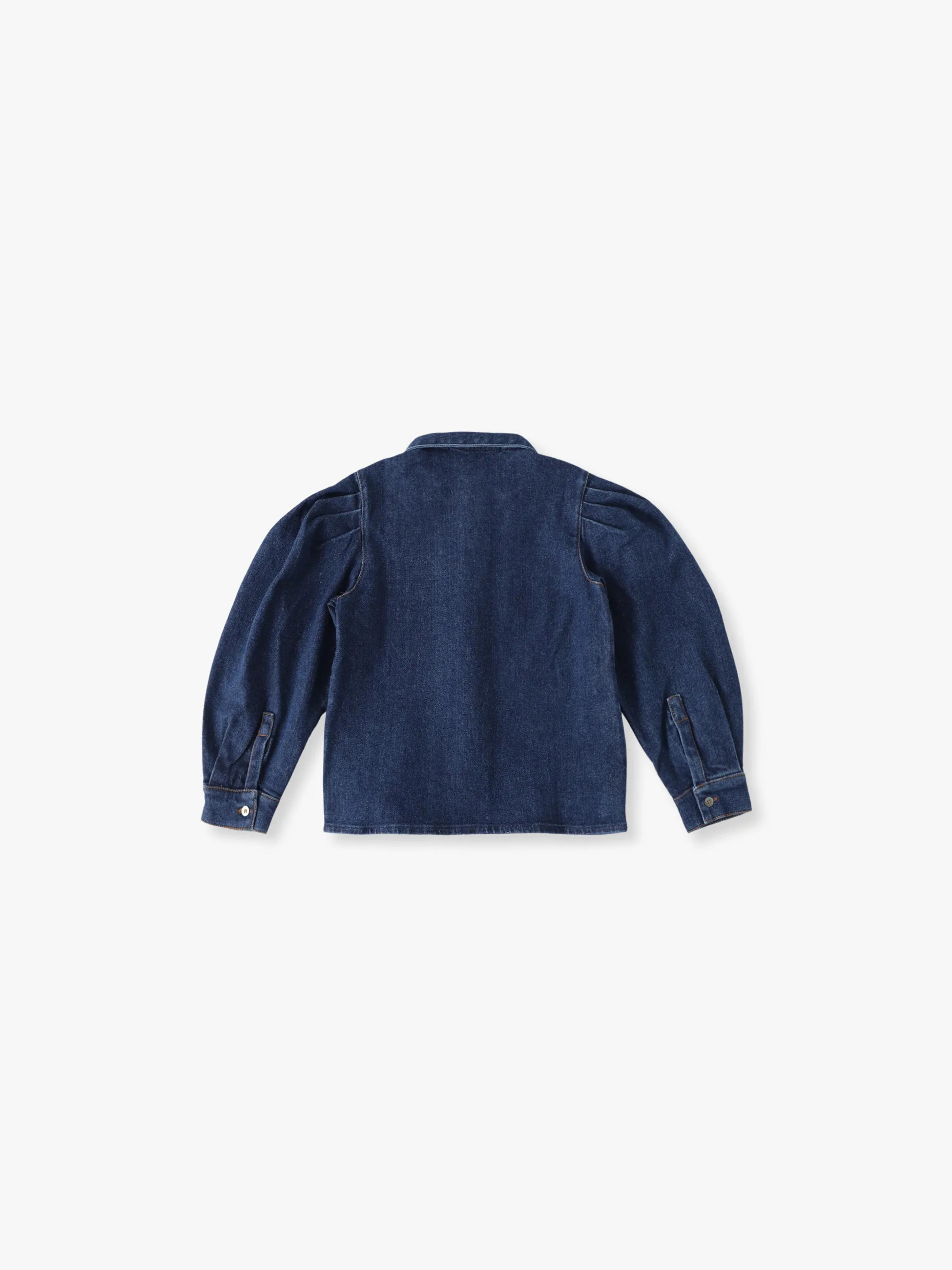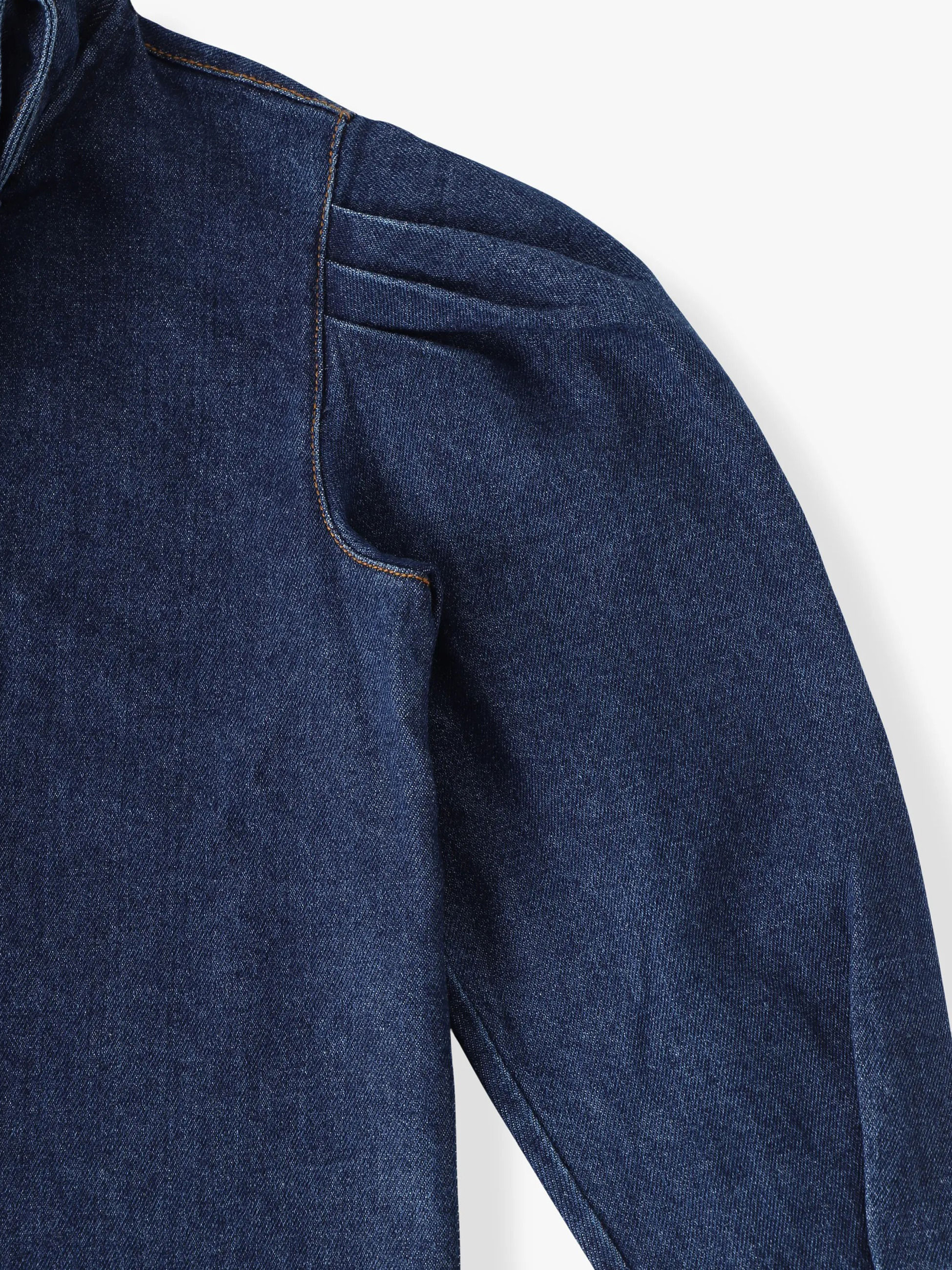 ストーンウォッシュ加工を施したデニム素材のタイネックブラウスは、首元のリボンがキュートで華やかな印象になります。肩には細かなプリーツが入っているため、立体感のあるシルエットが特徴的です。袖口にはボタン付きのカフスを採用し、着脱も簡単でスムーズです。