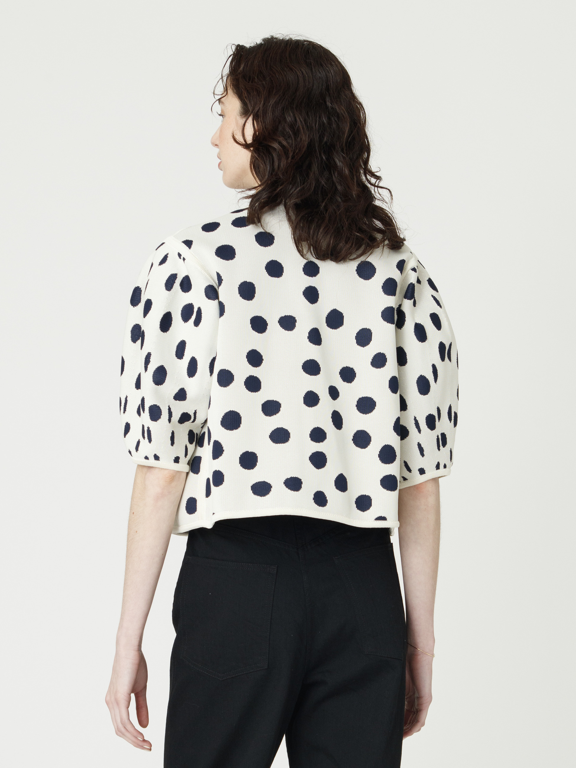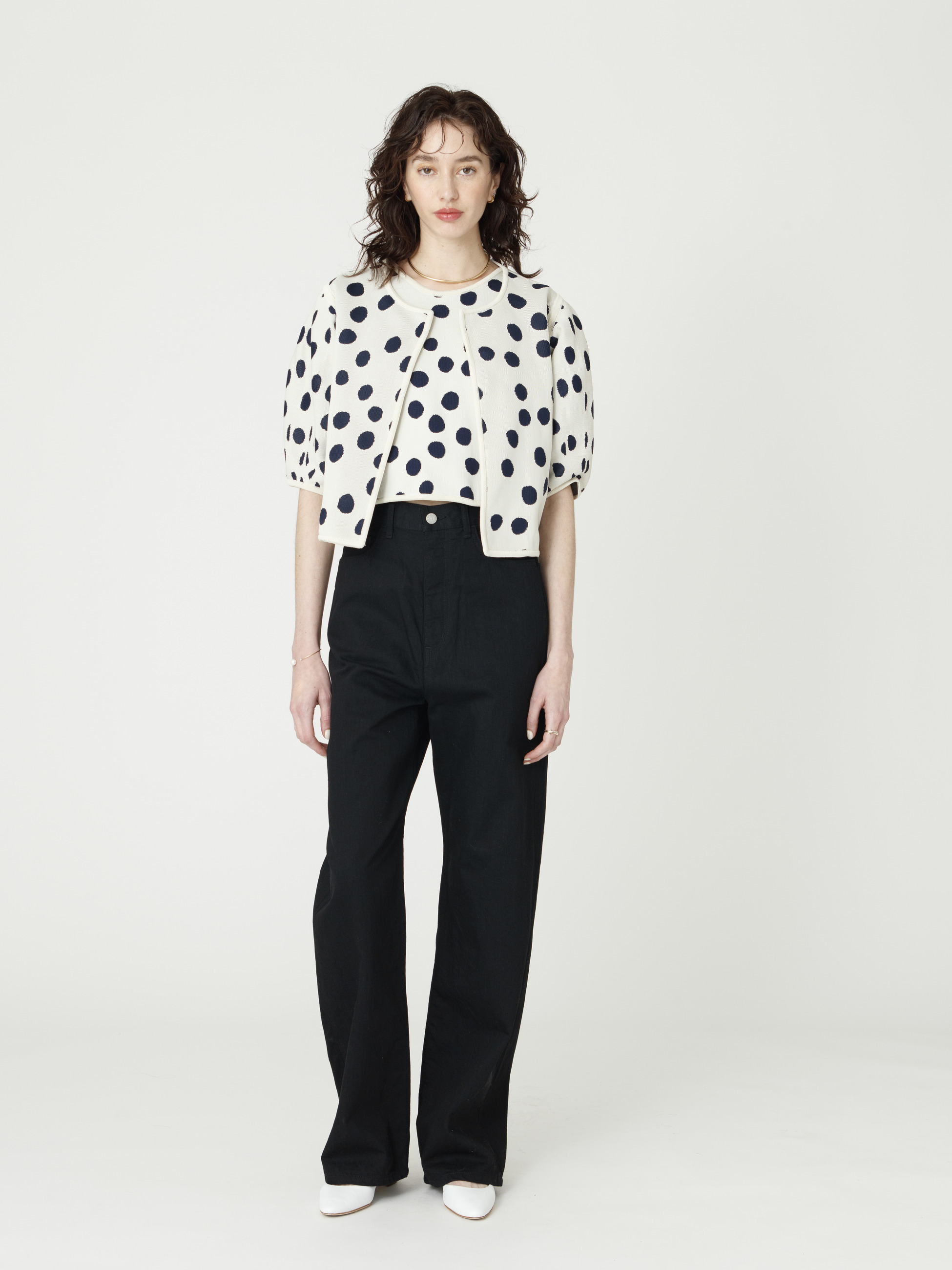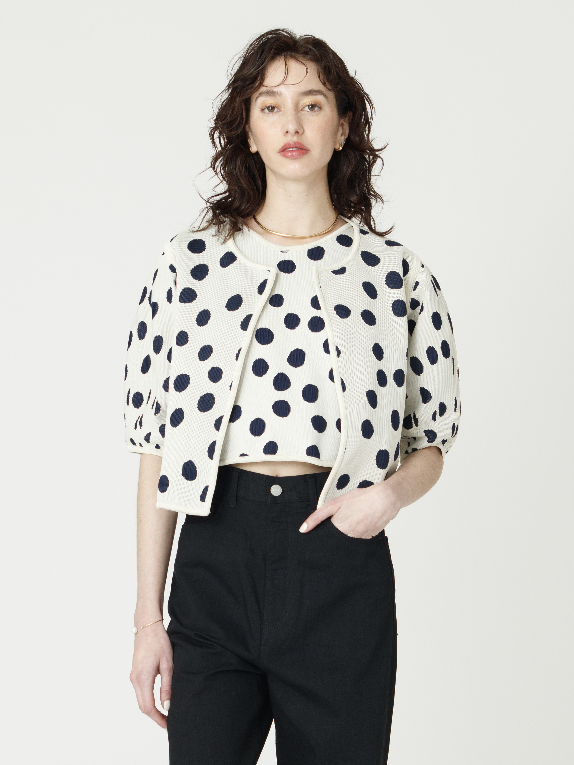 ランダムなドット模様が目を惹くバハケジャケットは、モダンでややゆとりのあるシルエットと美しいネックライン、ボリューム感のある肘丈の袖が好バランスで、羽織るだけで存在感を醸します。オープンフロントのデザインが軽やかな印象を与え、カジュアルスタイルにもフォーマルスタイルにも合わせやすい、レイヤードにも最適なアイテムです。