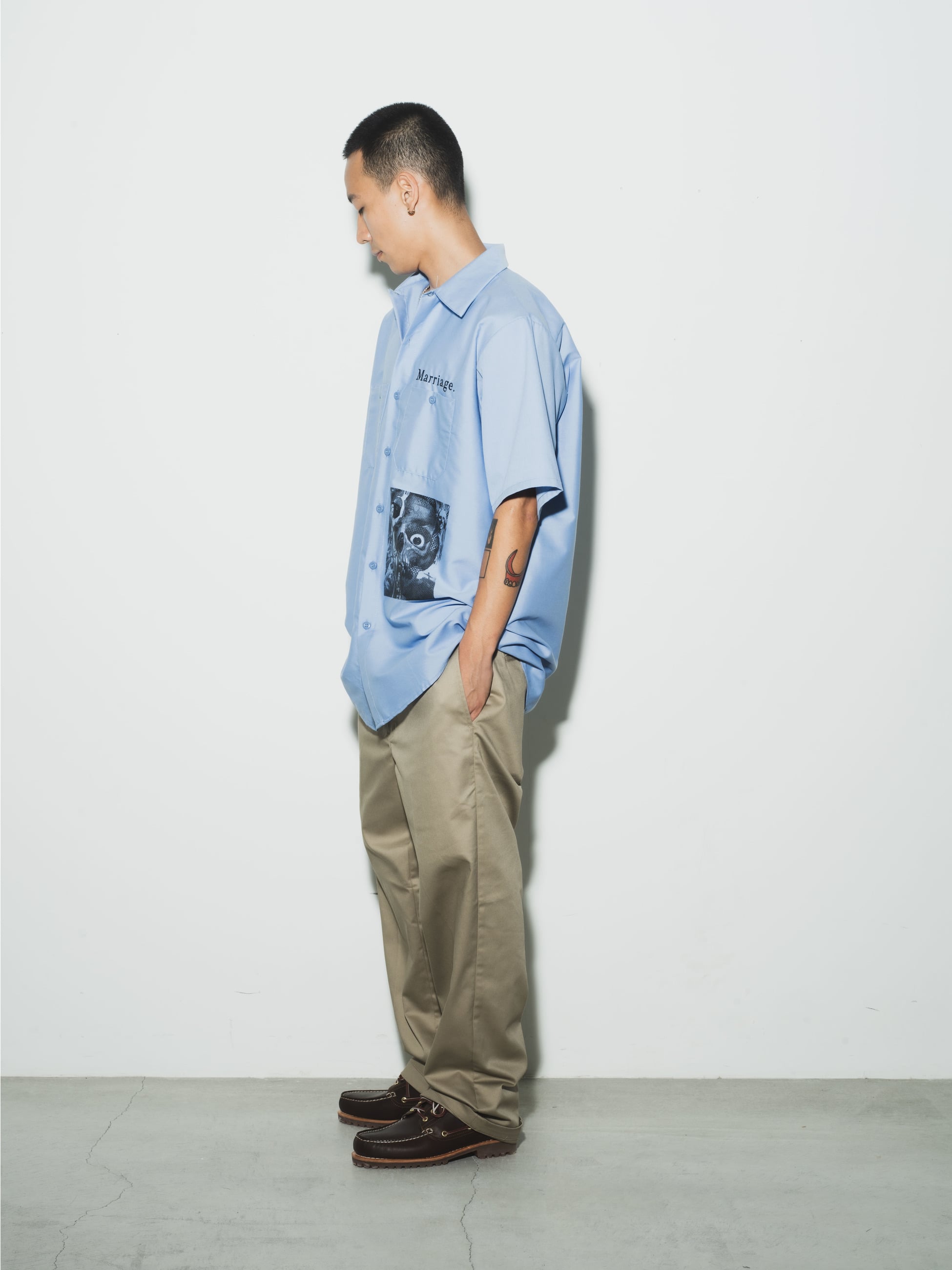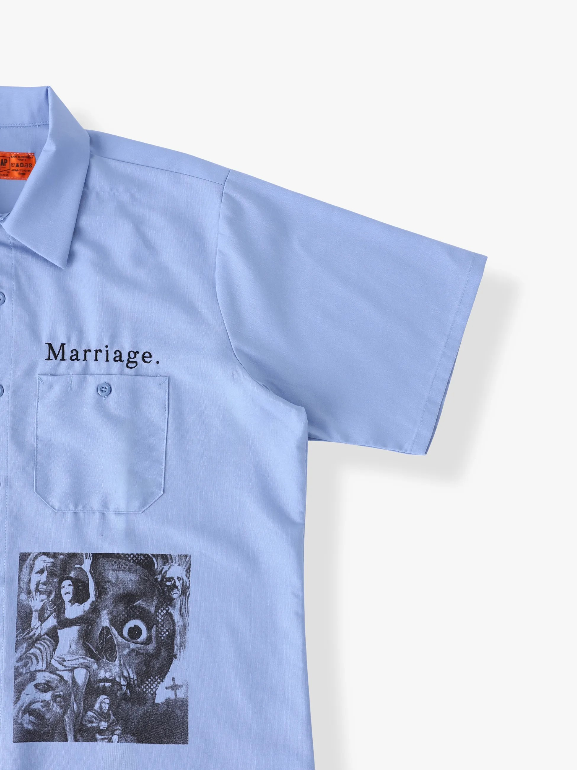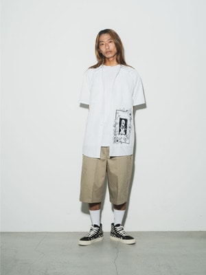 - LAのEcho Parkに構えるスケートショップ「Marriage SKATESHOP」との初のコラボレーションとなる「Marriage」より、ワークシャツの登場です。オーナー兼ローカルスケーターである「Ronnie Campone」による独自のグラフィックを、老舗ワークウェアブランドのRED KAP製ワークシャツにシルクスクリーンでプリントしたデザインが特徴です。また、ライトオンスのポプリン生地によるライトな着心地やワークウェアブランドならではの堅牢な作りも魅力のひとつ。長めに設定された着丈とゆったりとしたフィットは、そのままで着用した無骨なコーディネートや、ローカルスケーターのように裾をカットしてアレンジした着こなしもおすすめです。UNDER Rのフィルターを通して実現した、スペシャルなコラボレーションアイテムをお楽しみください。
