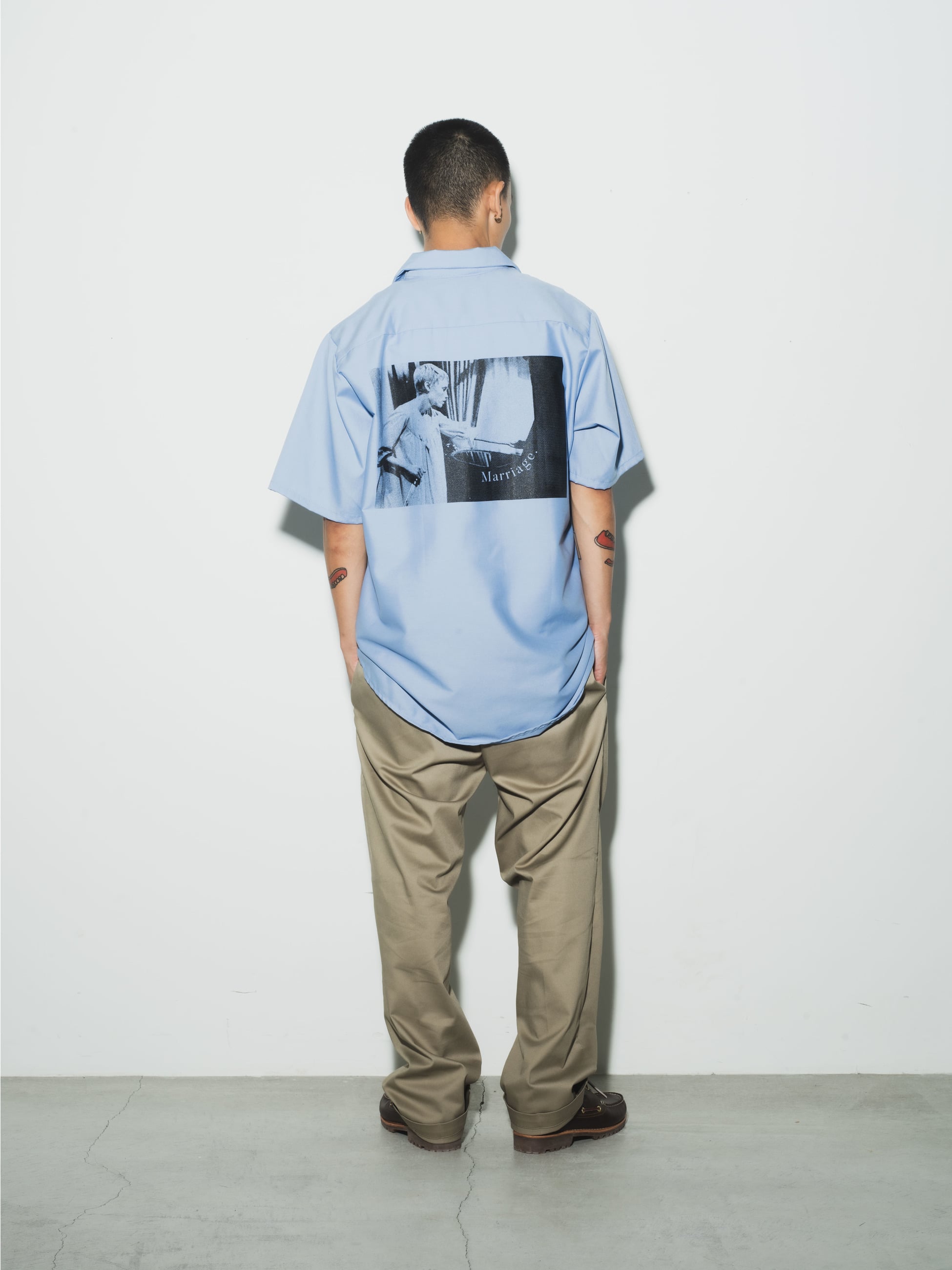 LAのEcho Parkに構えるスケートショップ「Marriage SKATESHOP」との初のコラボレーションとなる「Marriage」より、ワークシャツの登場です。オーナー兼ローカルスケーターである「Ronnie Campone」による独自のグラフィックを、老舗ワークウェアブランドのRED KAP製ワークシャツにシルクスクリーンでプリントしたデザインが特徴です。また、ライトオンスのポプリン生地によるライトな着心地やワークウェアブランドならではの堅牢な作りも魅力のひとつ。長めに設定された着丈とゆったりとしたフィットは、そのままで着用した無骨なコーディネートや、ローカルスケーターのように裾をカットしてアレンジした着こなしもおすすめです。UNDER Rのフィルターを通して実現した、スペシャルなコラボレーションアイテムをお楽しみください。