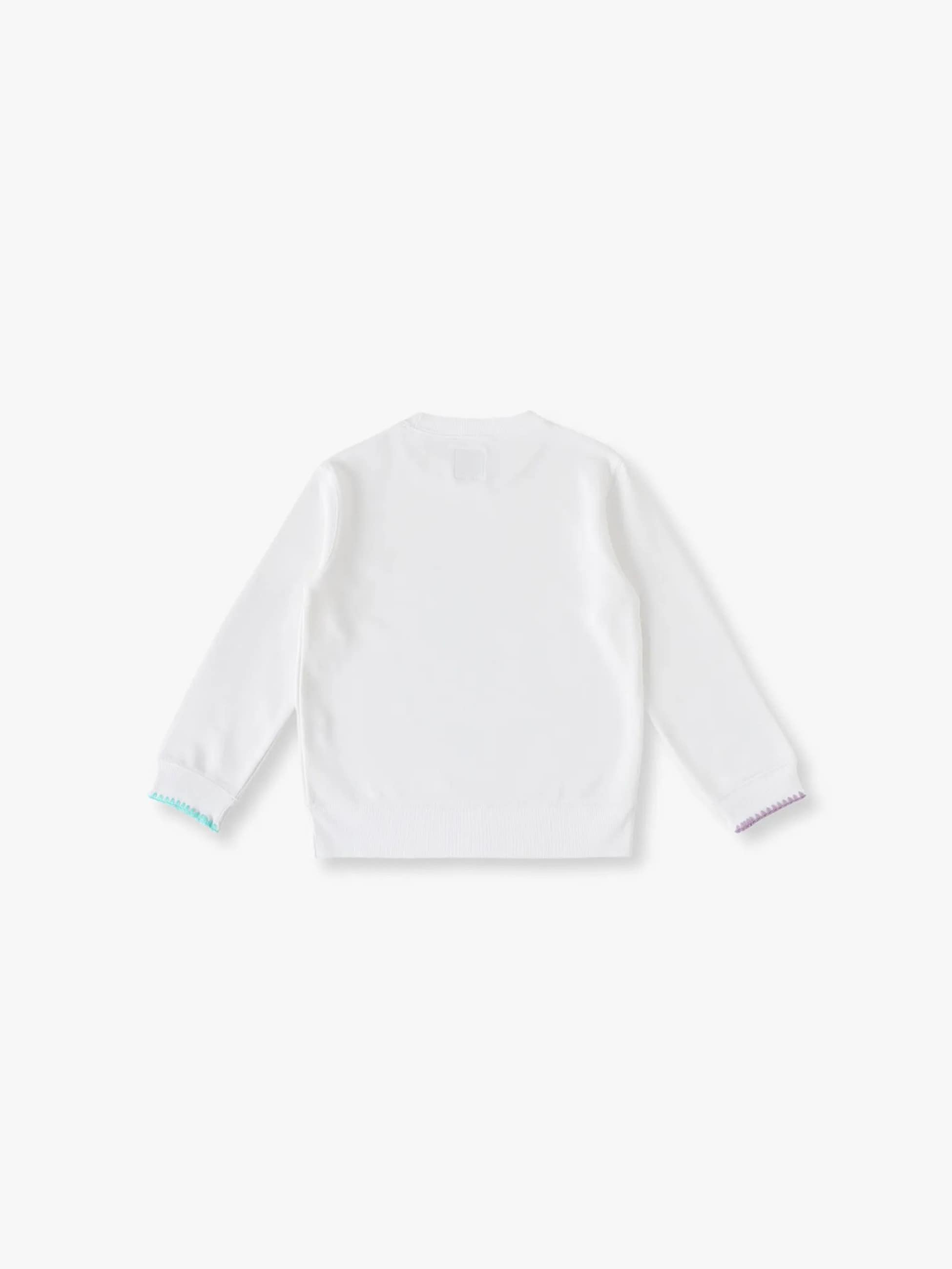 イラストタッチのデザインがキュートなスウェットシャツは、ホワイト地にパープルとグリーンが映える1枚です。袖口には配色のステッチが施されており、細部にもデザイン性を感じるアイテムです。裏毛仕様でコットンを使用しているため、長いシーズンで着用いただけます。