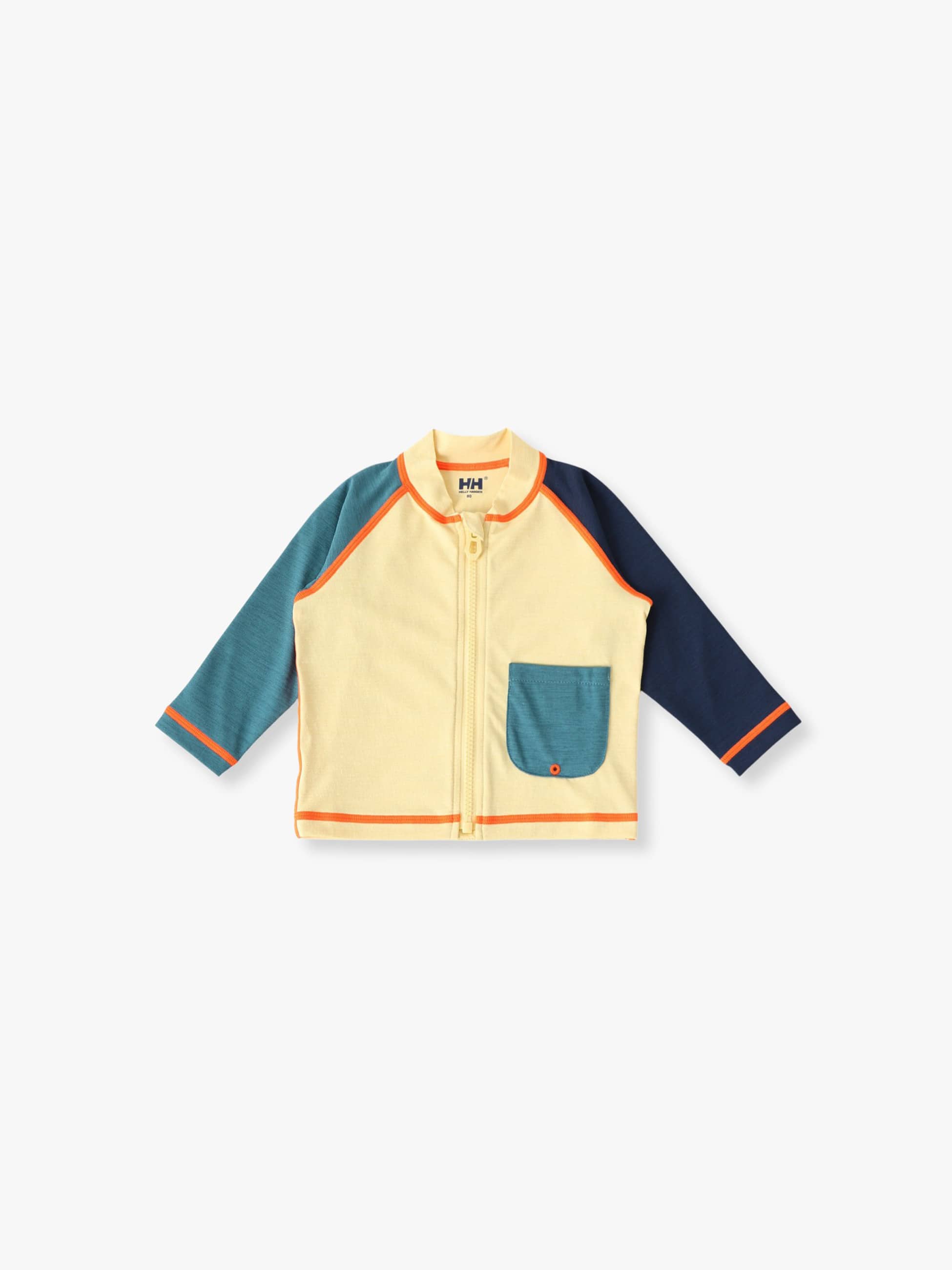 ウォーターアクティビティで活躍するフルジップのベビーラッシュガードは、UVプロテクト(UPF50+)によって強い日差しの下でも安心して着用できます。スラブ感のあるポリエステル生地は耐海水・耐塩素性に優れており、濡れても生地が張り付きにくく快適な着心地です。ややフィット感のあるシルエットと高めの襟が、動きやすさと紫外線対策を両立します。Quick Freeファスナーや視認性を高める配色ステッチを採用し、安全性にも配慮した設計です。