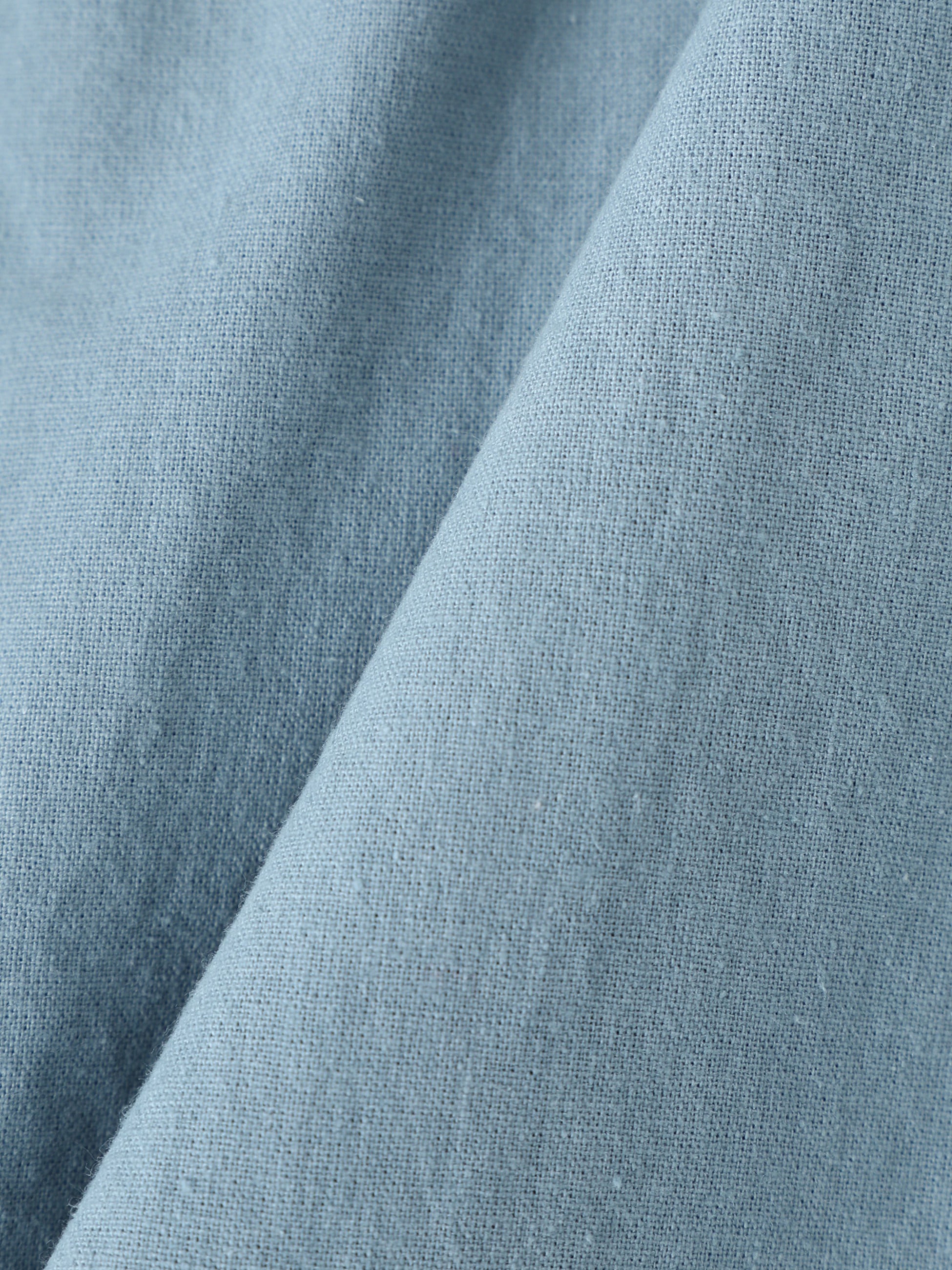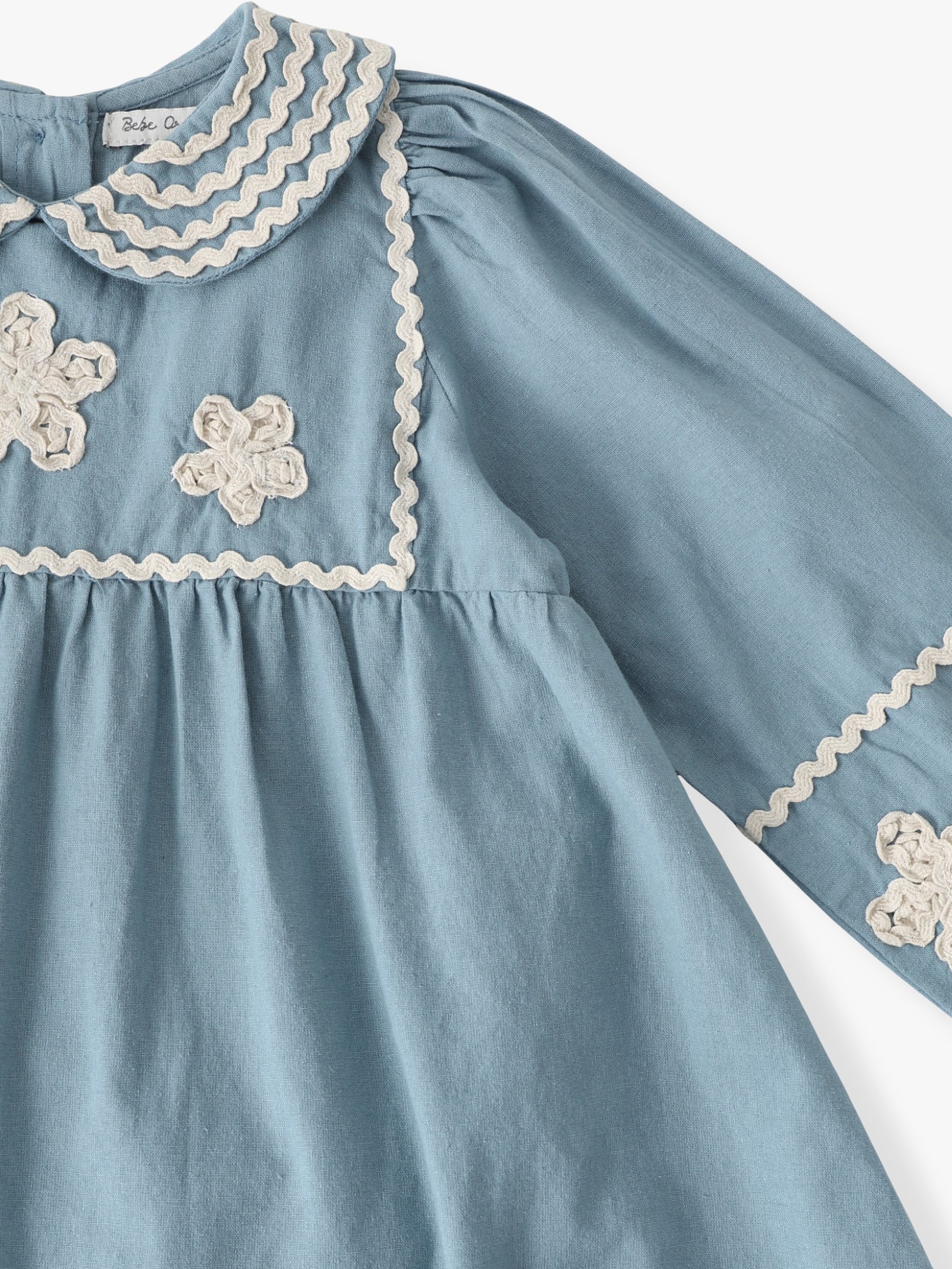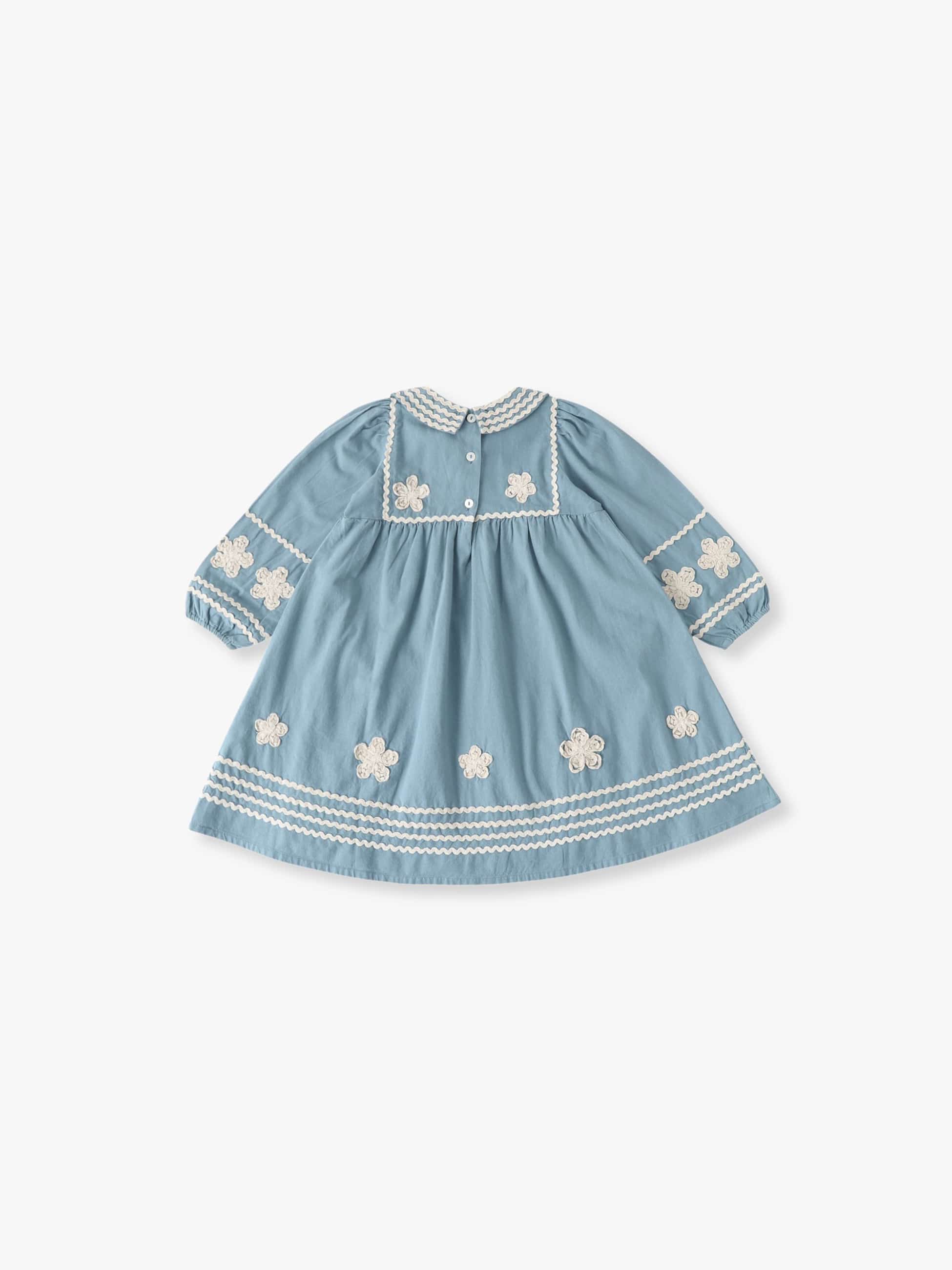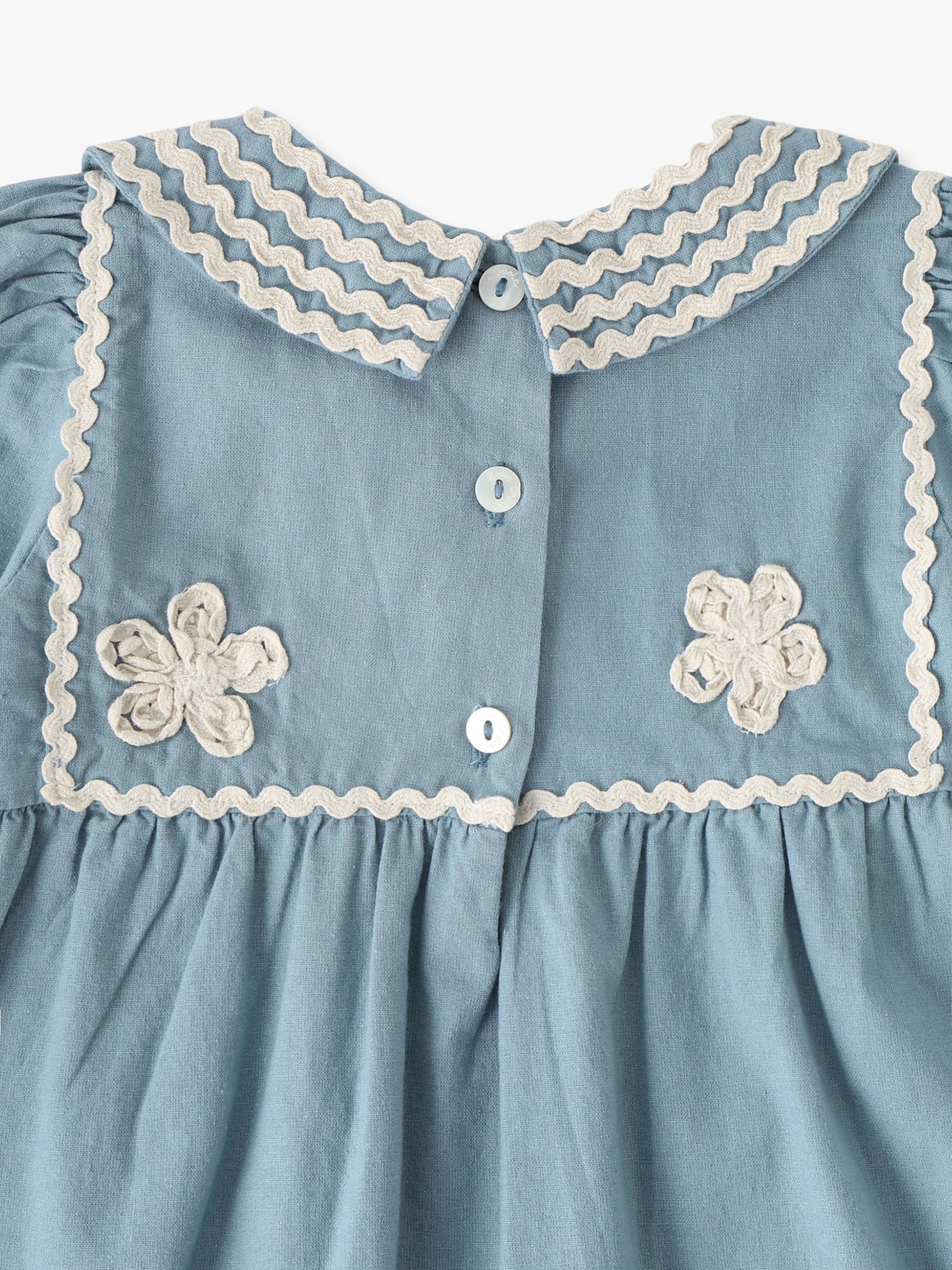 落ち着いたブルーのドレスは、ナチュラルなホワイトのリックラックテープで装飾され、上品でやさしい印象です。 愛らしいピーターパンカラーとバルーンパフスリーブがクラシカルな雰囲気を演出し、ゆったりとしたシルエットで快適な着心地です。