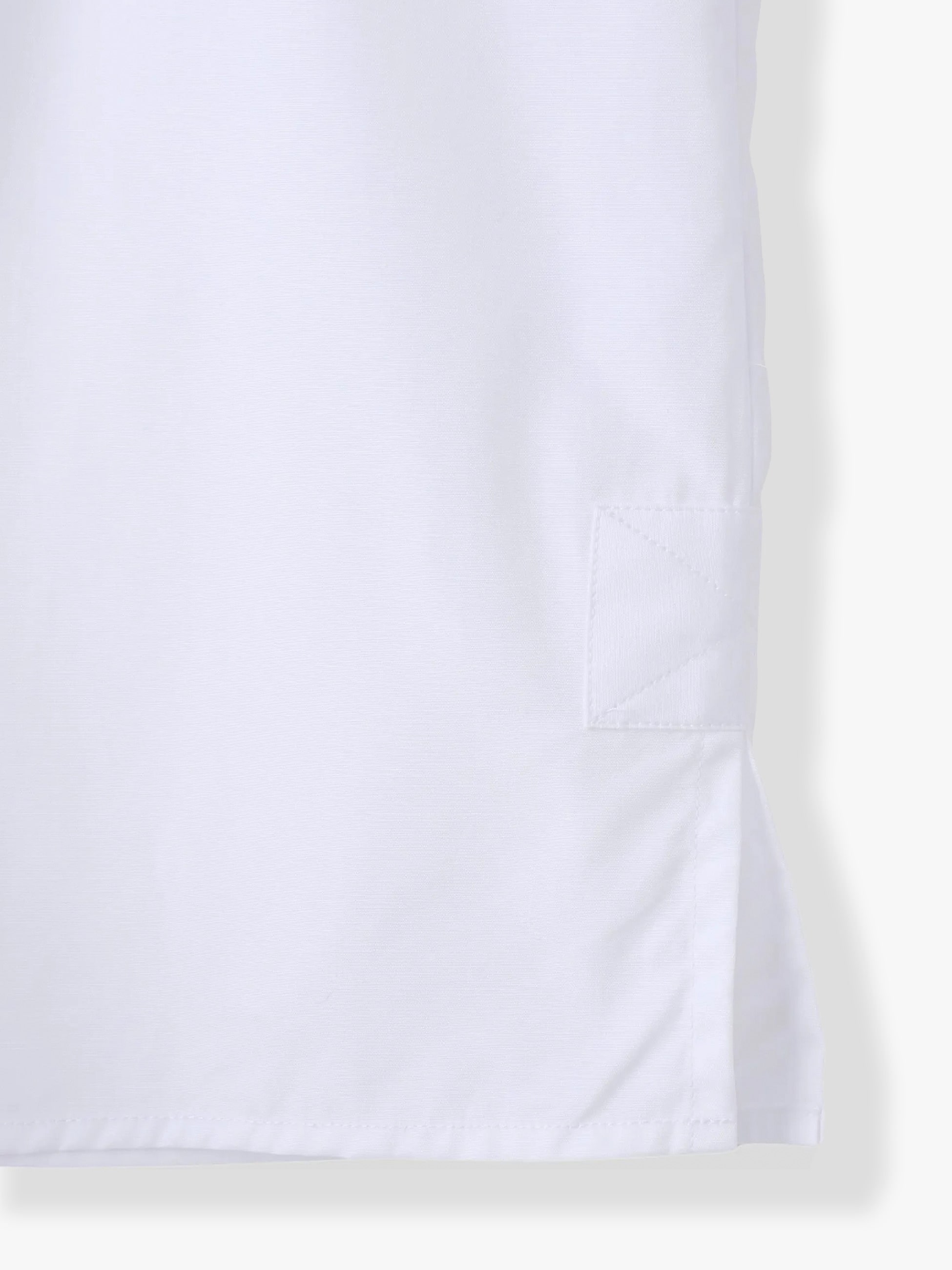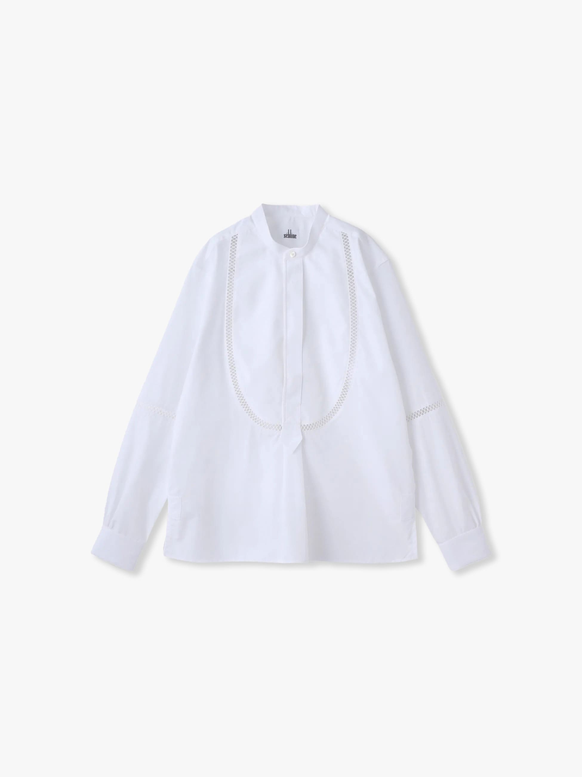 - 肌触りのよいコットンポプリン素材を使用したスタンドカラーシャツは、シンプルなホワイト地に同色のステッチがさりげないアクセントの、ディテールにこだわったユニークな1枚です。程よくゆったりとしたサイジングで、着れば着るほど肌馴染みが増していく風合いをお楽しみください。