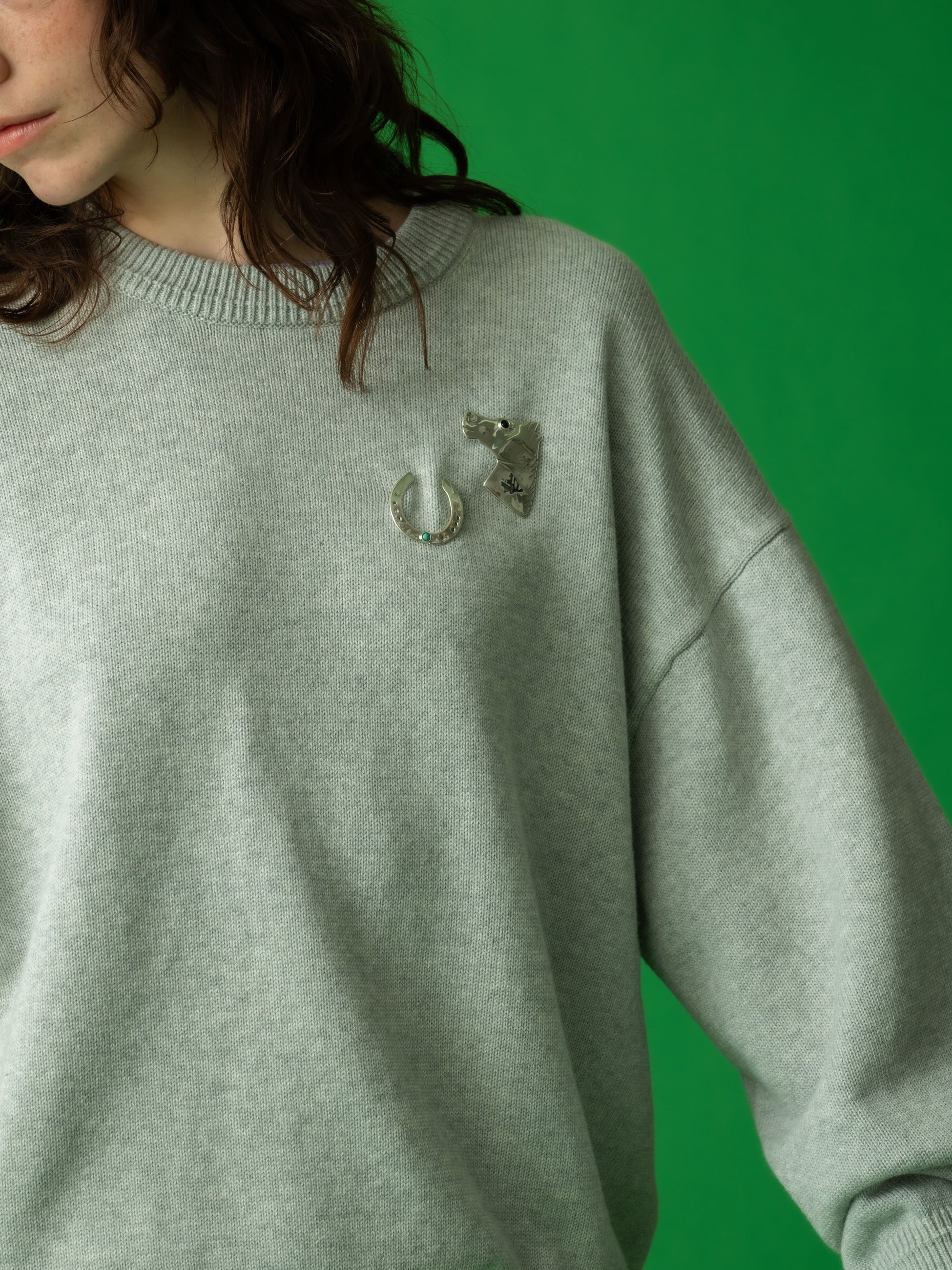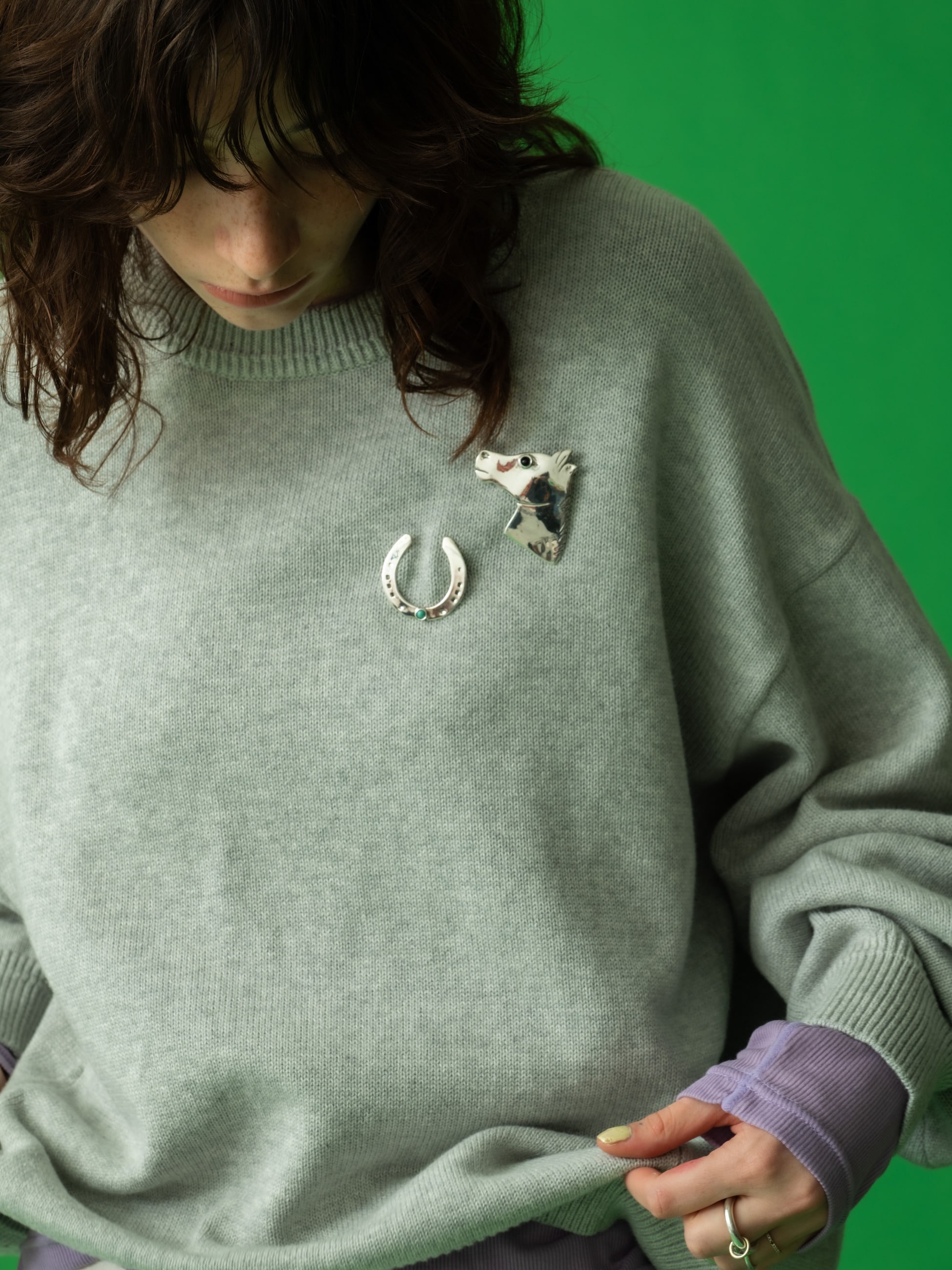 2026年にぴったりな馬蹄モチーフで別注したスペシャルなブローチは、グリーン色が濃いターコイズをアクセントとしてあしらっています。大きめの馬蹄にすることで、「たくさんのラッキーをキャッチできる一年になりますように」という願いを込めています。デニムジャケットやニットなどにつけるだけで、気分を上げてくれます。