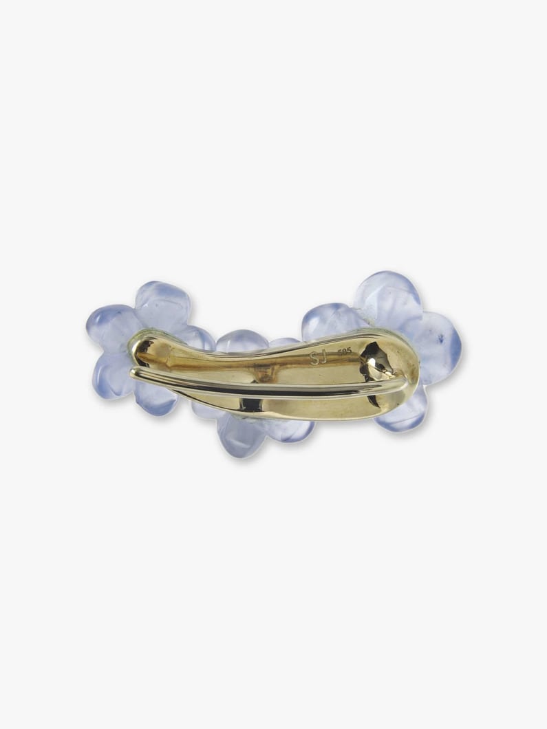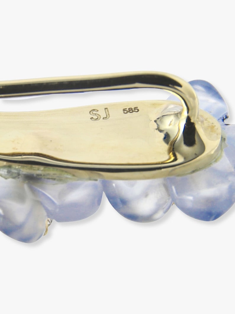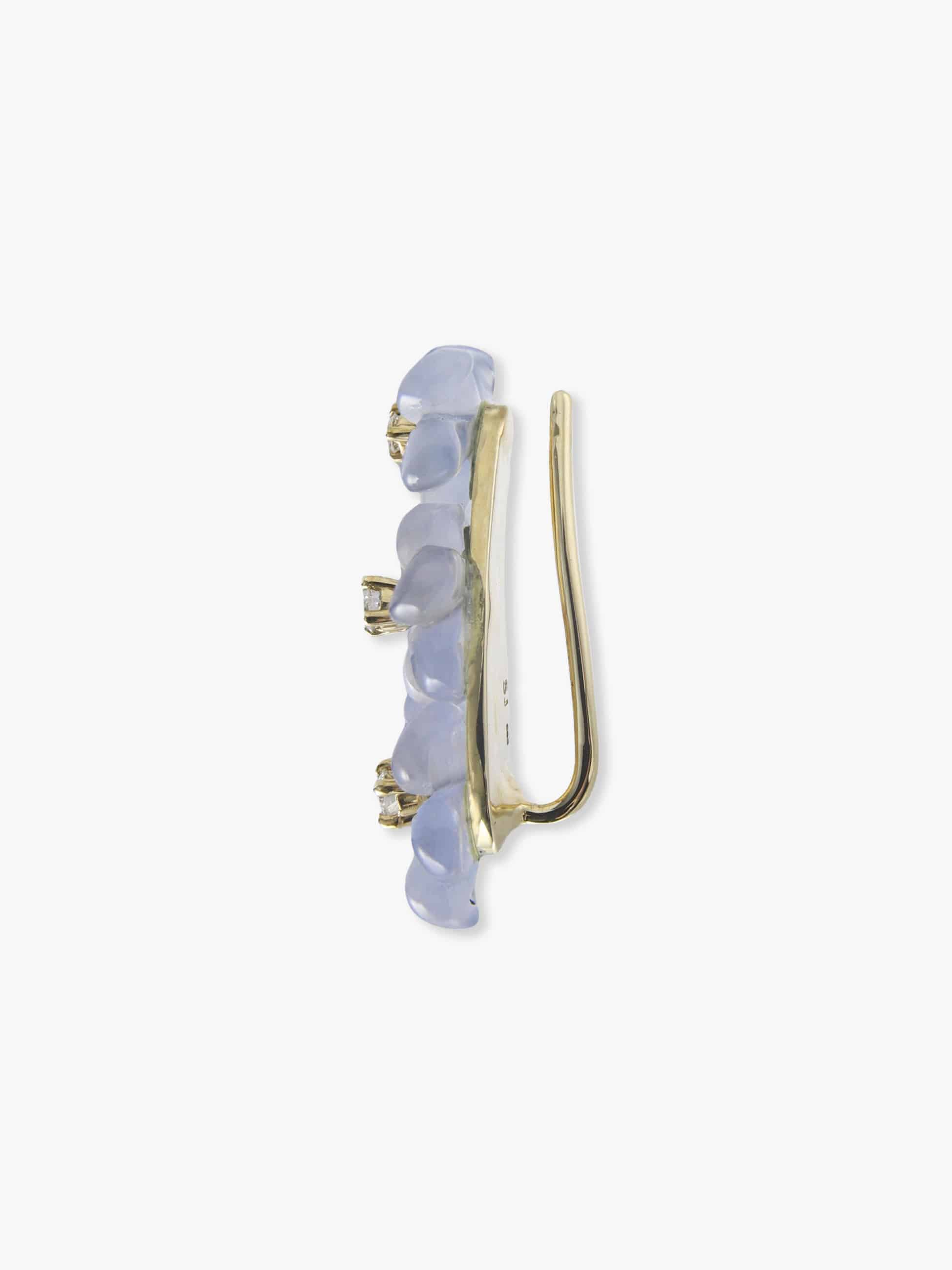 まるで本物の花のように美しい、片耳用のイヤークライマーは、手彫りの高い技術によるカットが施されたハイクオリティなカルセドニーと、トップウェッセルトンVVSクラスのダイヤモンドをあしらったスペシャルなアイテムです。つけると耳のカーブに沿い、ロマンティックで華やかな耳元を演出します。