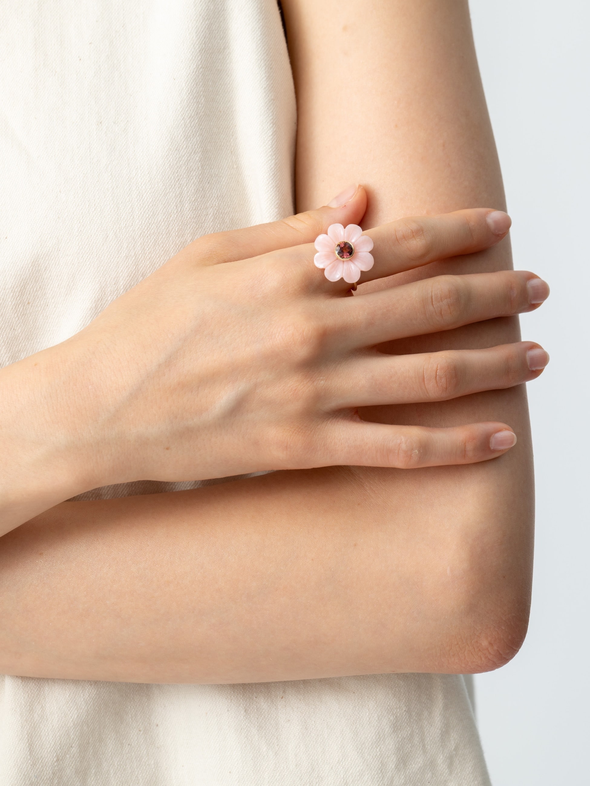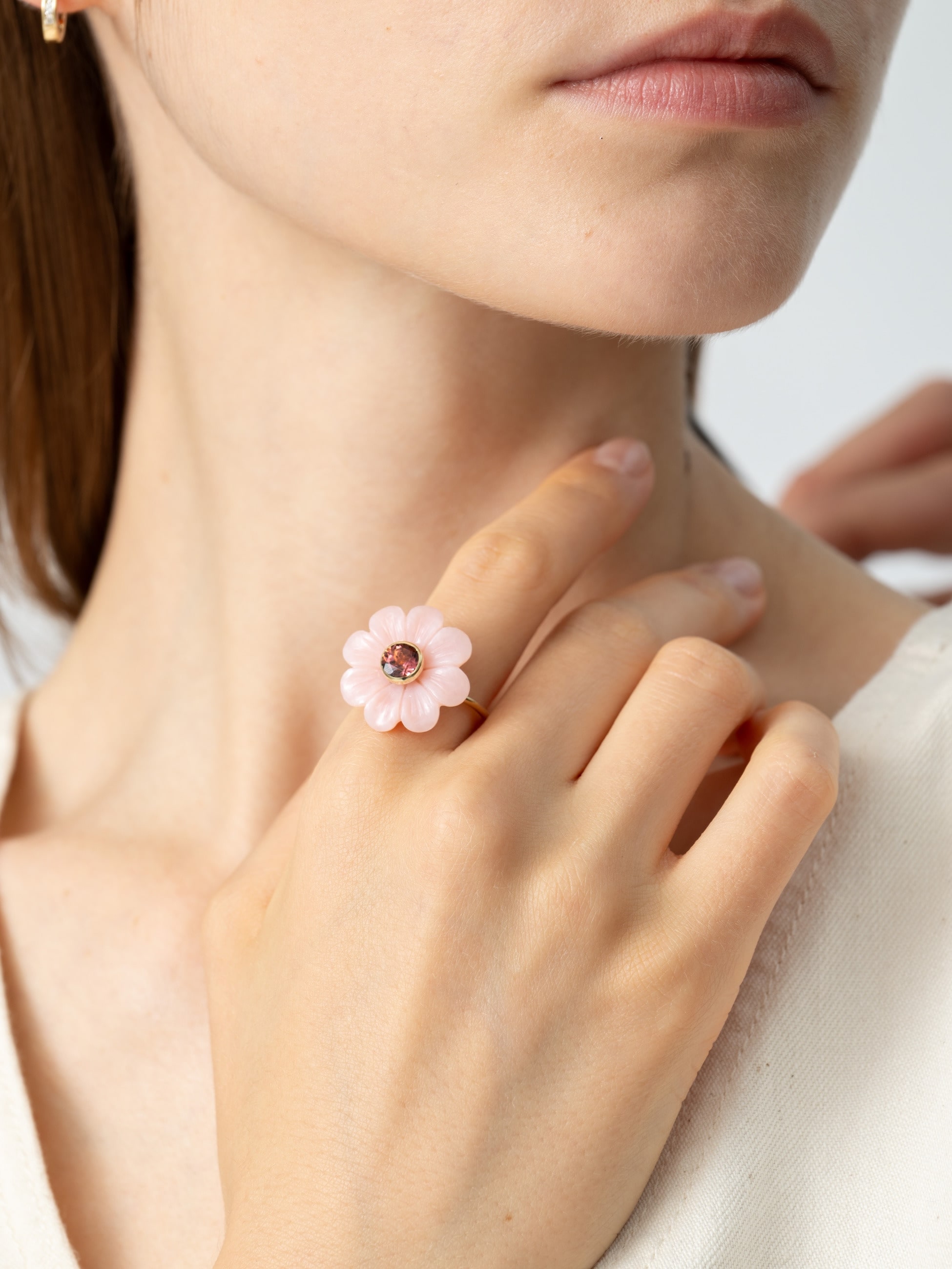 本物の花のように美しいシルエットのリングは、手彫りの高い技術によるカットが施された淡い色味のピンクオパールと、可憐なピンクトルマリンがあしらわれています。Sophie Joanneらしいロマンティックで華やかな雰囲気が堪能できるスペシャルなジュエリーを、ぜひお楽しみください。