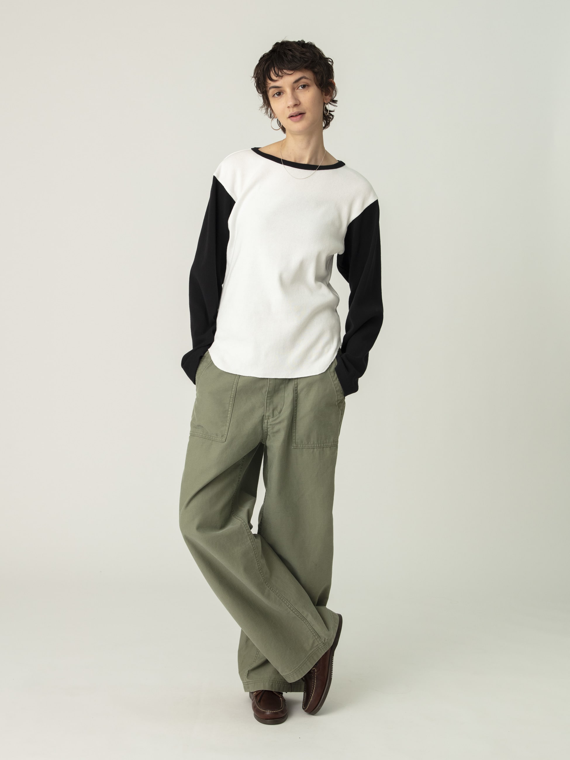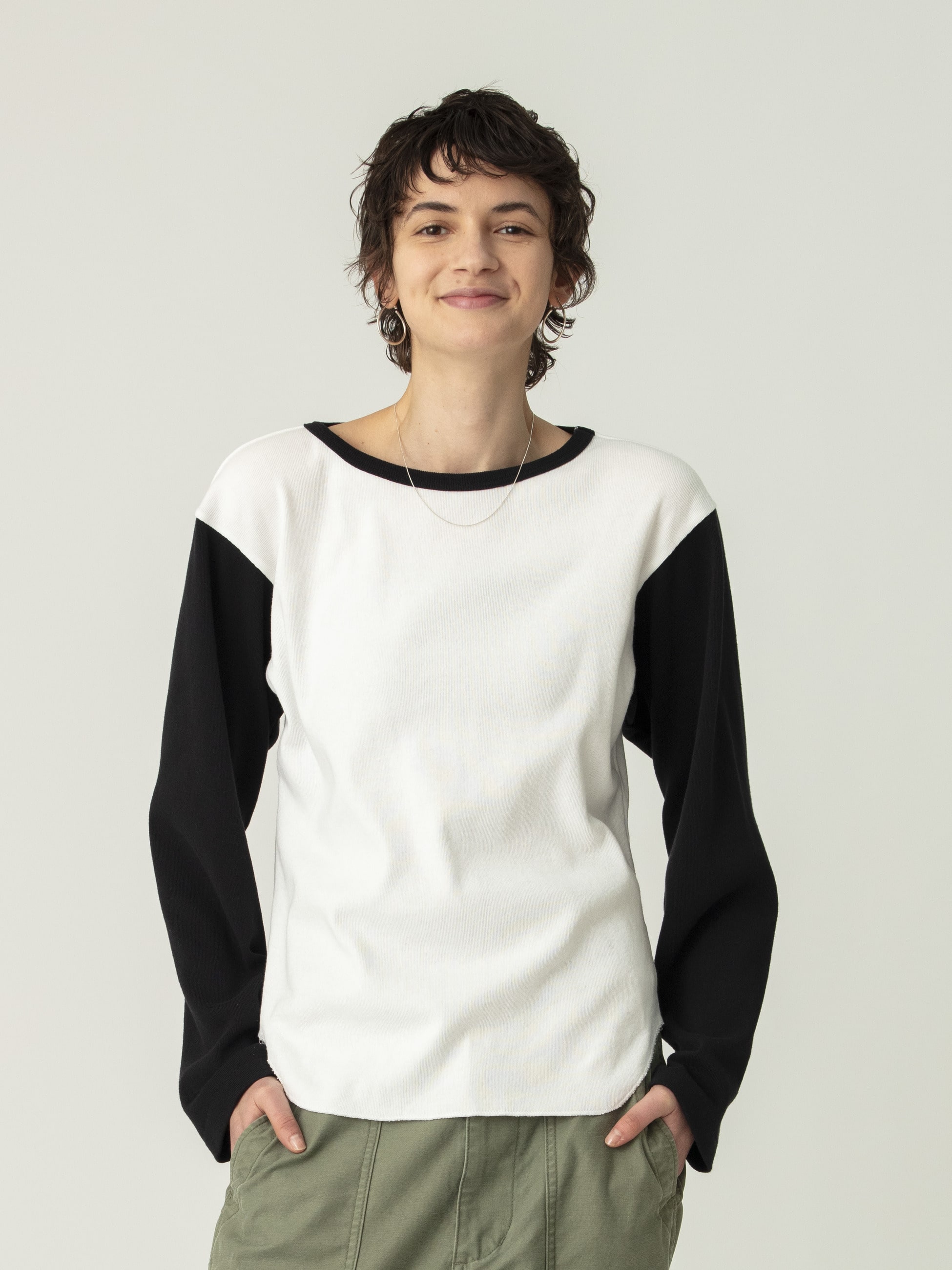 - BOWWOWとのコラボレーション企画第二弾となる、リブカットソーが登場です。コレクション展開のあるデザインをベースに、袖丈を調整しユニセックスで着用できるXSサイズをセレクト。ホワイトのボディにブルー、ブラックの配色スリーブが映えるデザインで、すっきりと開いたネックラインと程よくリラクシーなシルエットが様になります。カジュアルなパンツスタイルはもちろん、フレアスカートにウエストインしたスタイリングもおすすめです。