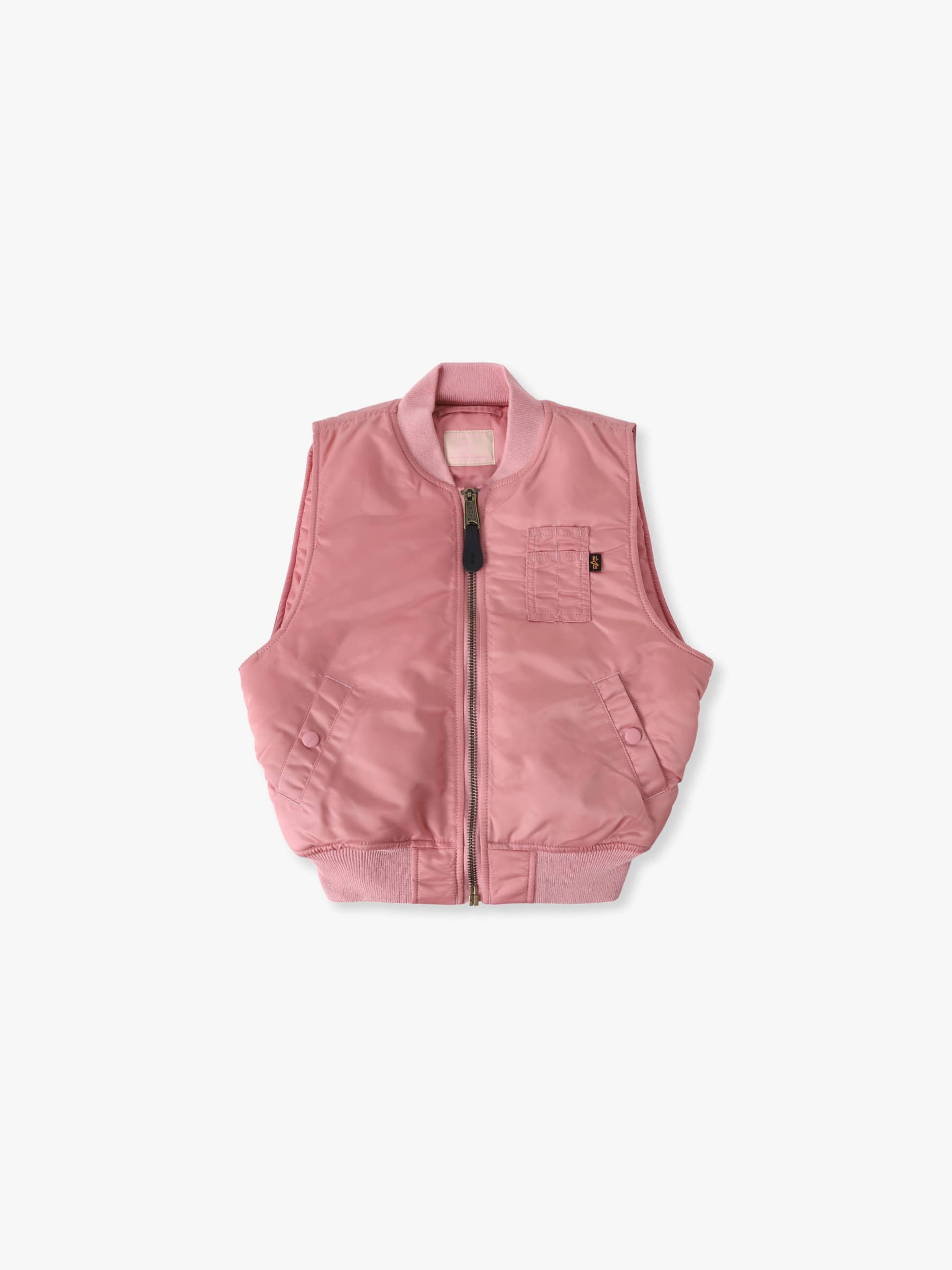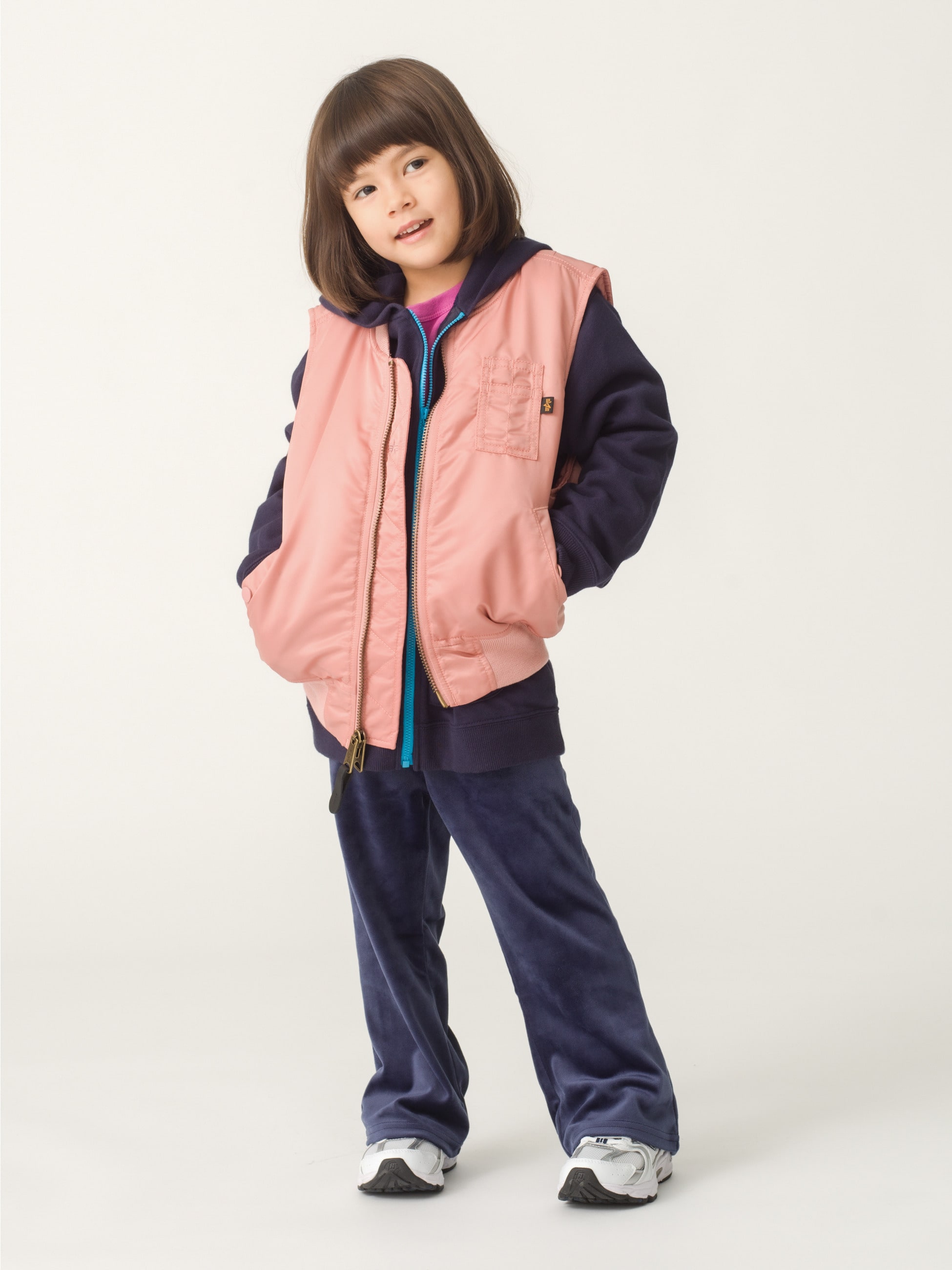 ロンハーマンキッズ別注の特別なアイテムが登場です。ALPHA社が1990年代に生産していたベストを、キッズ向けとして初めて復刻しました。軽やかな中綿入りで、ふんわりとしたバルーンシルエットが魅力。素材には、ALPHA社オリジナルの「FLIGHT NYLON」を使用しており、高密度でほどよい光沢とハリ感が特徴です。 カラーは、ベーシックで王道のブラックと、可愛らしさの中にかっこよさも感じさせるピンクの2色展開です。他にはないスペシャルなアイテムを是非お楽しみください。