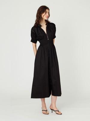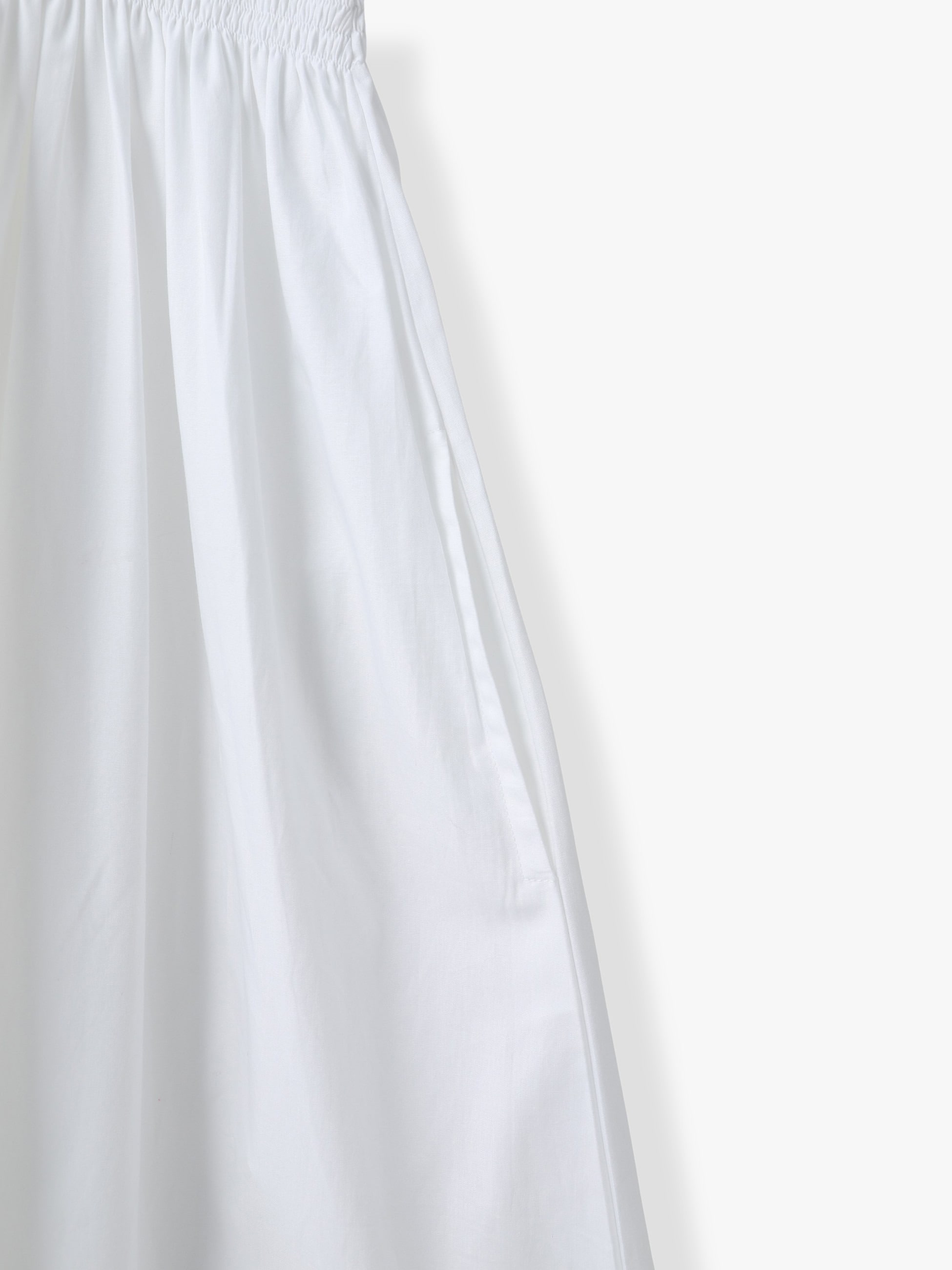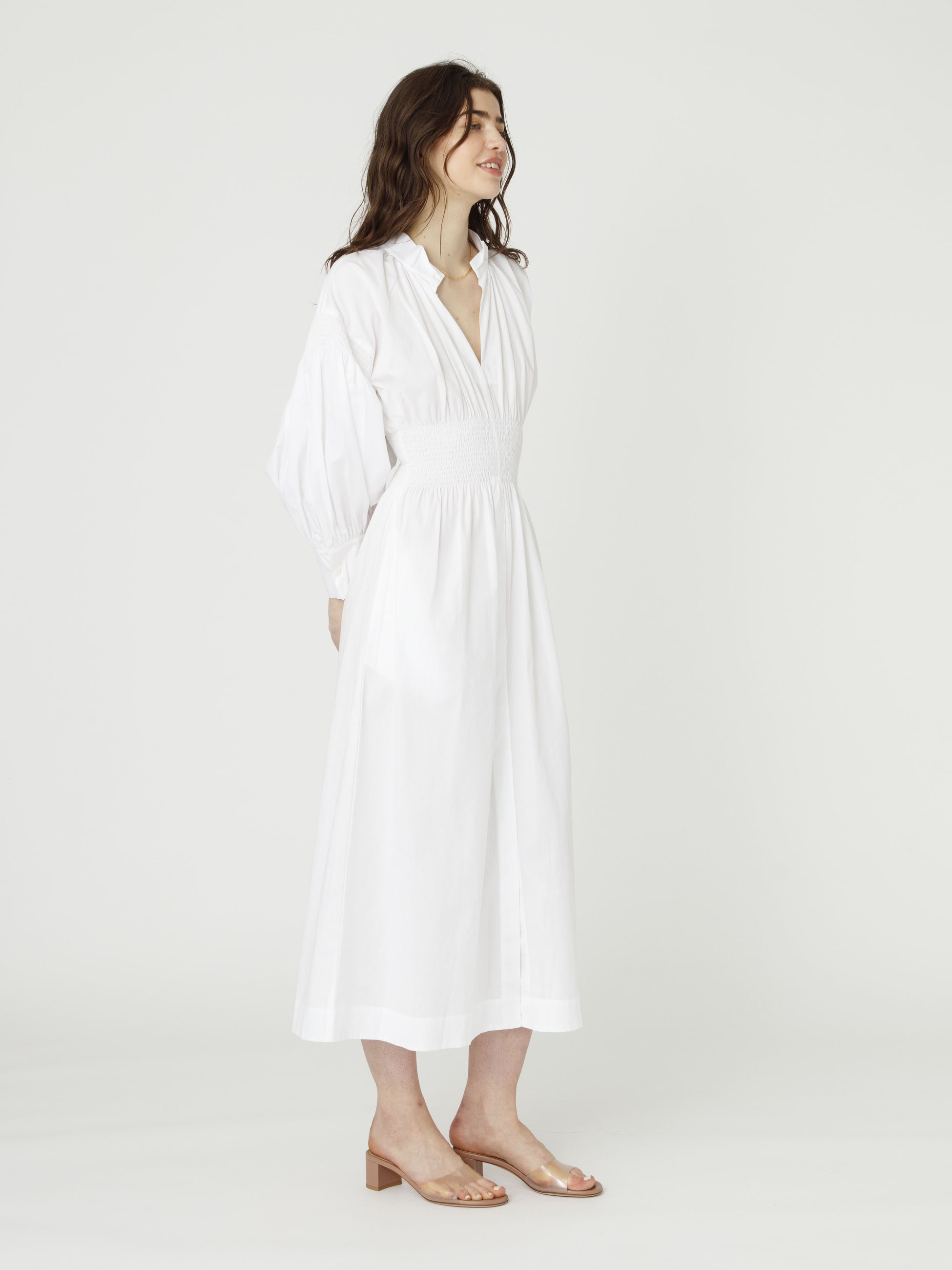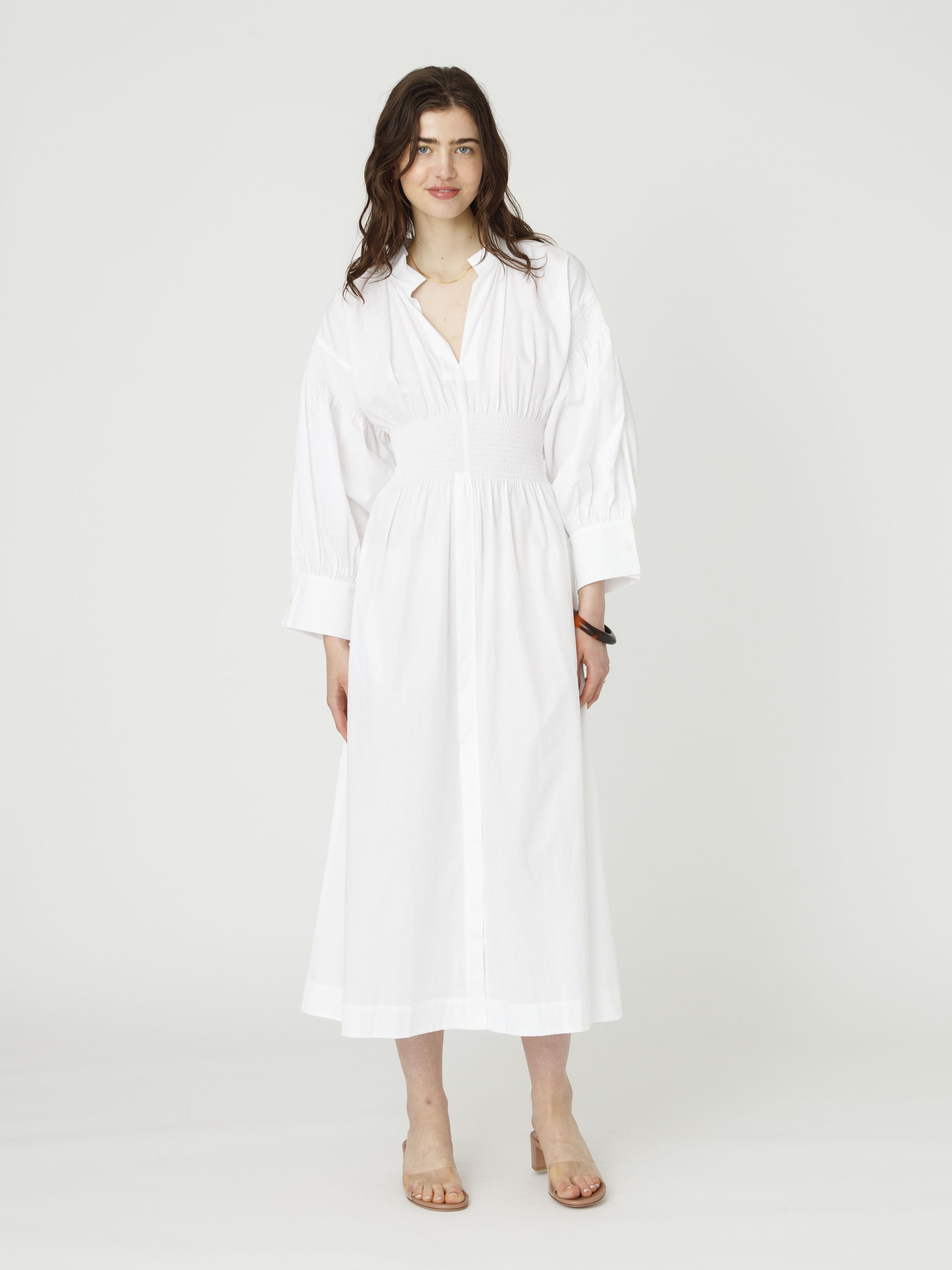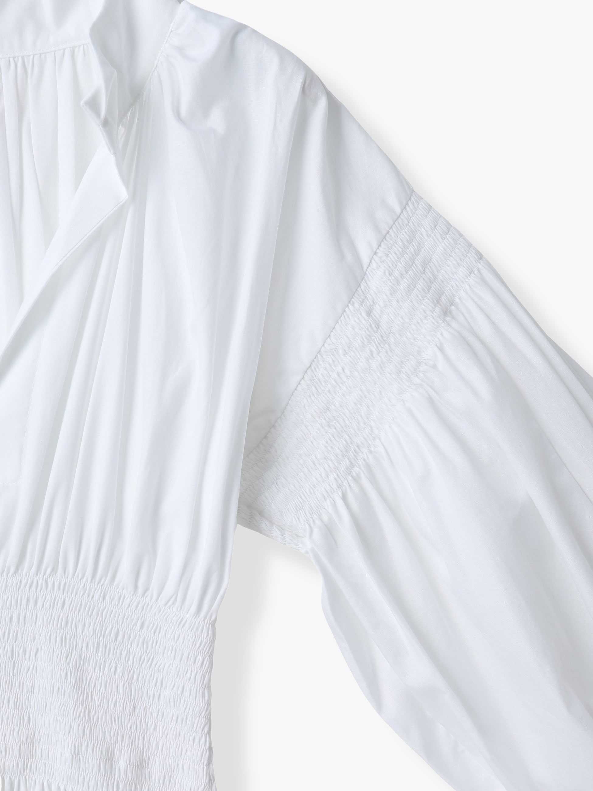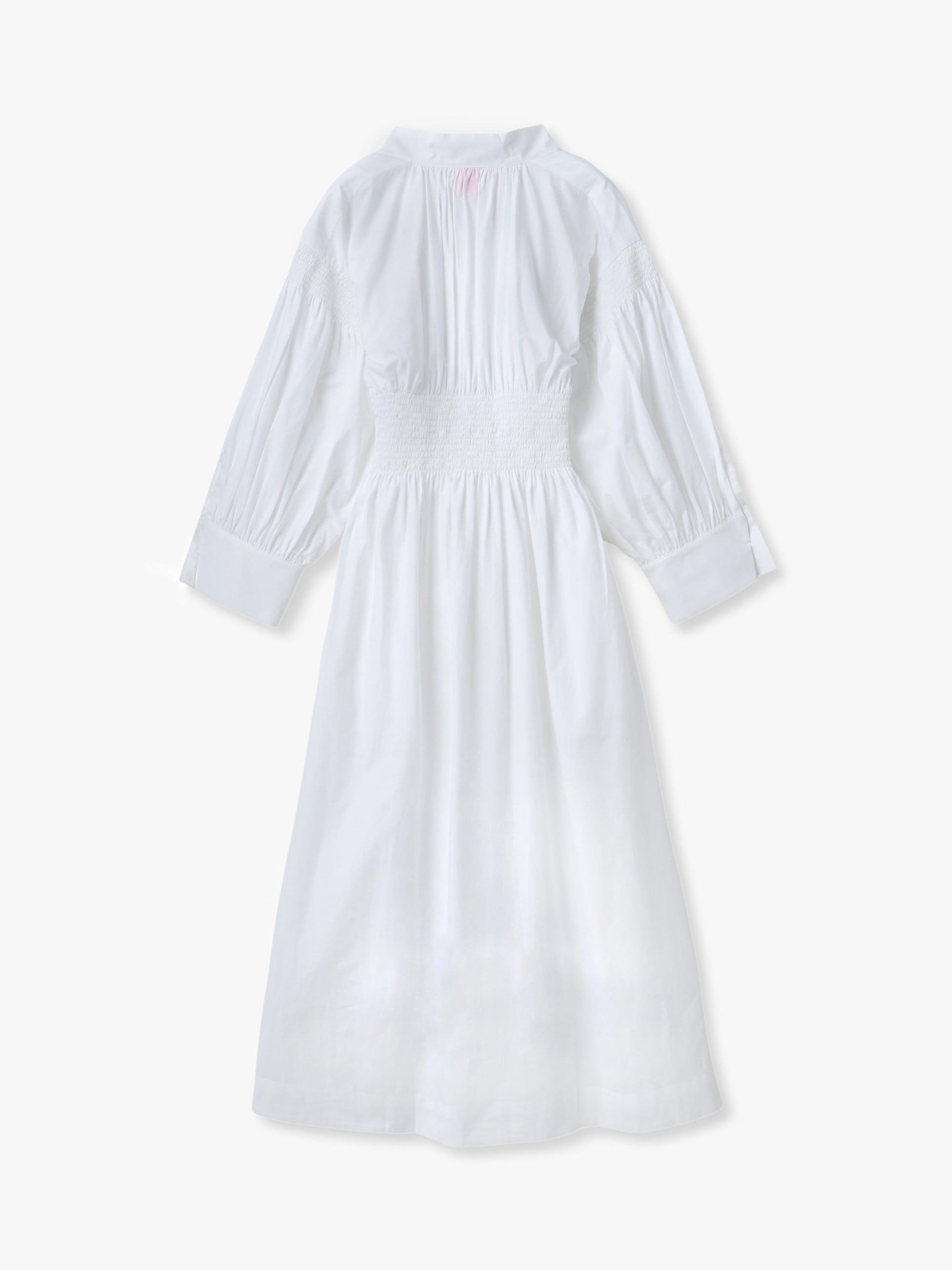 スモッキング刺繍が特徴のロングスリーブドレスを、ロンハーマンで別注しました。軽やかなコットン100%の素材を使用し、ゆったりとした着心地で、優美な雰囲気を醸します。オープンカラーが首元を美しく引き立て、ボリューム感のあるスリーブは可憐さとエレガントさを兼ね備え、1枚で様になります。