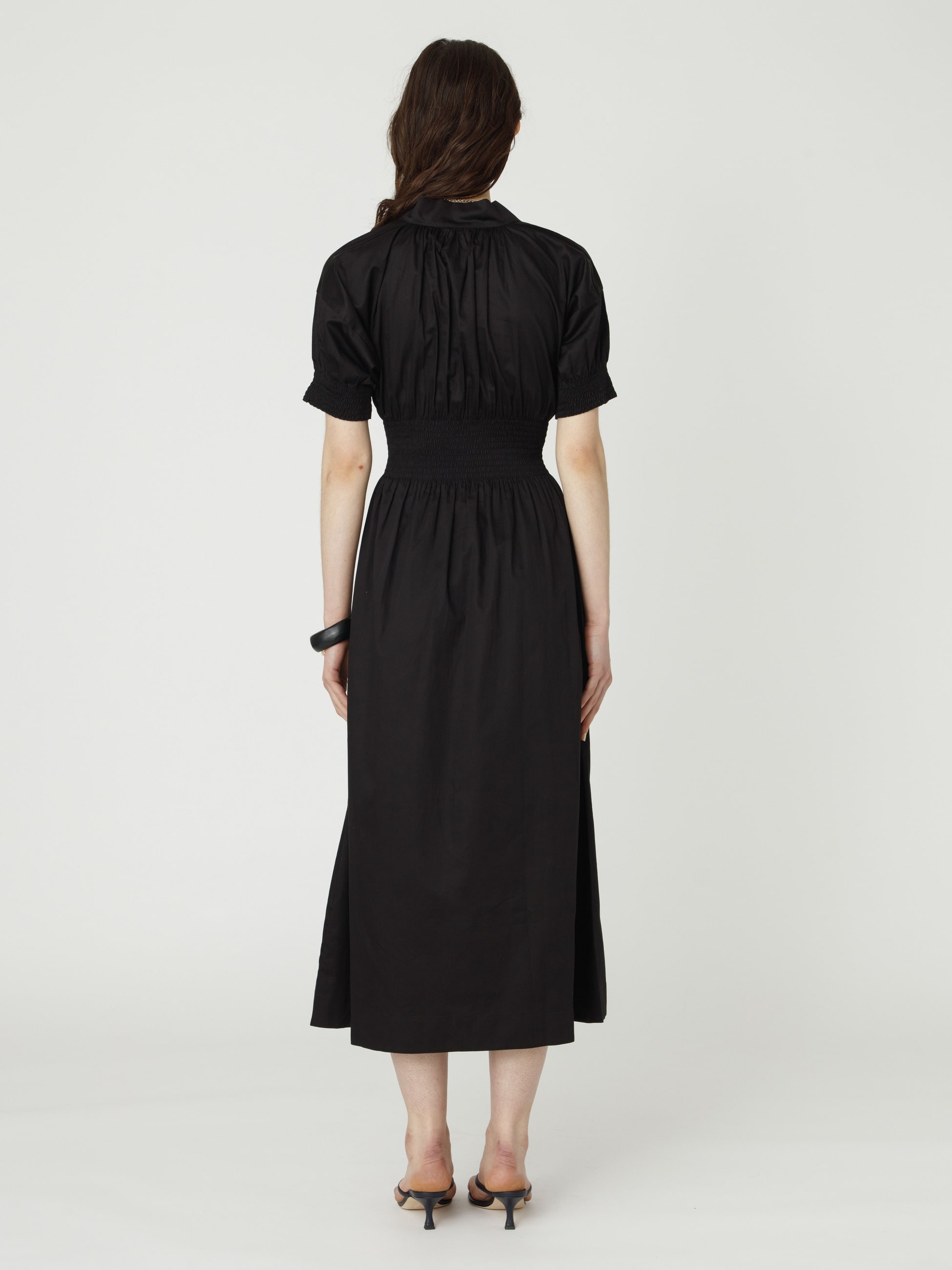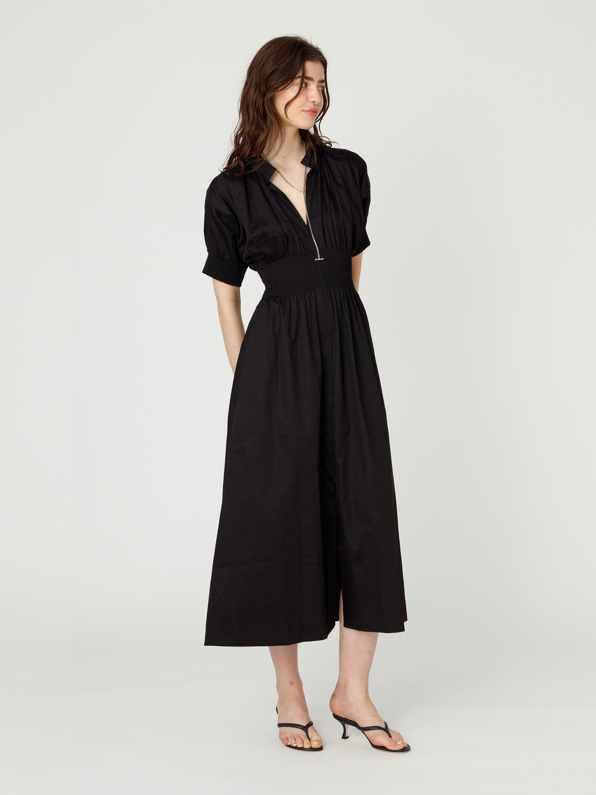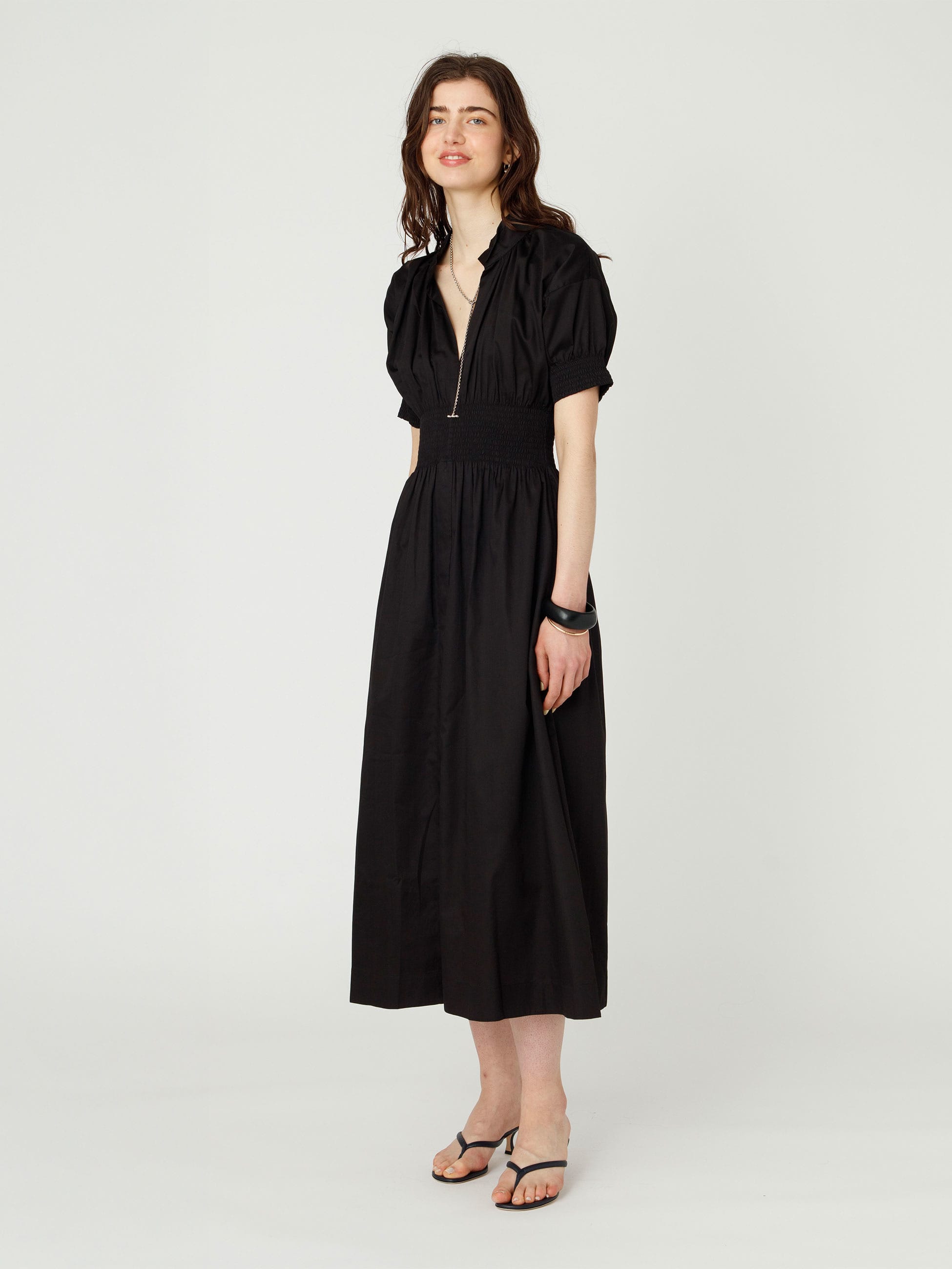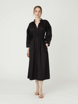 スモッキング刺繍が特徴のショートスリーブドレスを、ロンハーマンで別注しました。軽やかなコットン100%の素材を使用し、ゆったりとした着心地で、優美な雰囲気を醸します。オープンカラーが首元を美しく引き立て、ボリューム感のあるスリーブは可憐さとエレガントさを兼ね備え、1枚で様になります。